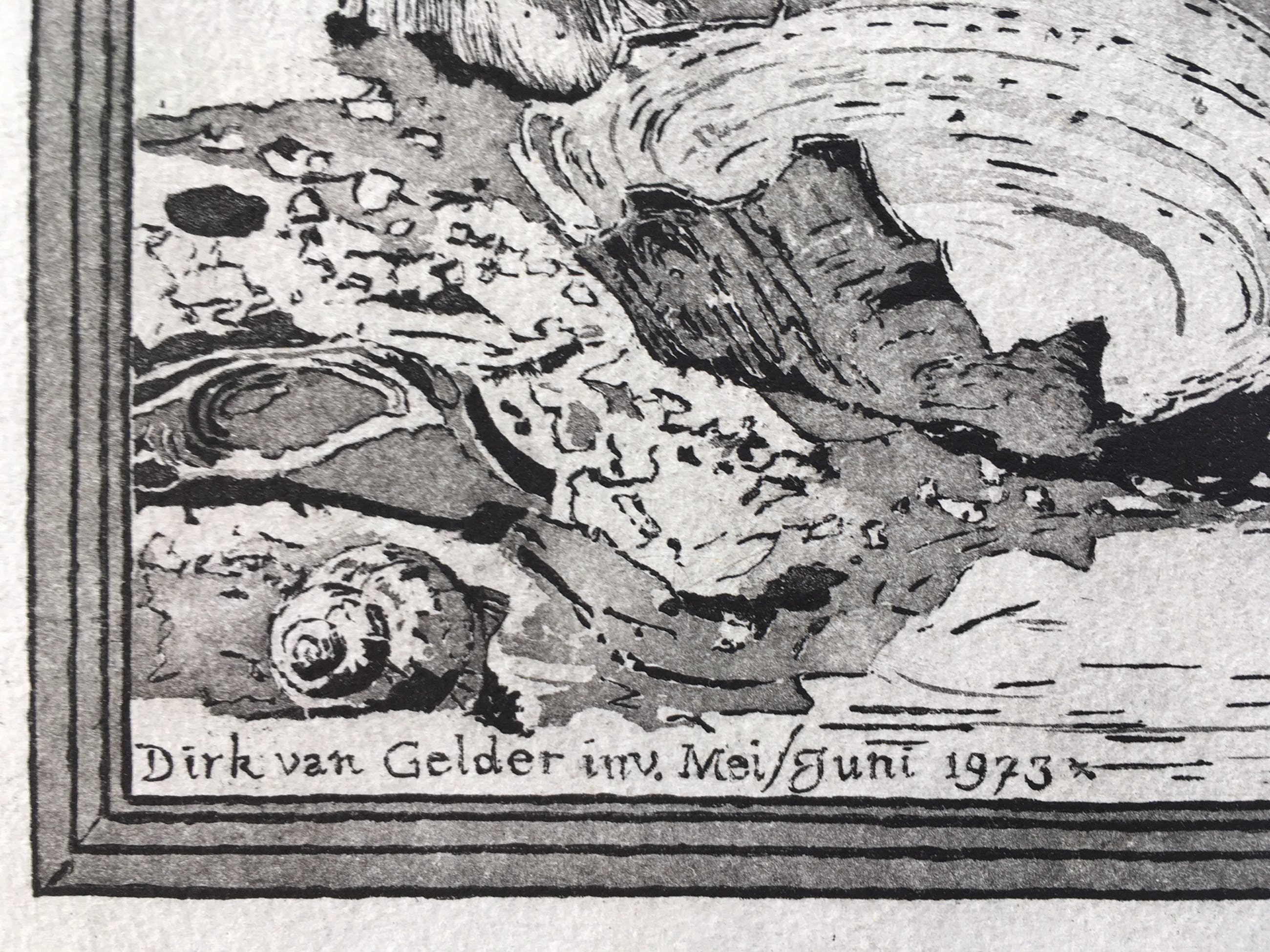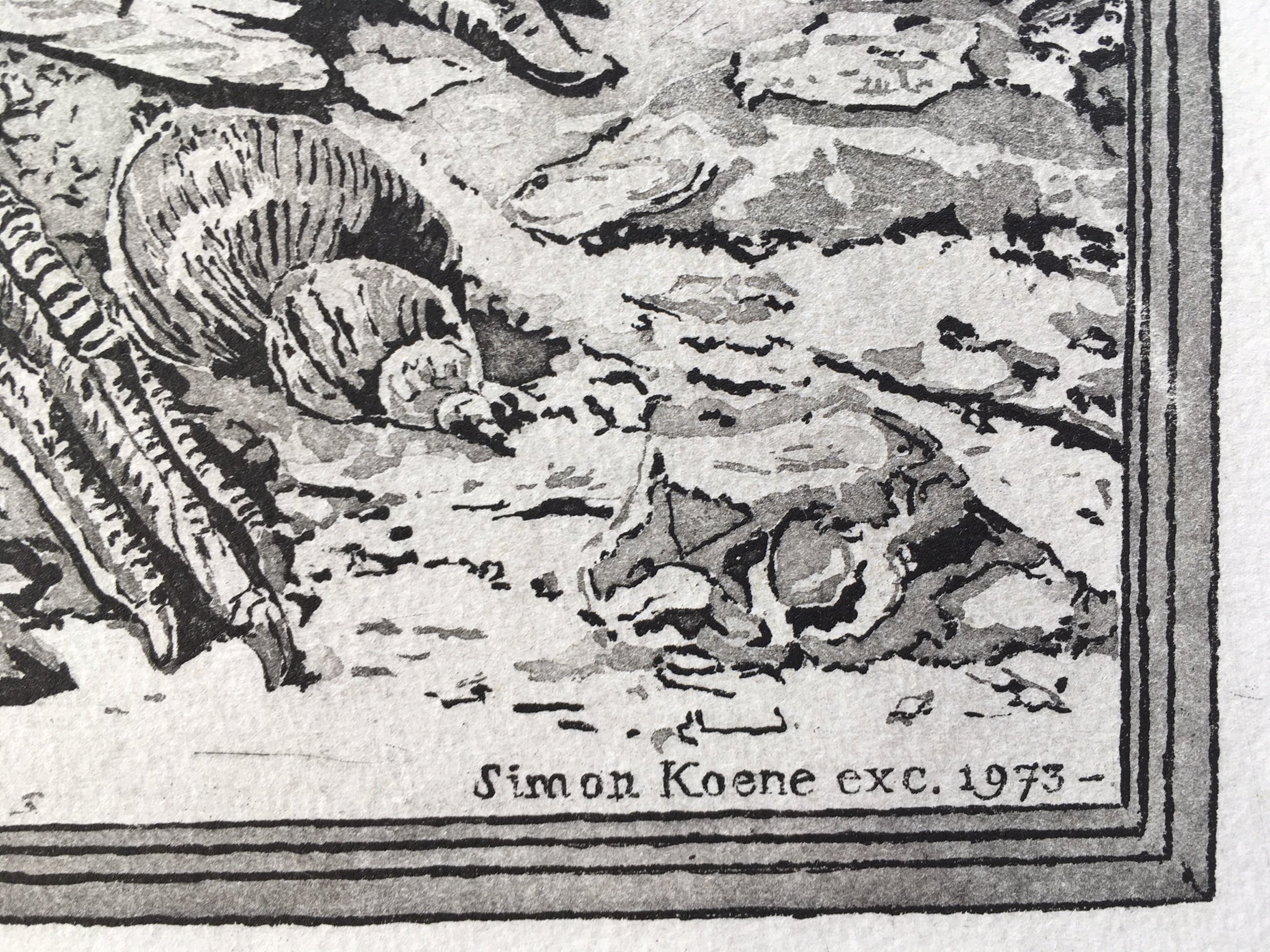 Ets van een dode wulp naar een ontwerp van Dirk van Gelder. In 1973 tentoongesteld in het Gemeentemuseum in Arnhem. Rechtsonder in de etsplaat gesigneerd: Simon Koene exc. 1973. Linksonder in de etsplaat gesigneerd: Dirk van Gelder inv. mei/juni 1973. Rechtsonder met potlood gesigneerd: Simon Koene 1973.