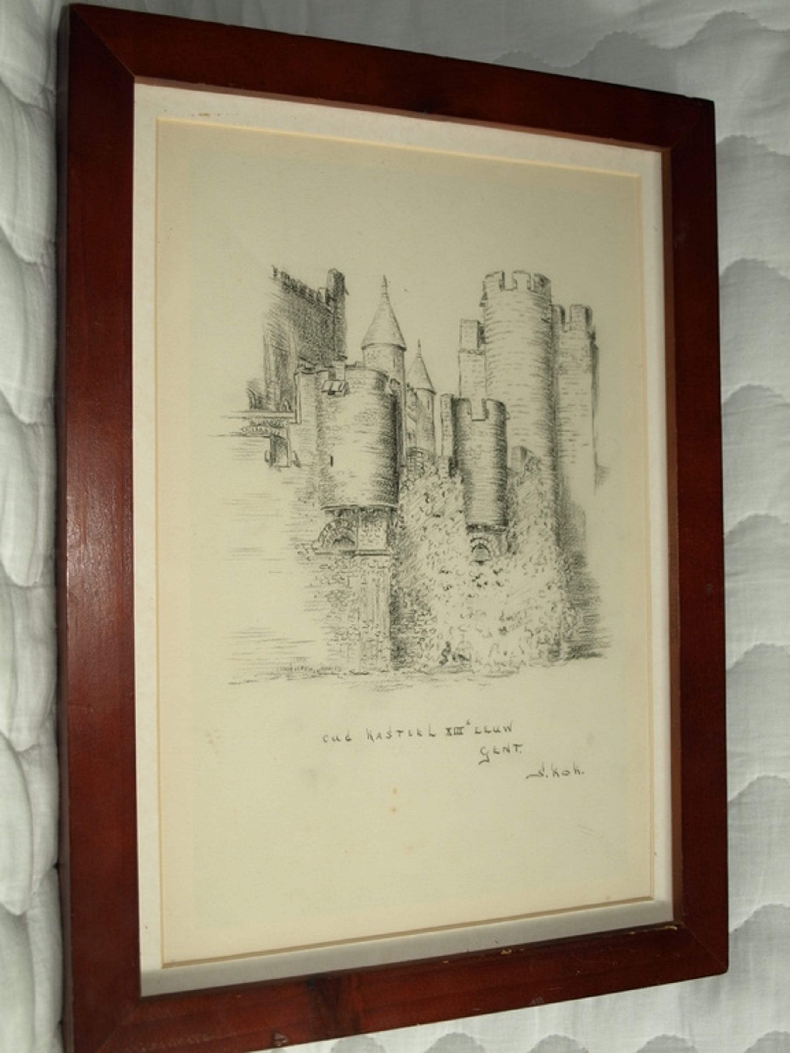 Een tekening van de Loosdrechtse kunstenaar Simon Kok. Gemaakt tijdens zijn verblijf in Gent (België). Gesigneerd en ingelijst (33 x 24 cm).