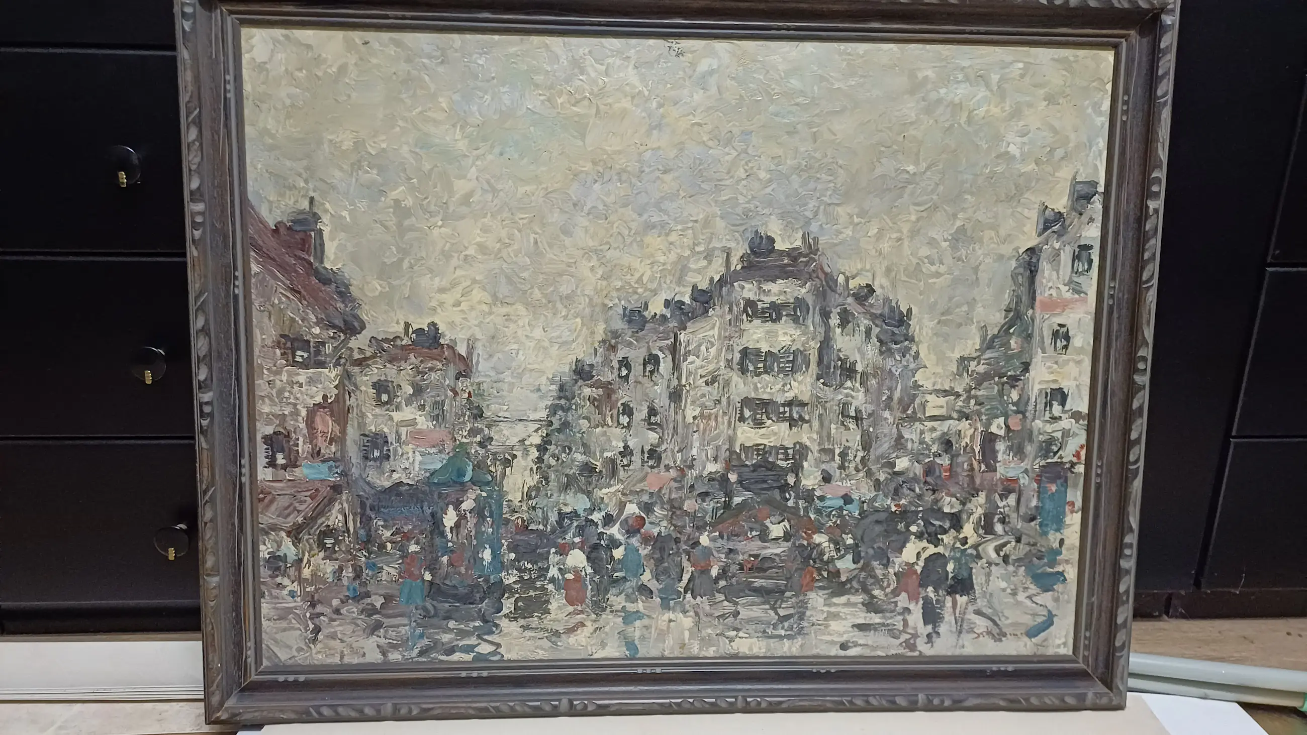 Prachtig impressionistisch schilderij van de bekende Amsterdamse kunstenaar Simon Kramer, Dit Parijse stadsgezicht met passanten is een aanwinst voor de liefhebber