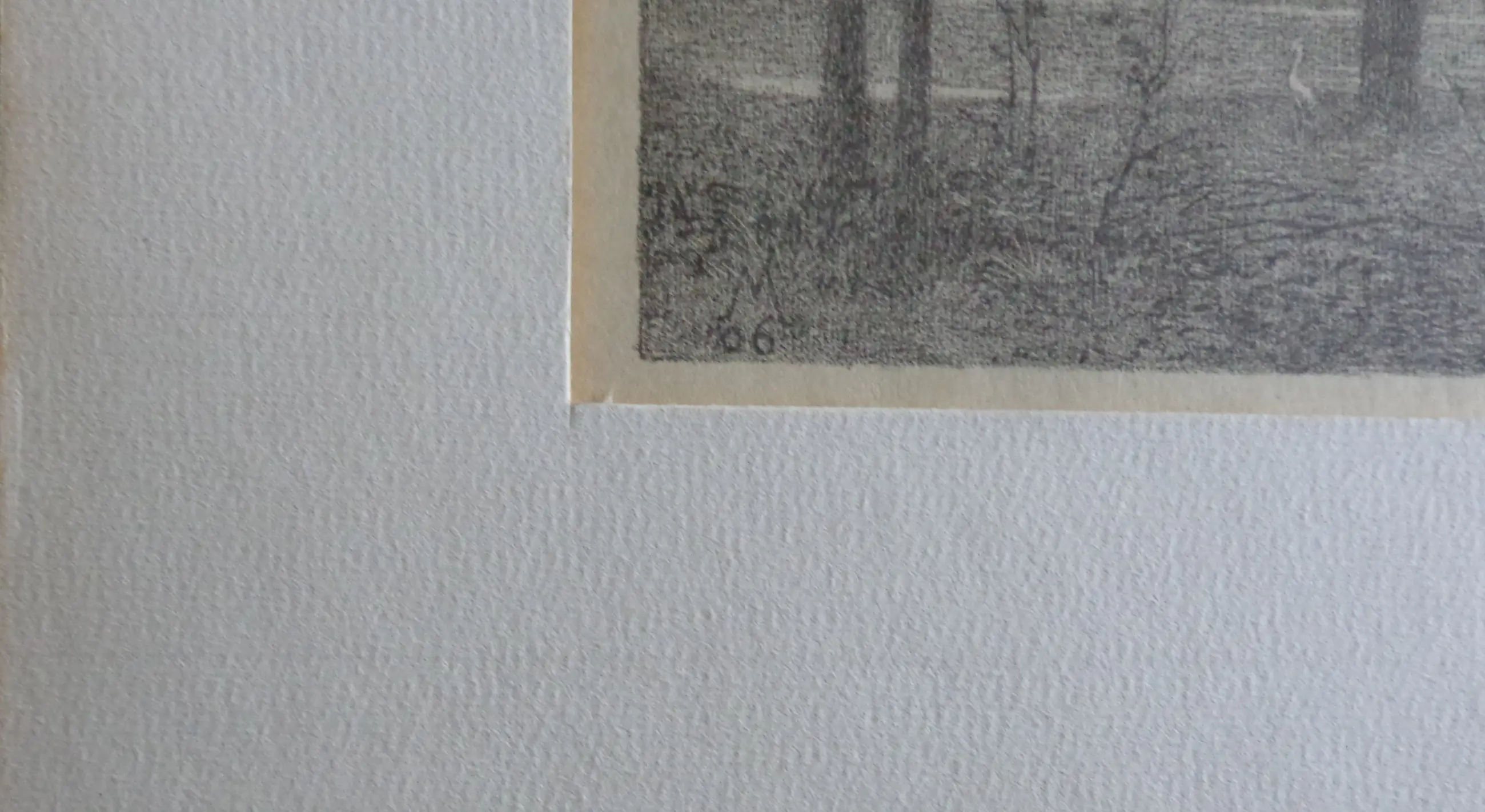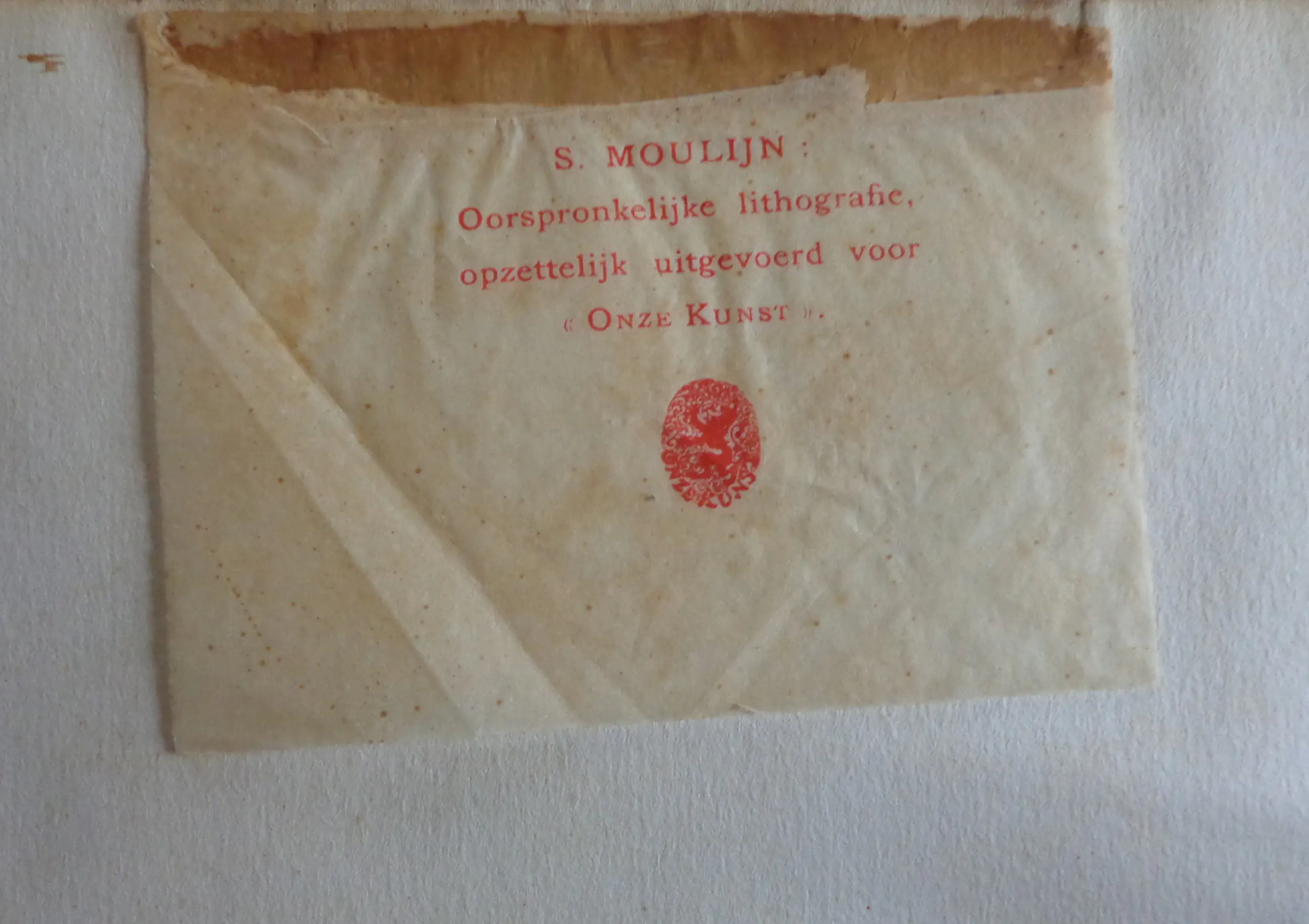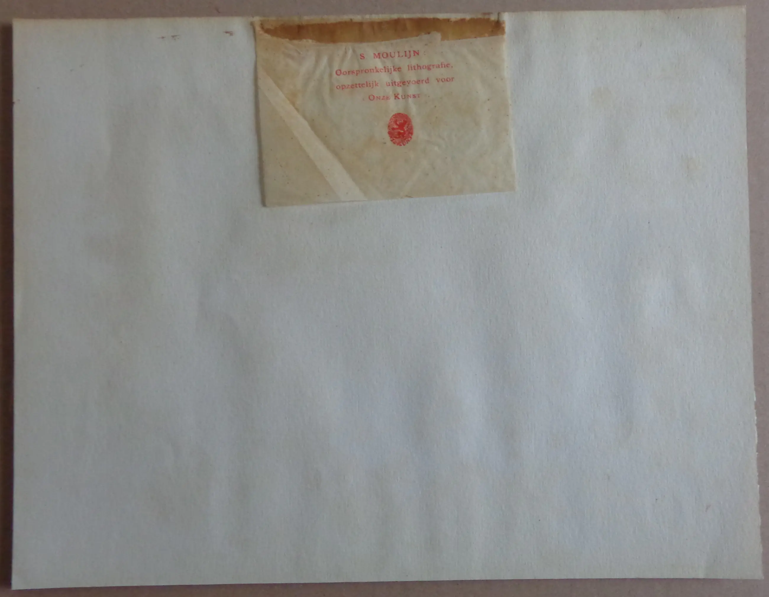Simon Moulijn (1866-1948). Bomen naast de rivier. Zwart-wit lithografie op papier. Monogram in de plaat. Geen nummering. 1906 in de plaat. Verso label "Onze Kunst" (Oorspronkelijke lithografie opzettelijk uitgevoerd voor Onze Kunst". Blad: 14x20cm. Gemonteerd onder passe-partout: 22x29cm. Goede staat. Passe-partout gebruind.