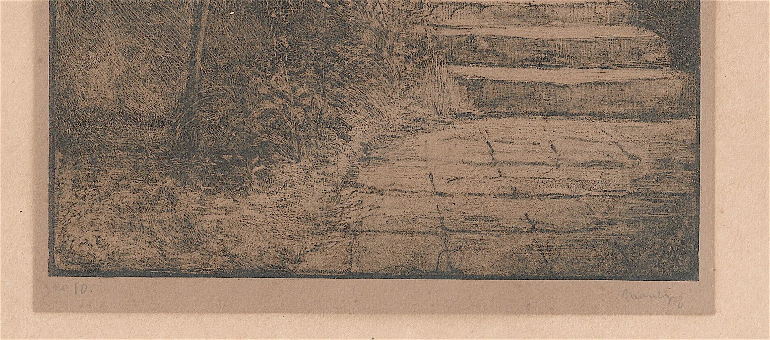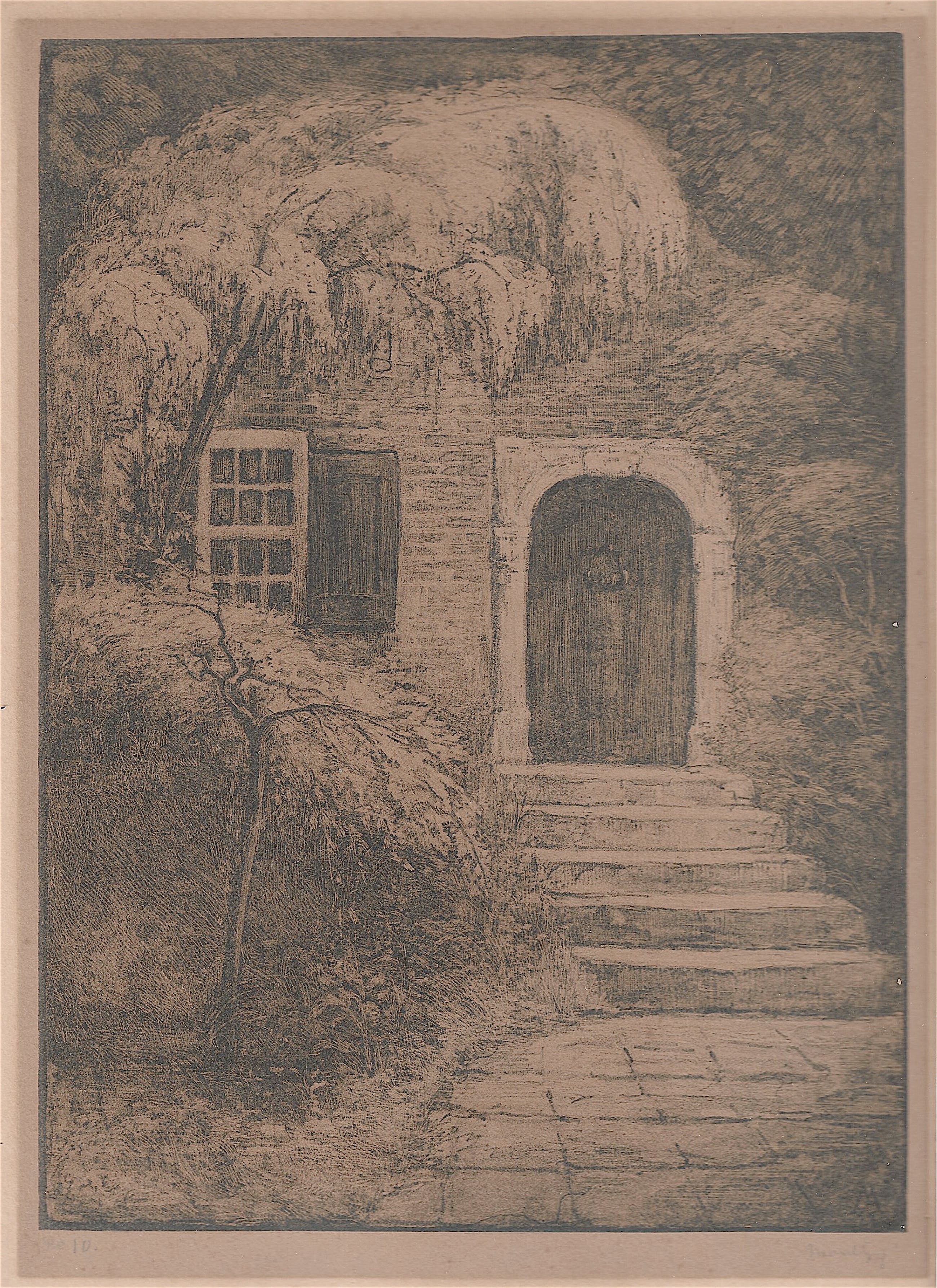 Met de identificatie RP-P-1926-527 stond daar: Deur met stenen trap / Het achterdeurtje (originele titel) - Links staan twee bomen voor een raam met open luiken. Simon Moulijn (eigenhandig gesigneerd - potlood - rechtsonder). Datering: 1917. Nummering: potlood - linksonder - 11 [deze afdruk heeft 10]. Materiaal: papier - licht beige.