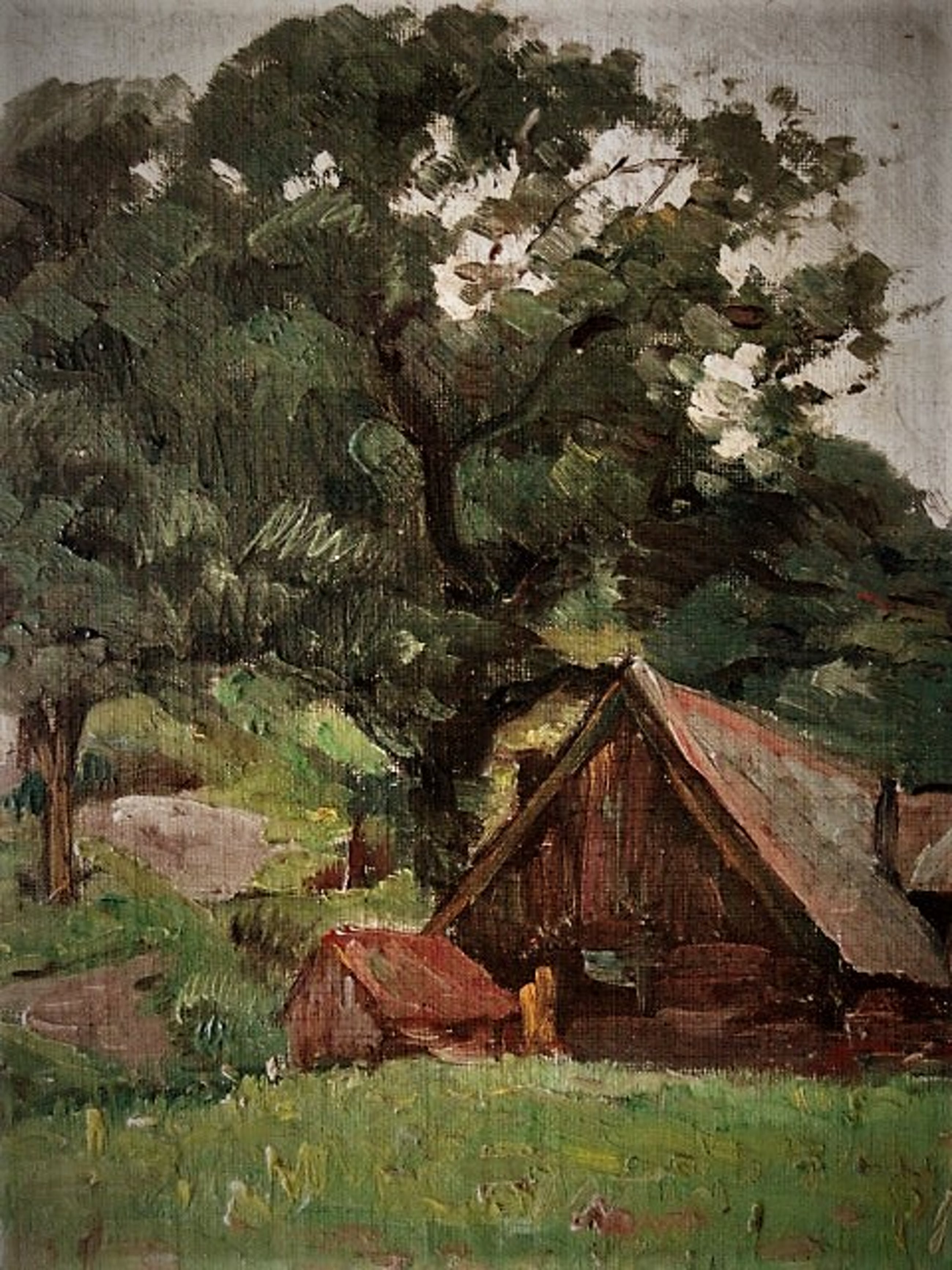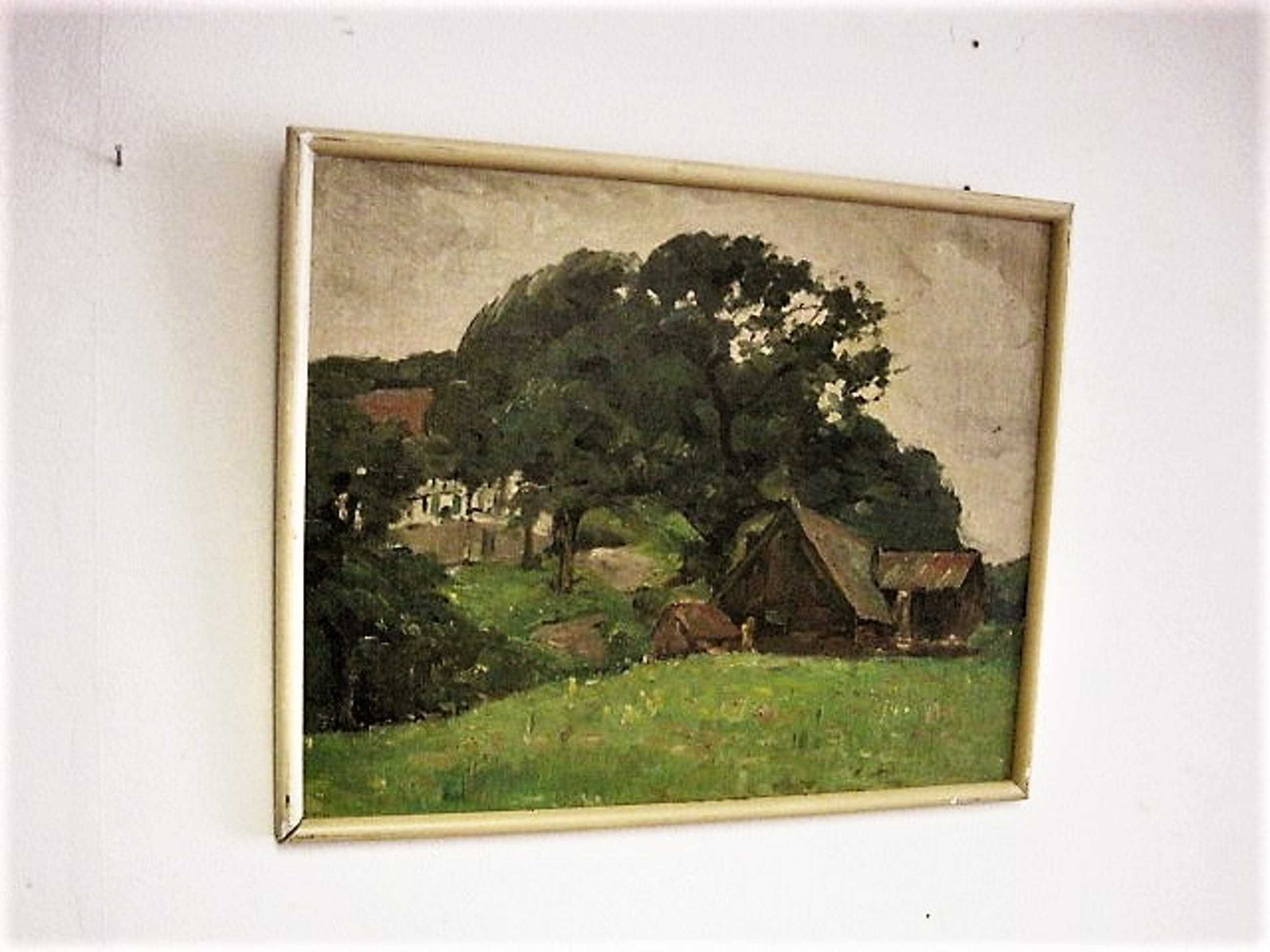 Zeldzaam, door simon Moulijn omstreeks 1890 geschilderd post impressionistisch olieverf op paneel schilderij met voorstelling van een boerderij in Drents landschap. In deze periode werd Moulijn nog sterk beinvloedt door oa. Jan Toorop en Vincent van Gogh. Later zou hij veel gestileerder gaan werken. Op achterzijde voorzien van het atelierstempel. Verkeert in goede conditie.
