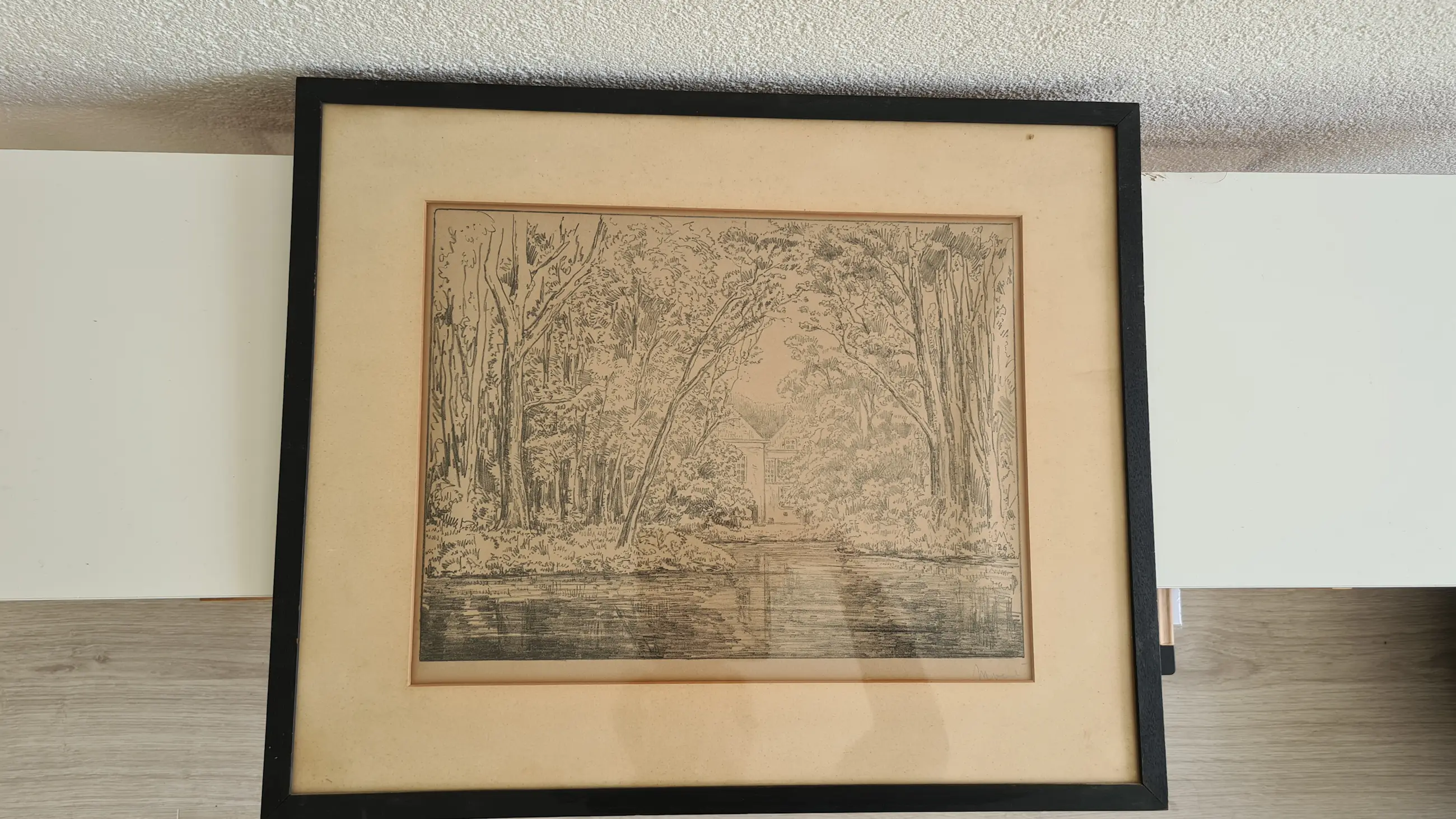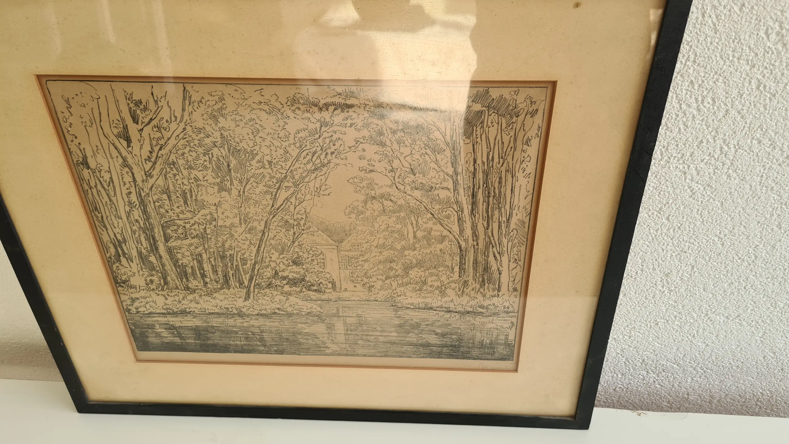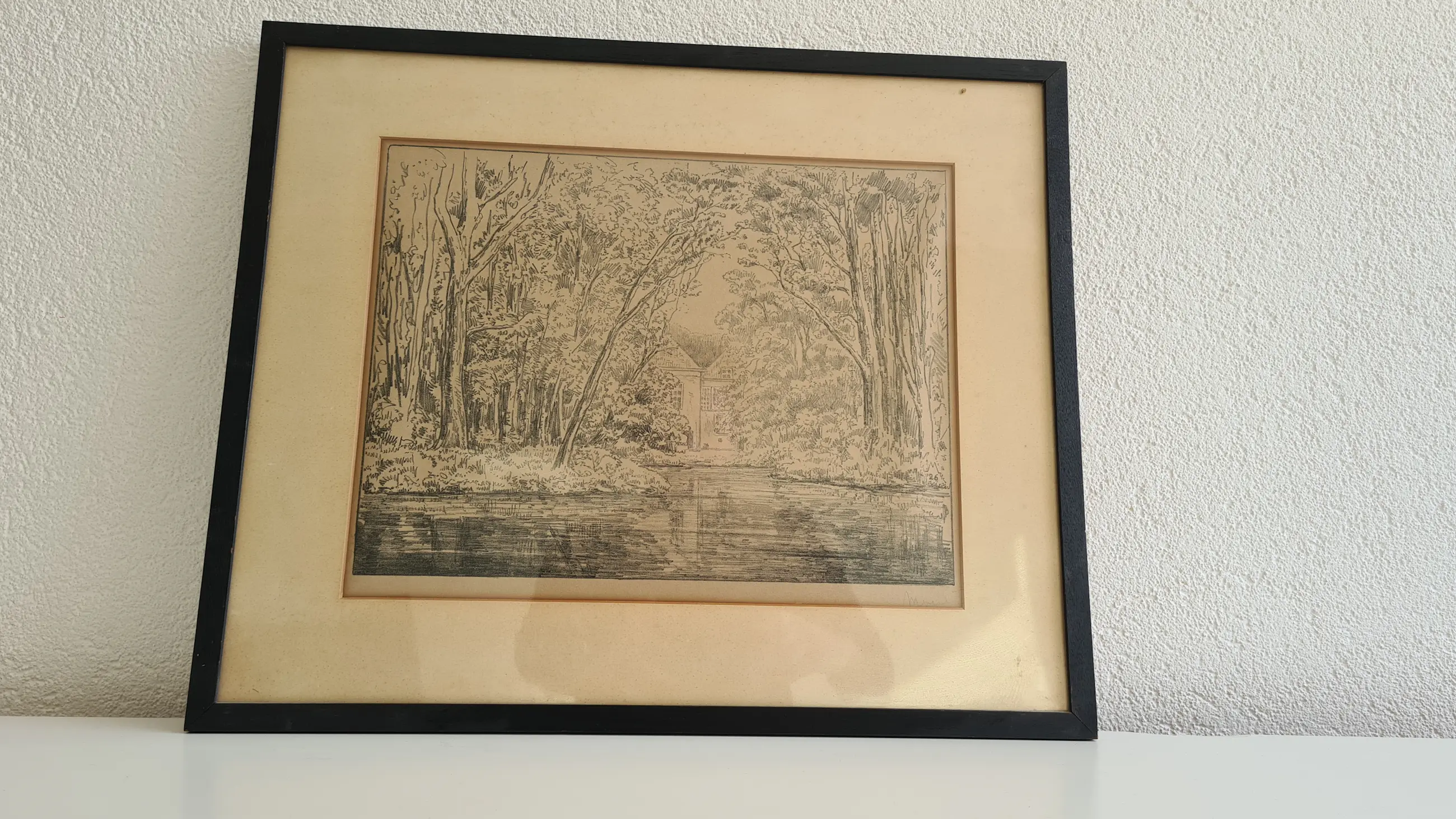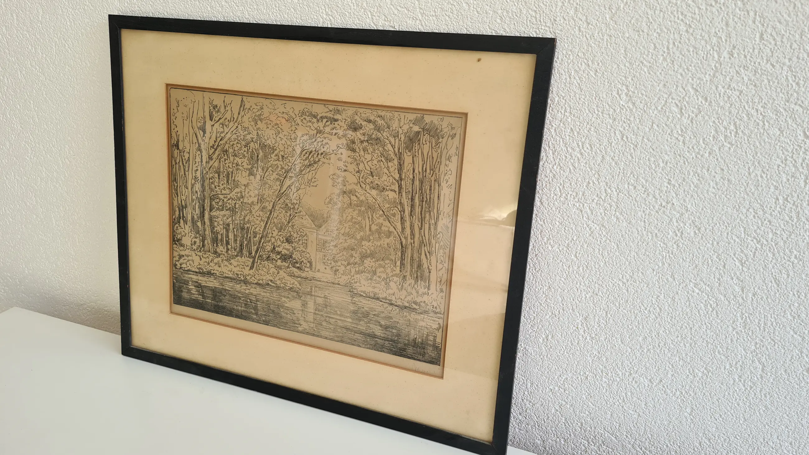 Originele ets van Simon Moulijn (1866–1948). Rustig boslandschap met waterpartij en een huis op de achtergrond. Fijne lijnvoering en typisch Nederlandse sfeer. Gesigneerd rechtsonder in de plaat. Ingelijst achter glas met passe-partout. Afmetingen inclusief lijst: ca. 50 × 42 cm (inschatting). Conditie: goede staat gezien de leeftijd. Lichte verkleuring en vlekjes in passe-partout en papier. Geen zichtbare scheuren in de ets zelf. Lijst met lichte gebruikssporen. Zie foto’s.