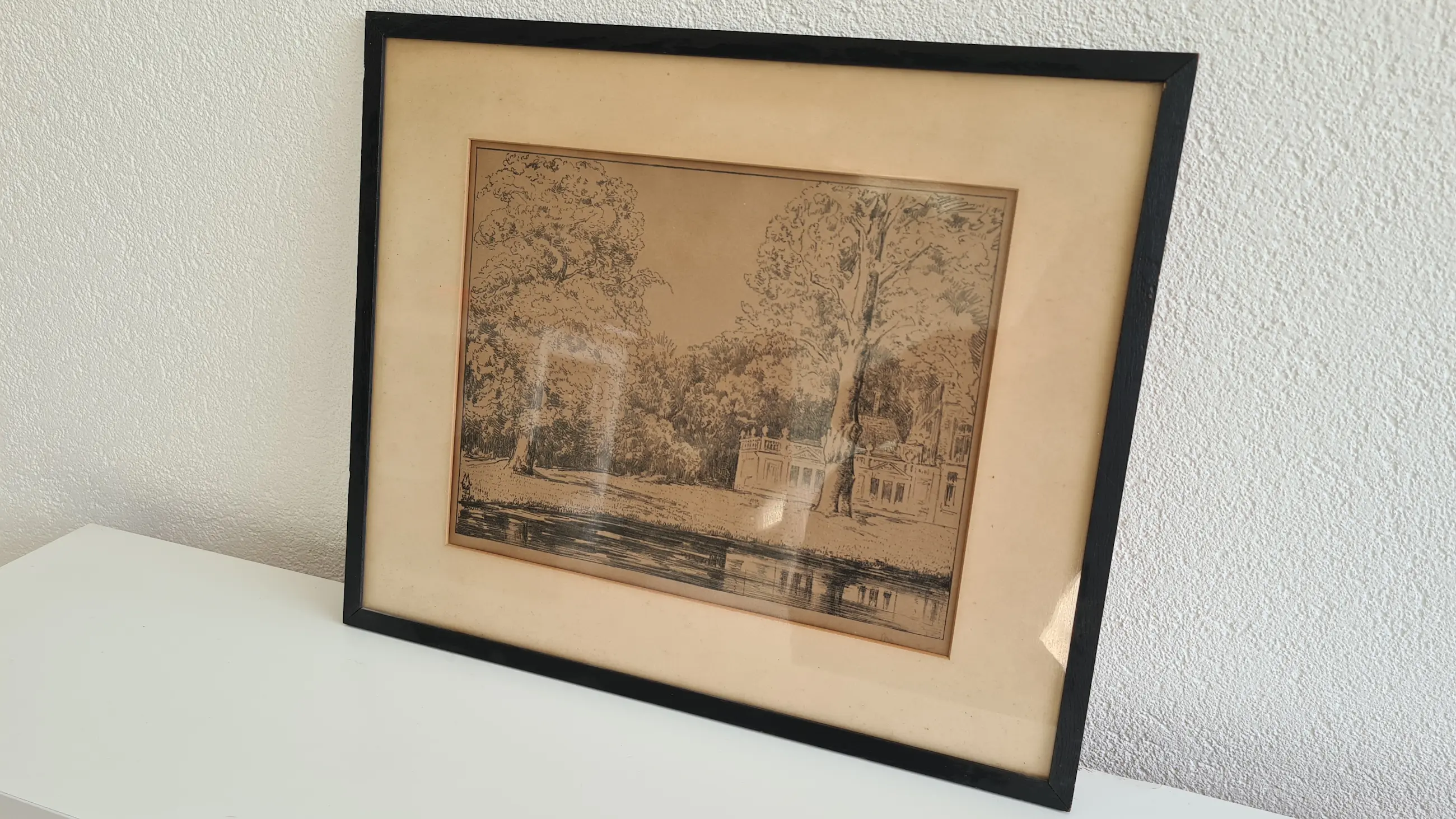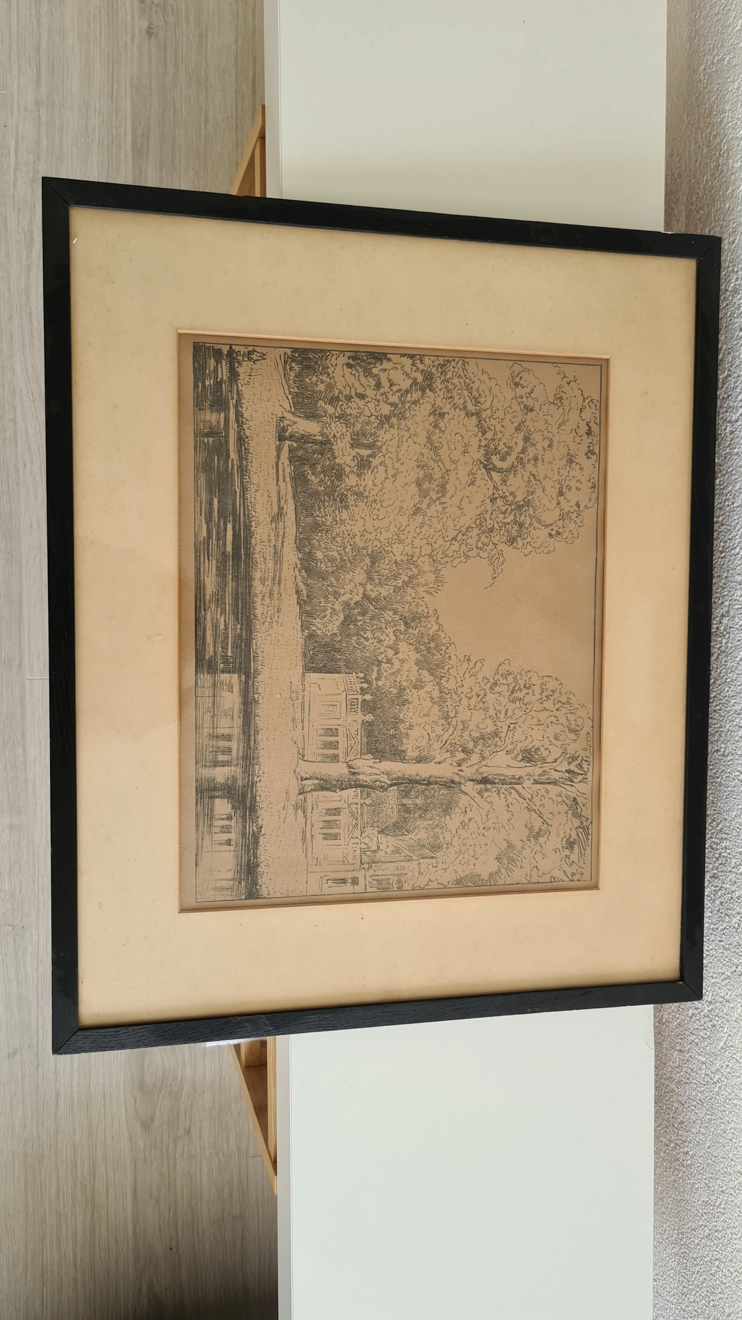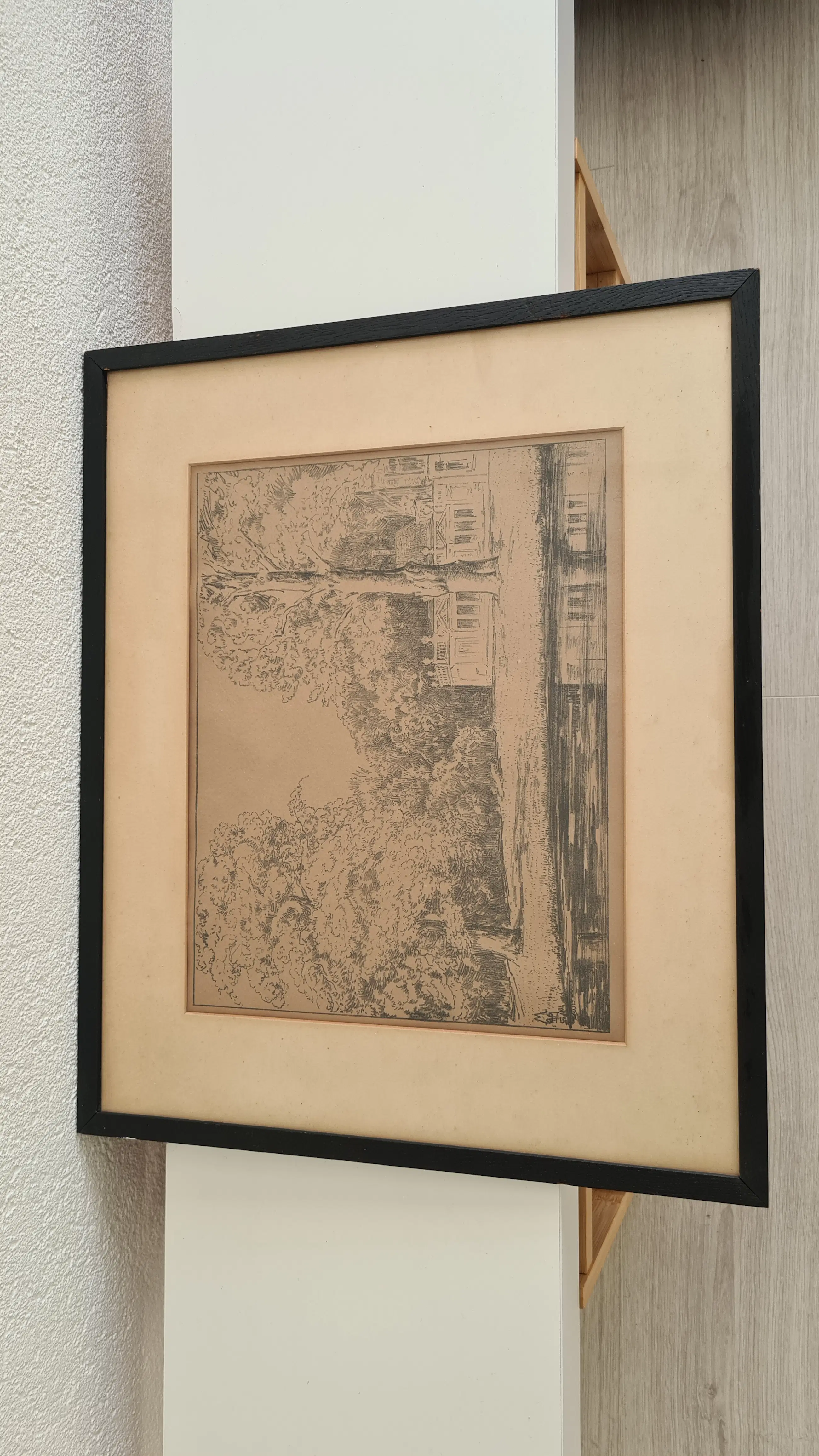 Originele ets van Simon Moulijn (1866–1948). Voorstelling van een landhuis aan het water, omringd door bomen. Mooie reflectie in het water en fijne lijnvoering. Gesigneerd rechtsonder in de plaat. Ingelijst achter glas met passe-partout. Afmetingen inclusief lijst: ca. 50 × 42 cm. Conditie: goede staat gezien de leeftijd. Lichte verkleuring en vlekjes in passe-partout en papier. Geen zichtbare scheuren in de ets zelf. Lijst met lichte gebruikssporen. Zie foto’s.