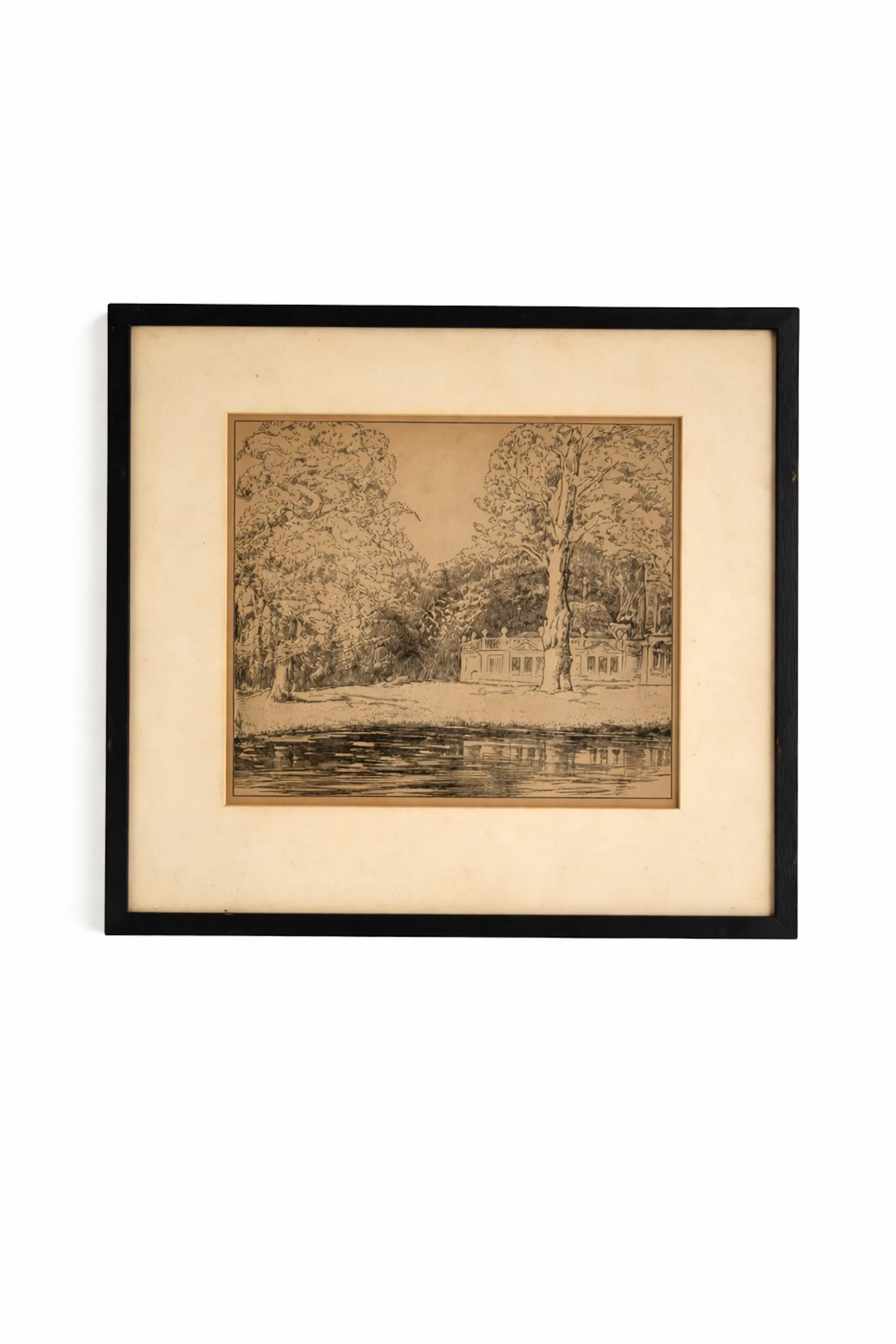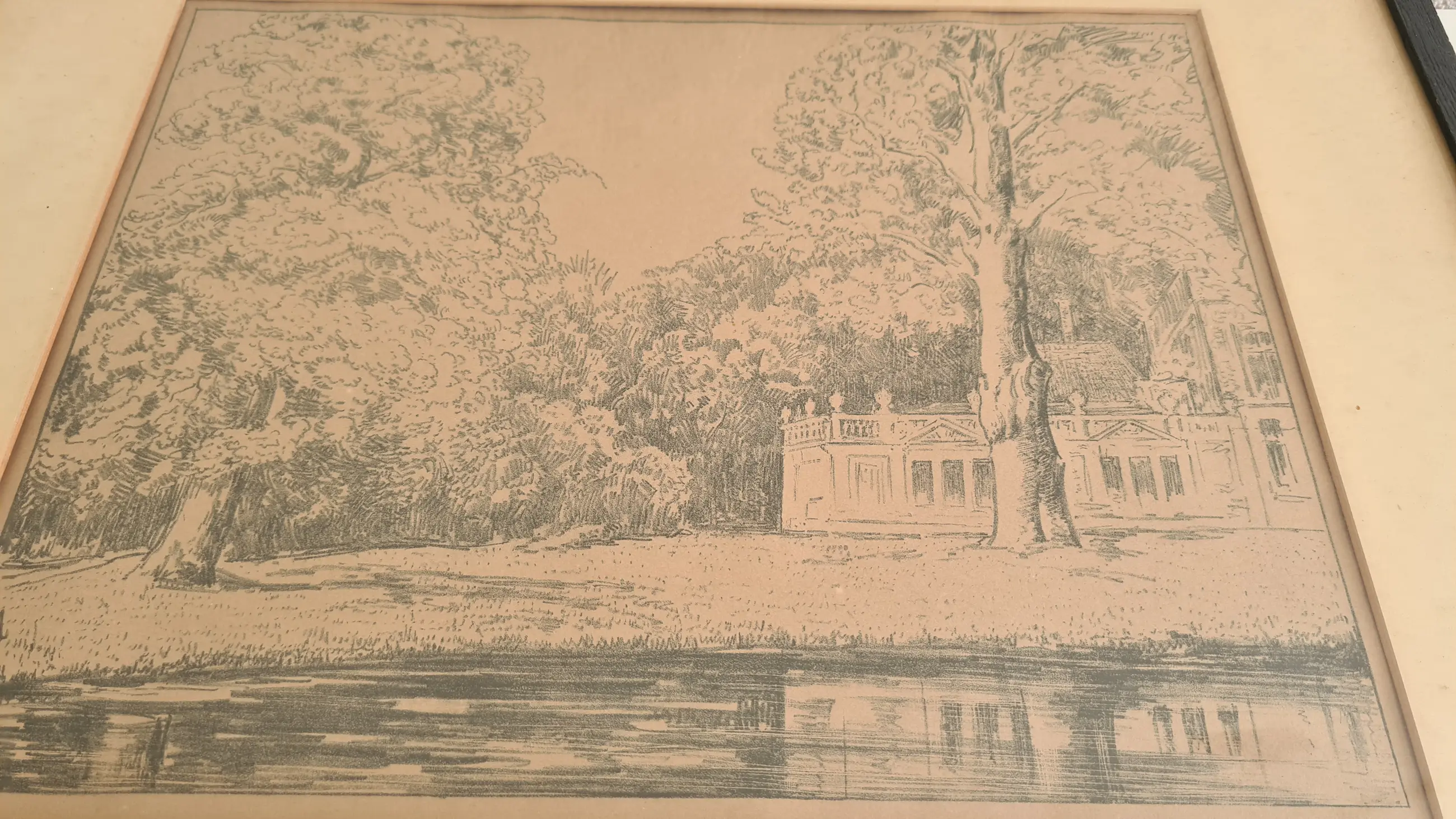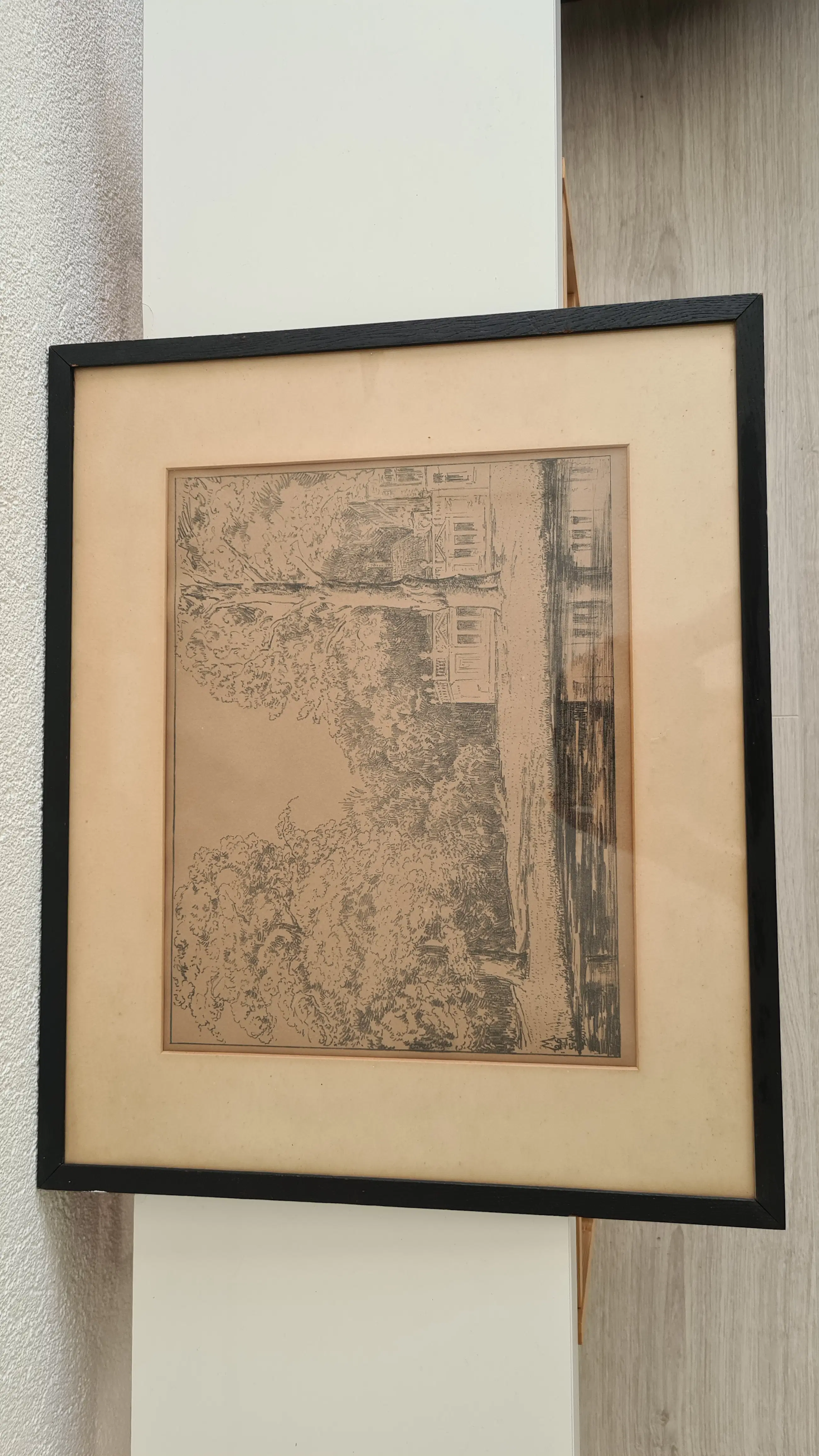 Originele ets van Simon Moulijn (1866–1948). Voorstelling van een landhuis aan het water, omringd door bomen. Mooie reflectie in het water en fijne lijnvoering. Gesigneerd rechtsonder in de plaat. Ingelijst achter glas met passe-partout. Afmetingen inclusief lijst: ca. 50 × 42 cm. Conditie: goede staat gezien de leeftijd. Lichte verkleuring en vlekjes in passe-partout en papier. Geen zichtbare scheuren in de ets zelf. Lijst met lichte gebruikssporen. Zie foto’s.