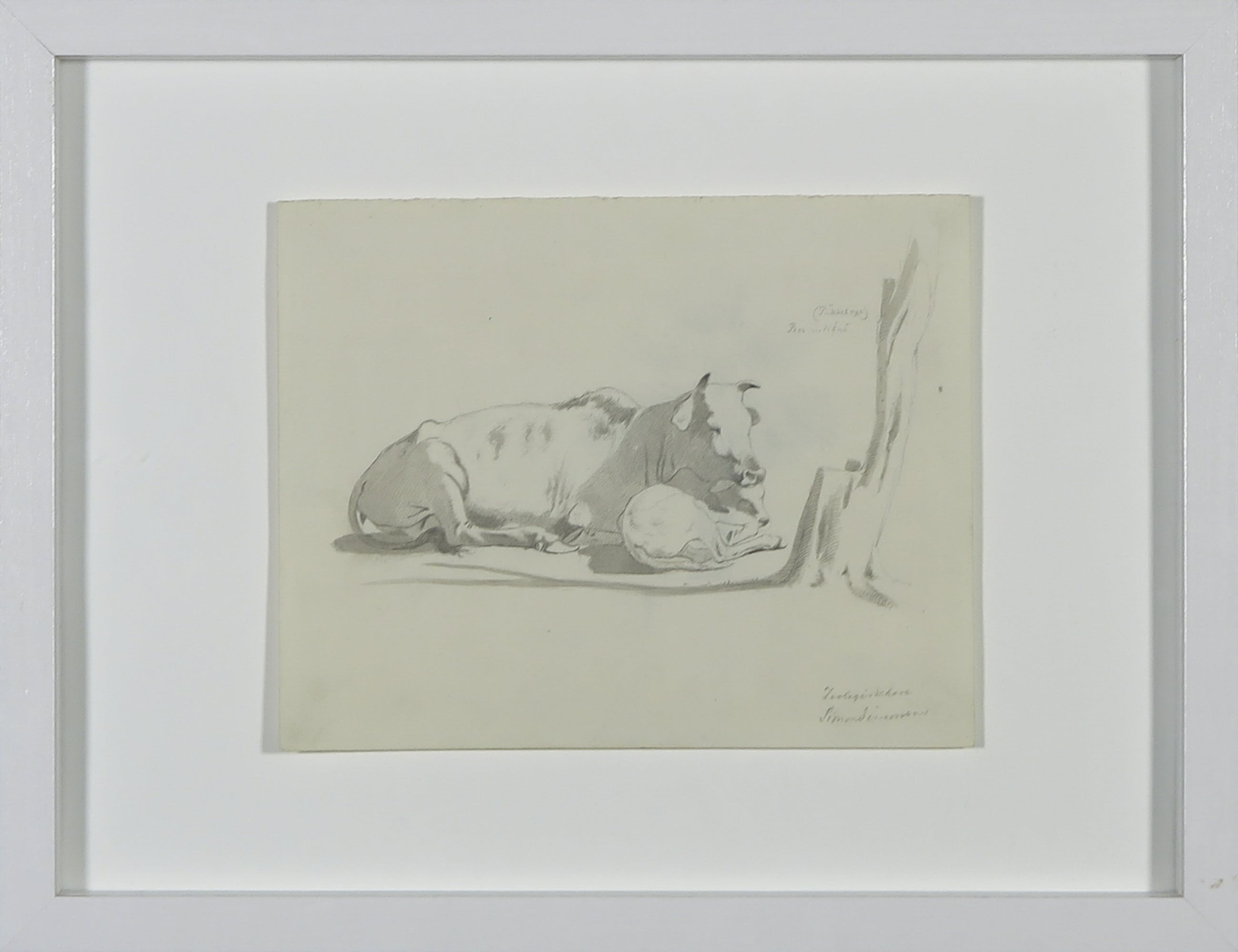 Deze tekening betreft een werk uit zijn studies van het boerderijleven, waarin hij verschillende aspecten van het boerenleven zoals paarden, koeien, boeren/boerinnen en landbouwwerktuigen uitlicht. Op deze voorstelling is een Zeboe (rund) te zien met kalf.