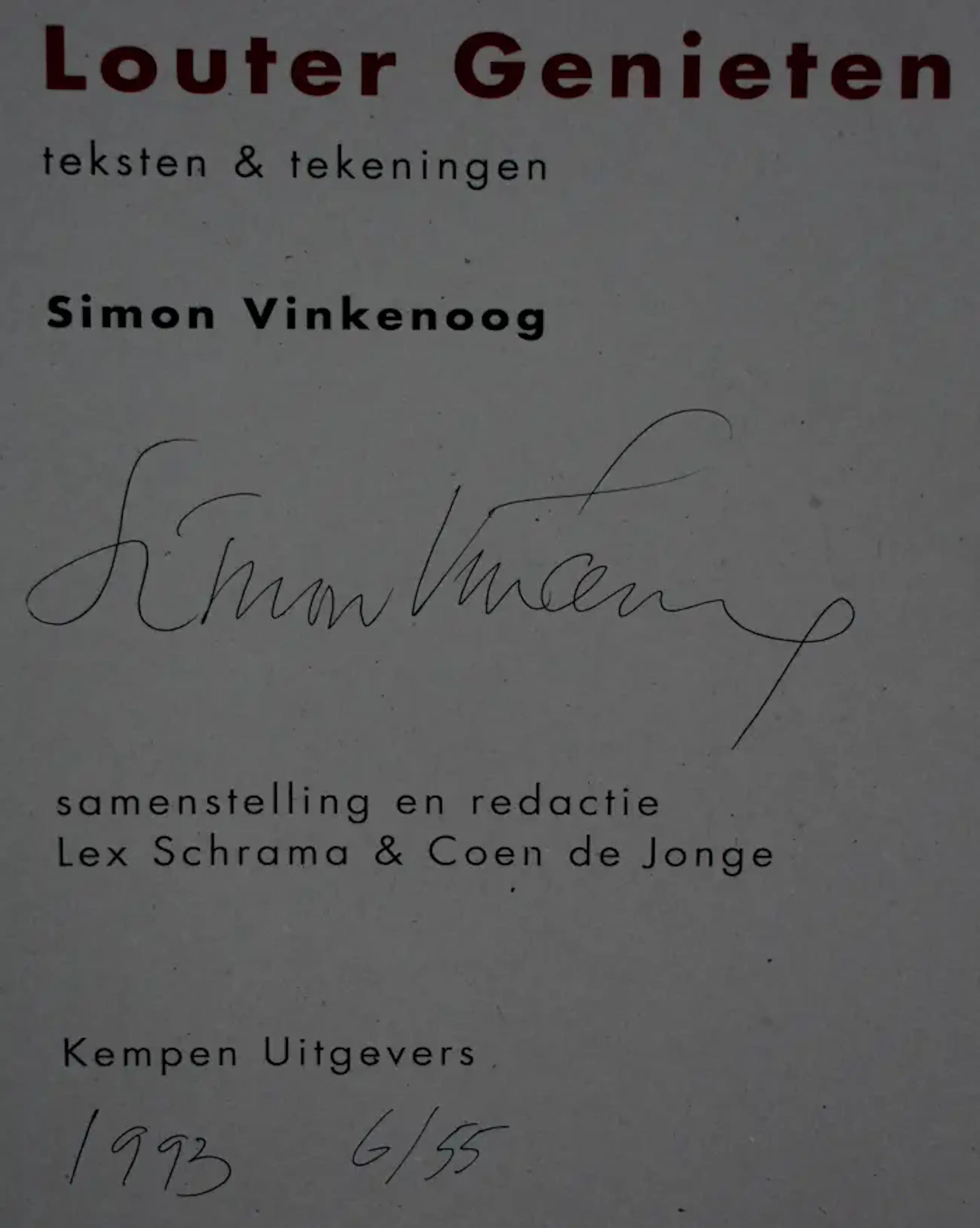 Boek van en door Simon Vinkenoog . Titel: Louter Genieten. Mijmeringen, gedichten, teksten, filosofietjes en bespiegelingen met reproducties van zijn werk. Oplage: 6/55. Het voorblad is gesigneerd, en gedateerd (1993) door Vinkenoog. De authenticiteit van het aangeboden werk wordt volledig gegarandeerd. Een certificaat van echtheid kan, op aanvraag, worden gemaild.