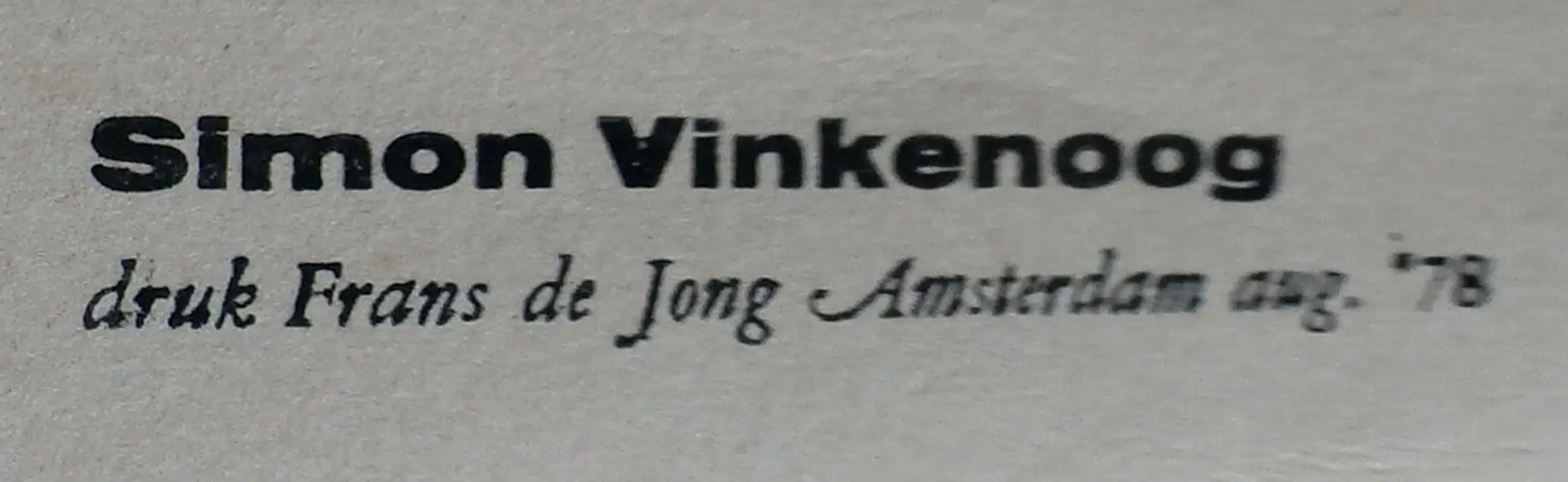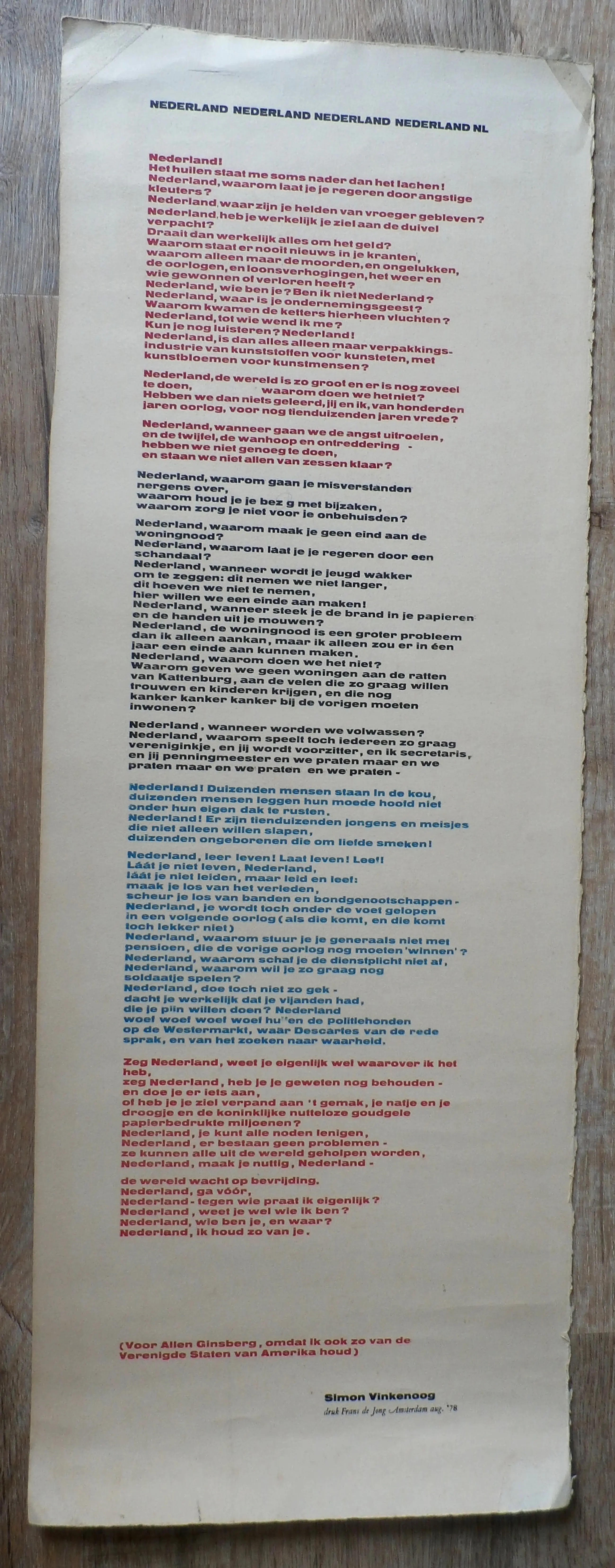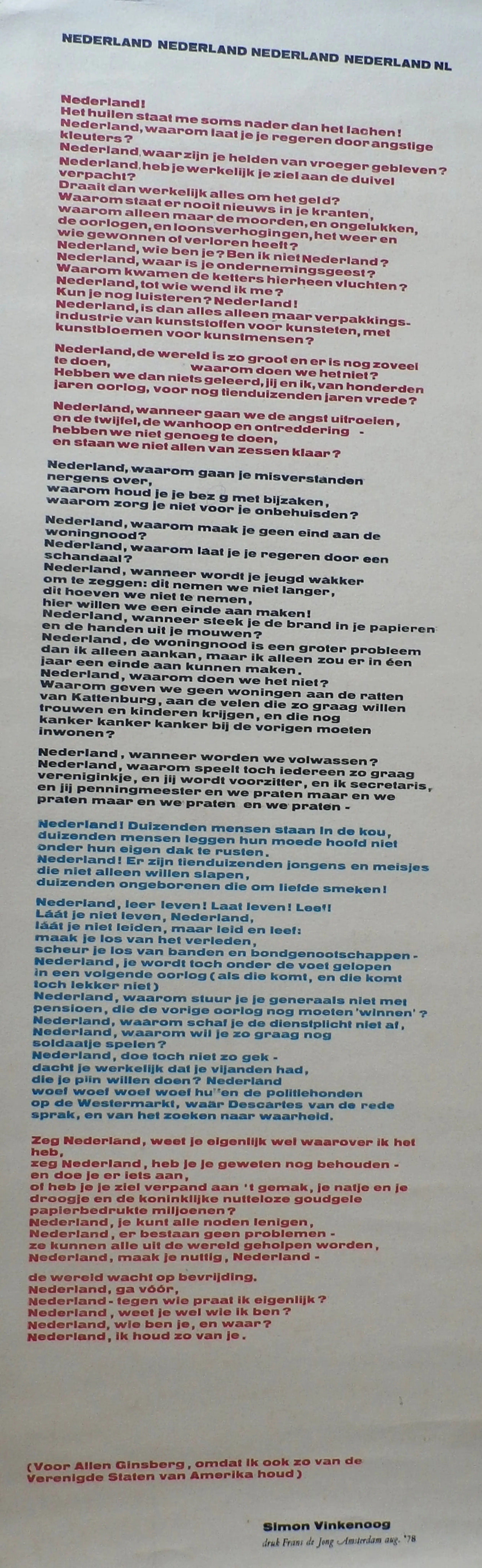 Gedicht van Simon Vinkenoog. Druk: Frans de Jong. Amsterdam, augustus 1978. Afmetingen blad: H76 x b28.5 cm. Het gedicht is niet gesigneerd.