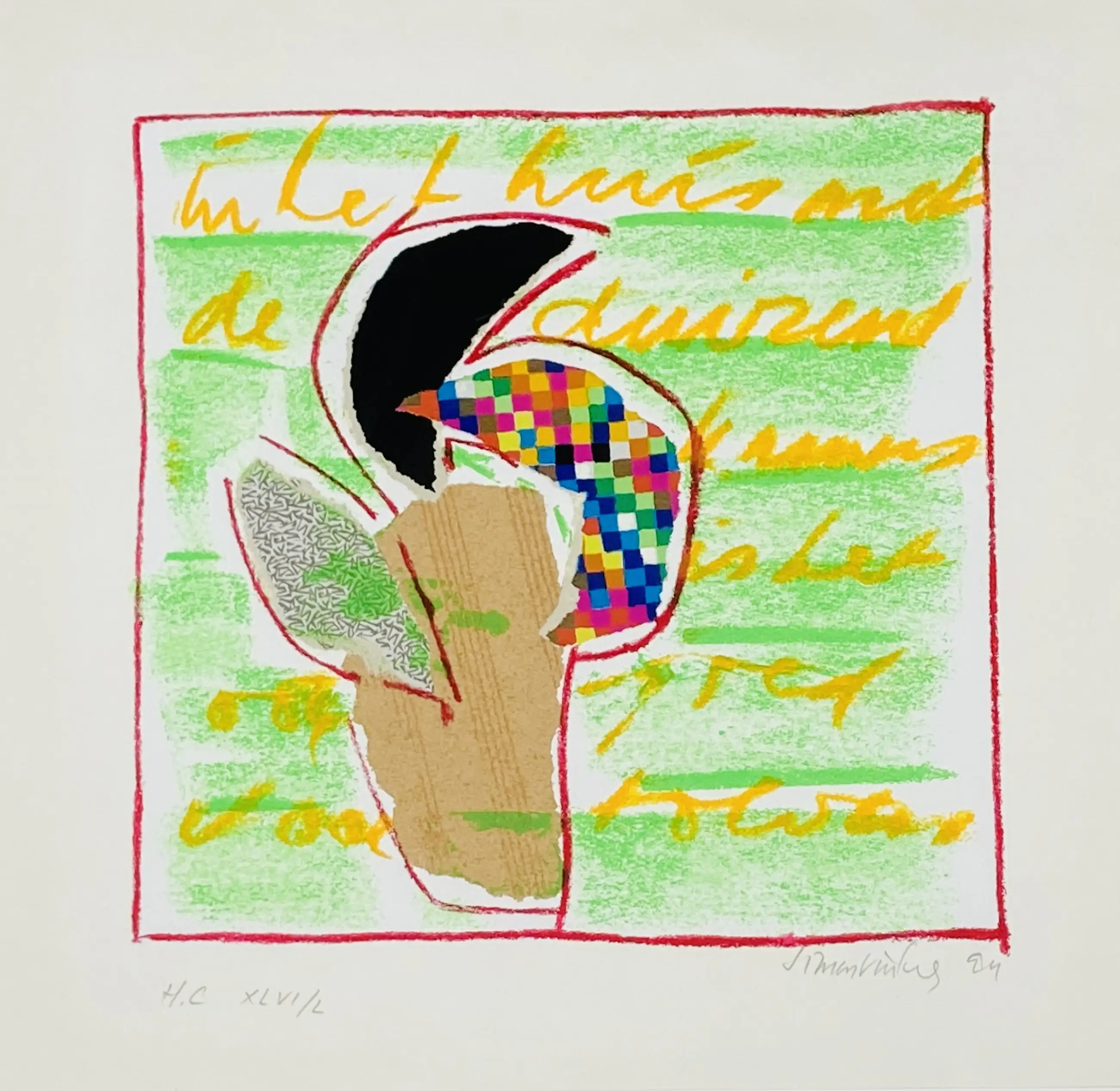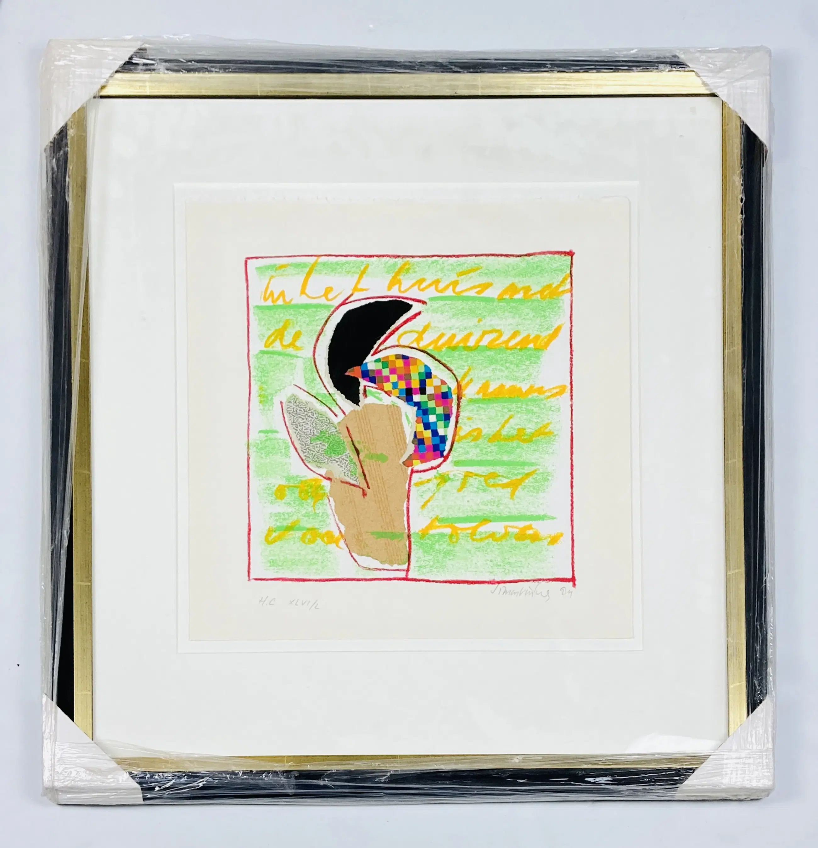 Een prachtige zeefdruk van de Nederlandse Cobra kunstenaar Simon Vinkenoog (1928 - 2009). Het werk verkeert in uitstekende conditie en is handgesigneerd door de kunstenaar. Het werk heeft een bestaande lijst maar deze is goed toonbaar.