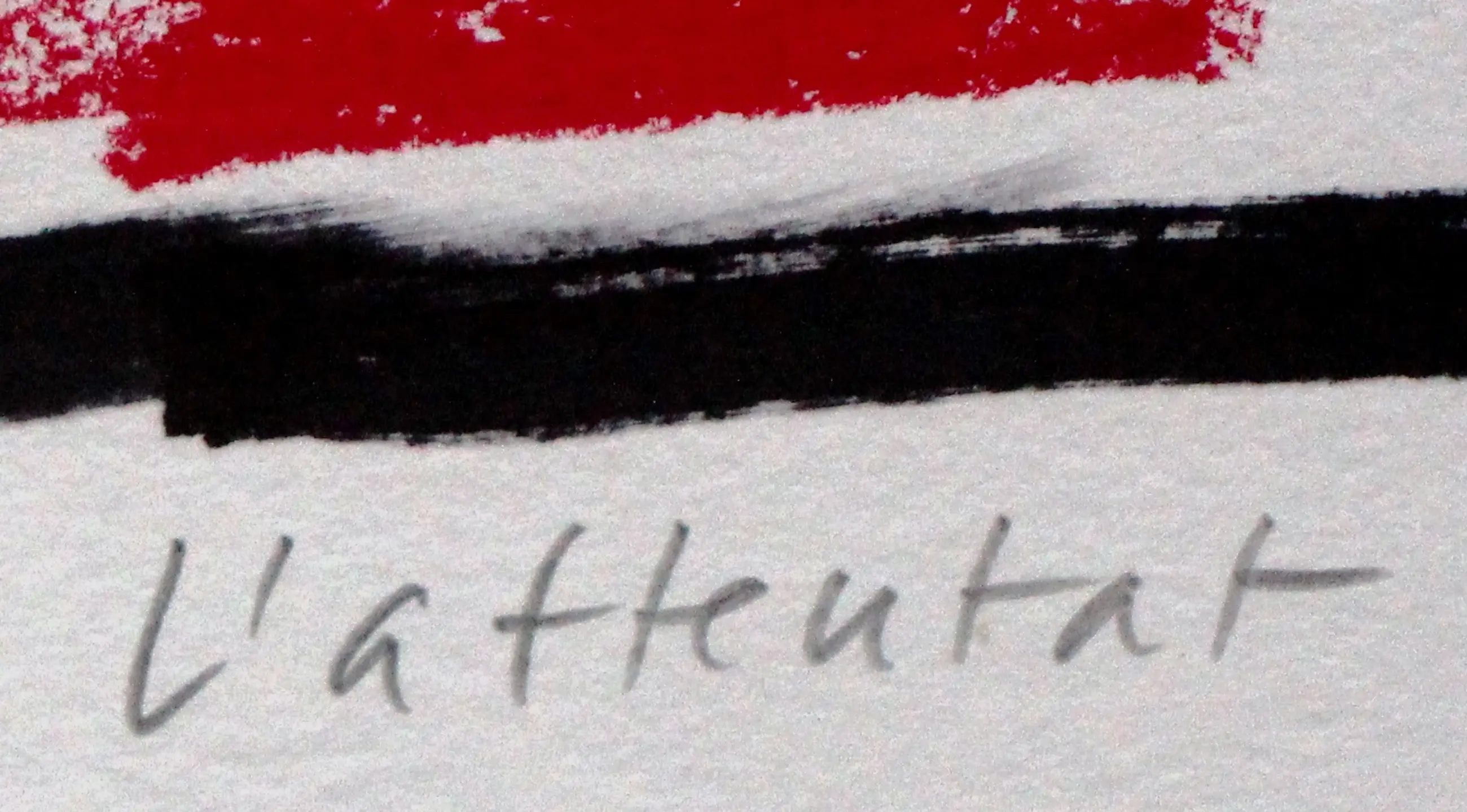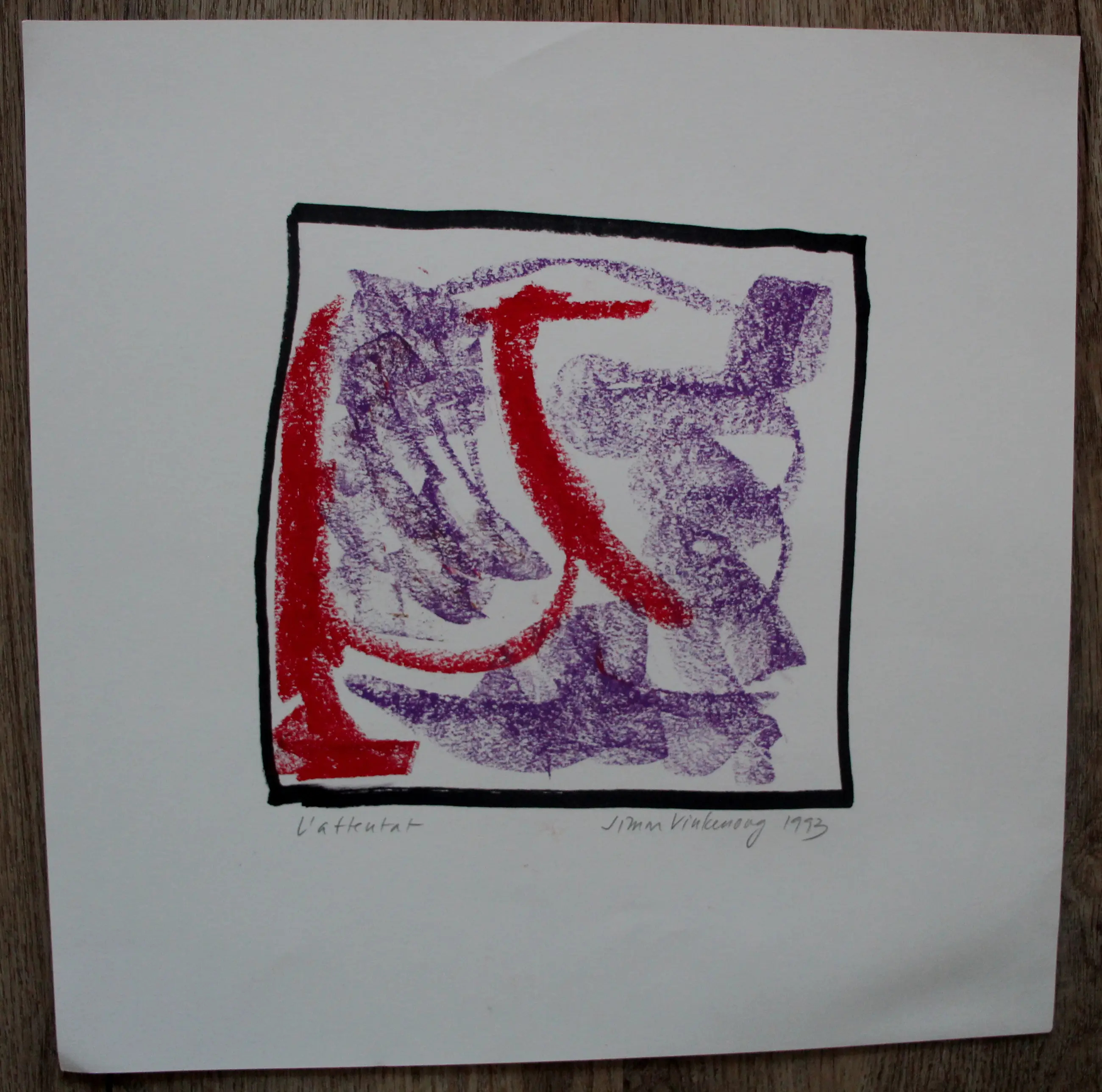 Krijttekening van Simon Vinkenoog. Titel: l'attentat (de aanval) Jaar: 1993. Afmetingen blad: H44 x b44cm. Afmetingen voorstelling: H25 x b25cm. Het werk is rechts onderaan gesigneerd door de kunstenaar. De authenticiteit van het aangeboden werk wordt volledig gegarandeerd. Een certificaat van echtheid wordt, op aanvraag, gemaild.