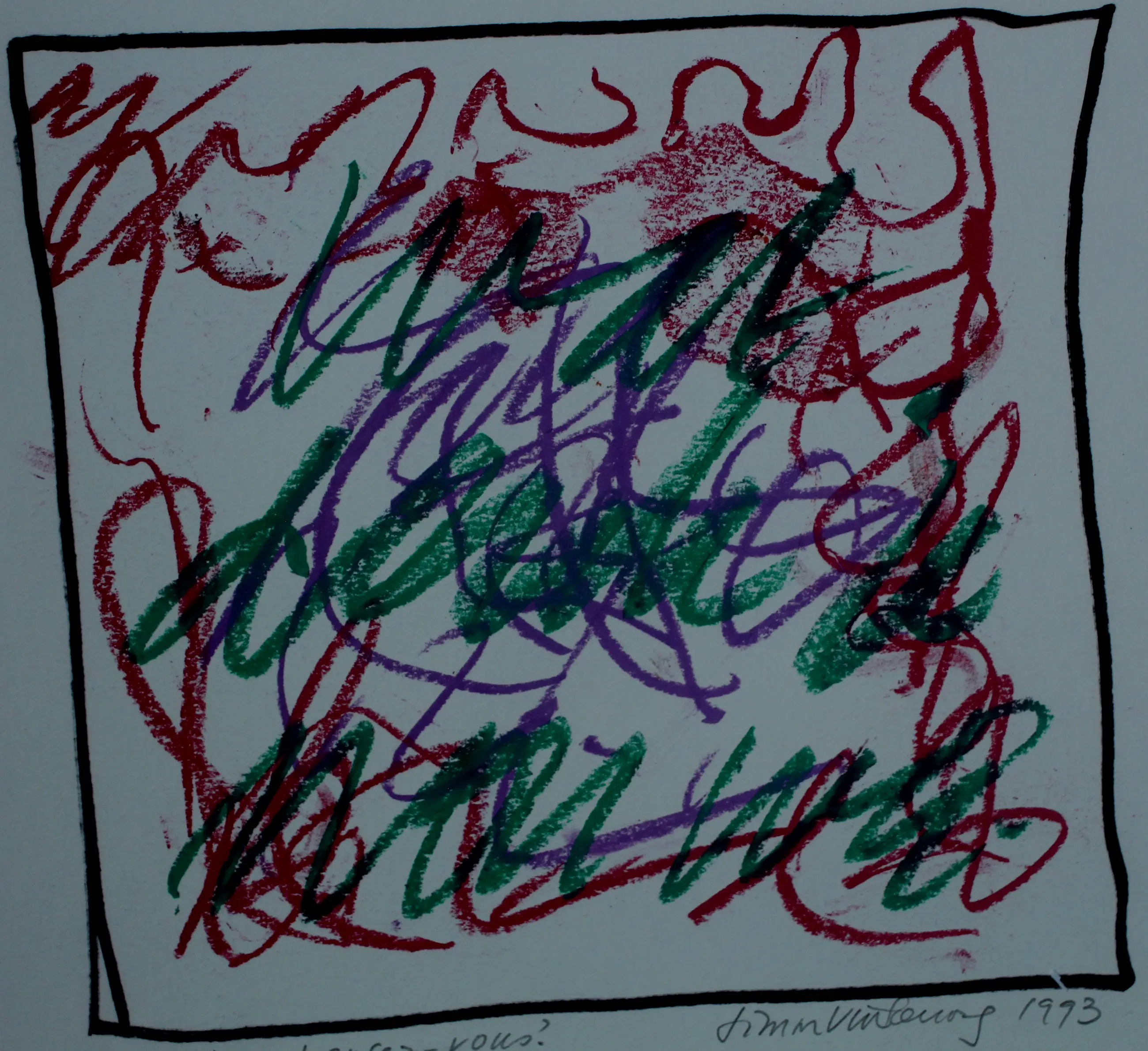 Krijttekening van Simon Vinkenoog. Titel: Qu'en pensez - vous?(wat denk je?) Jaar: 1993. Afmetingen blad: H44 x b44cm. Afmetingen voorstelling: H24 x b25cm. Het werk is rechts onderaan gesigneerd door de kunstenaar. De authenticiteit van het aangeboden werk wordt volledig gegarandeerd. Een certificaat van echtheid wordt, op aanvraag, gemaild.