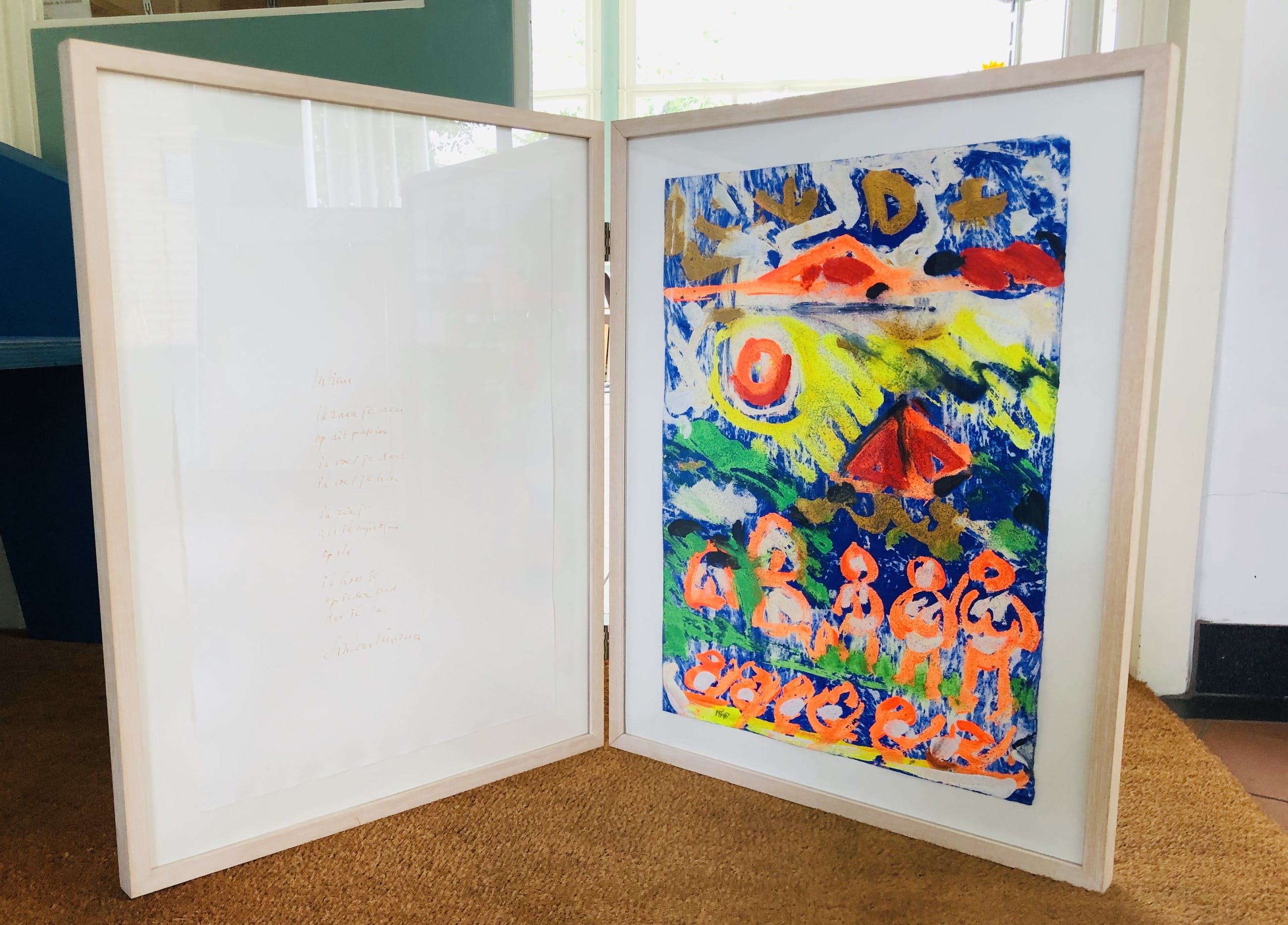 Een bijzonder tweeluik met poëzie van Simon Vinkenoog (handgeschreven) en origineel kleurrijk werk van Theo Niermeijer. Het werk kan worden opgehangen of open geklapt worden neergezet. De afzonderlijke werken zijn ca 2 x 55 x 40 cm en met lijsten 67 x 106 cm als tweeluik. U kunt het werk vooraf komen beoordelen in de schatkamer van galerie Rotor in Gorinchem. U kunt het werk na aankoop ook laten opslaan in onze speciale opslagkamer. Verzenden per koerier of ophalen.