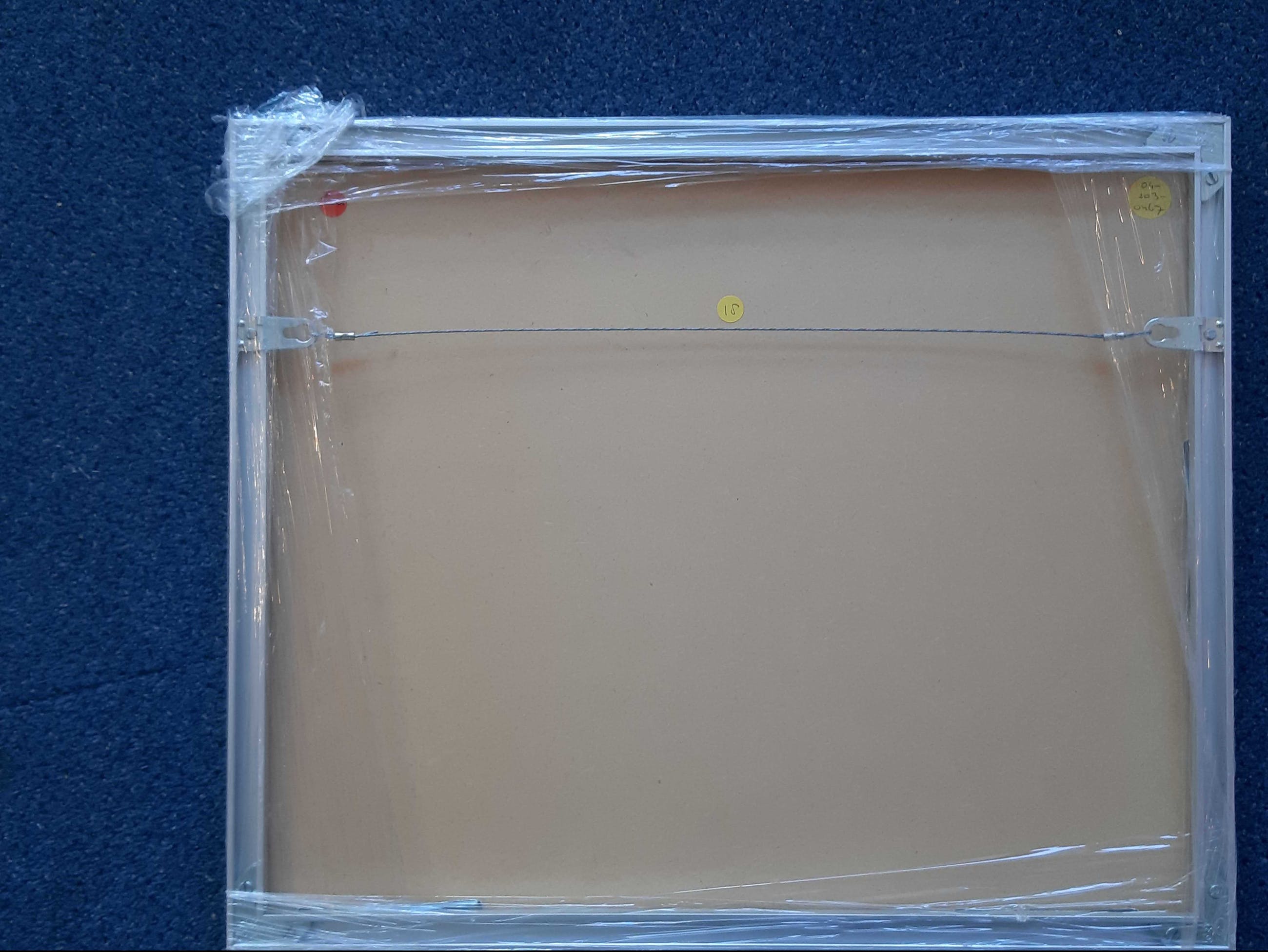 Het werk is degelijk ingelijst in een aluminium profiel v.z.v. een ophangmechanisme en