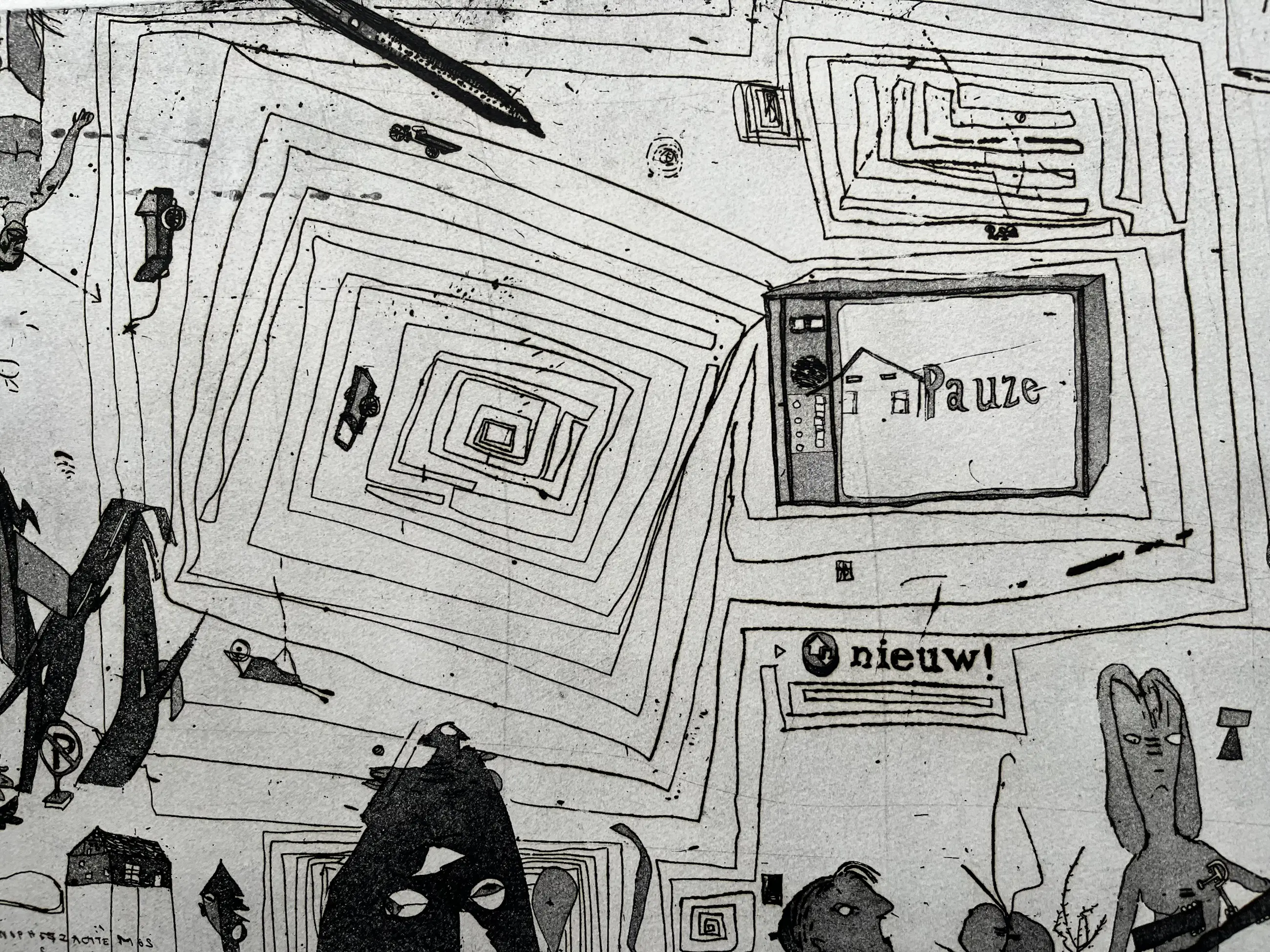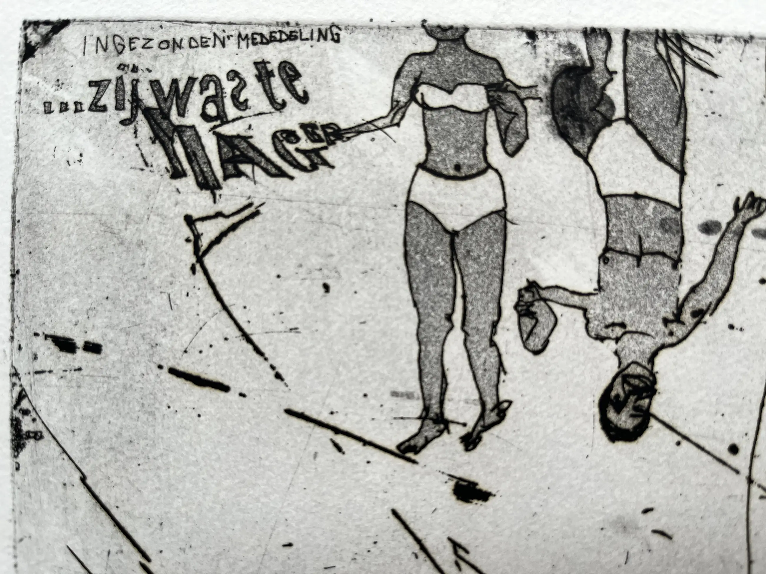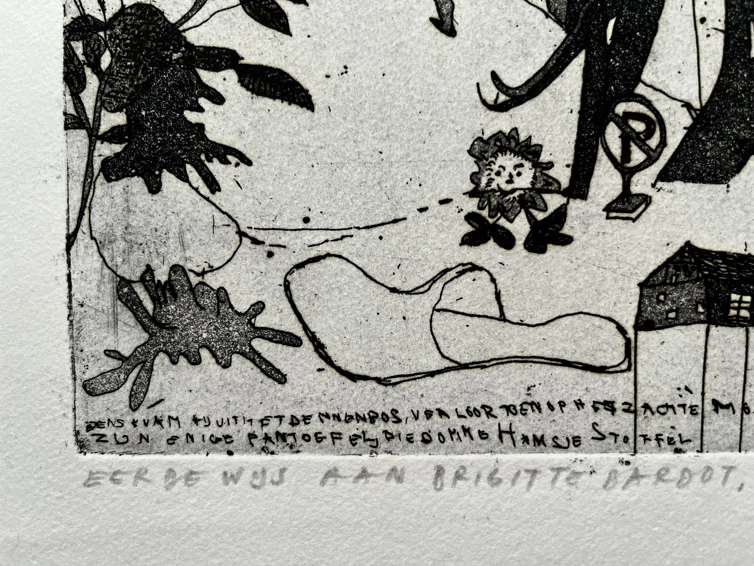 Ets uit 1965. Uniek??? Ets komt uit de voormalige BKR RIJKSDIENST collectie. Nooit gelijst geweest. Links onder en rechtsboven zitten kleine imperfecties in het blad( zie detailfoto’s) Afmeting blad 49,5 x 65 cm. Afbeelding 25 x 47,5 cm.