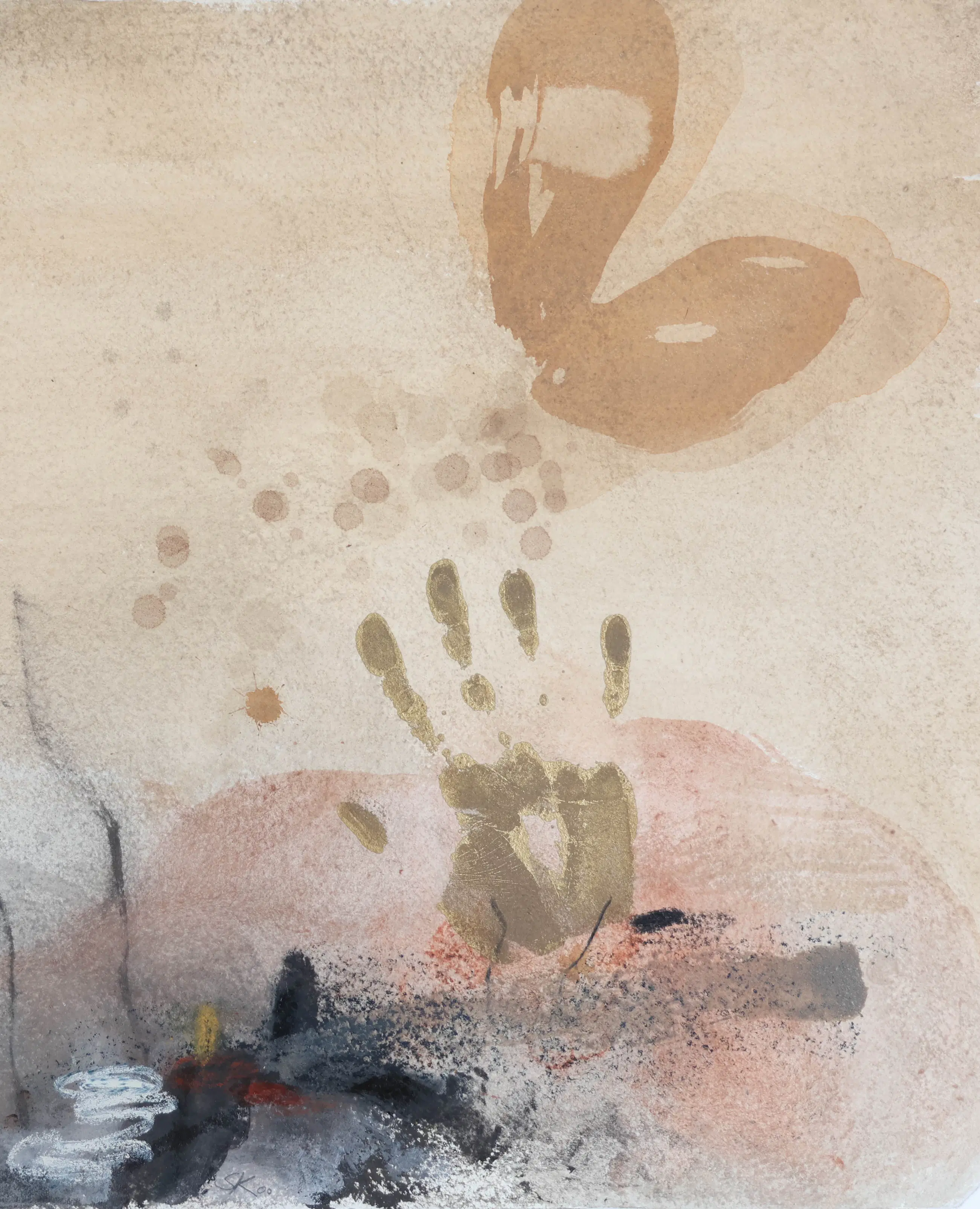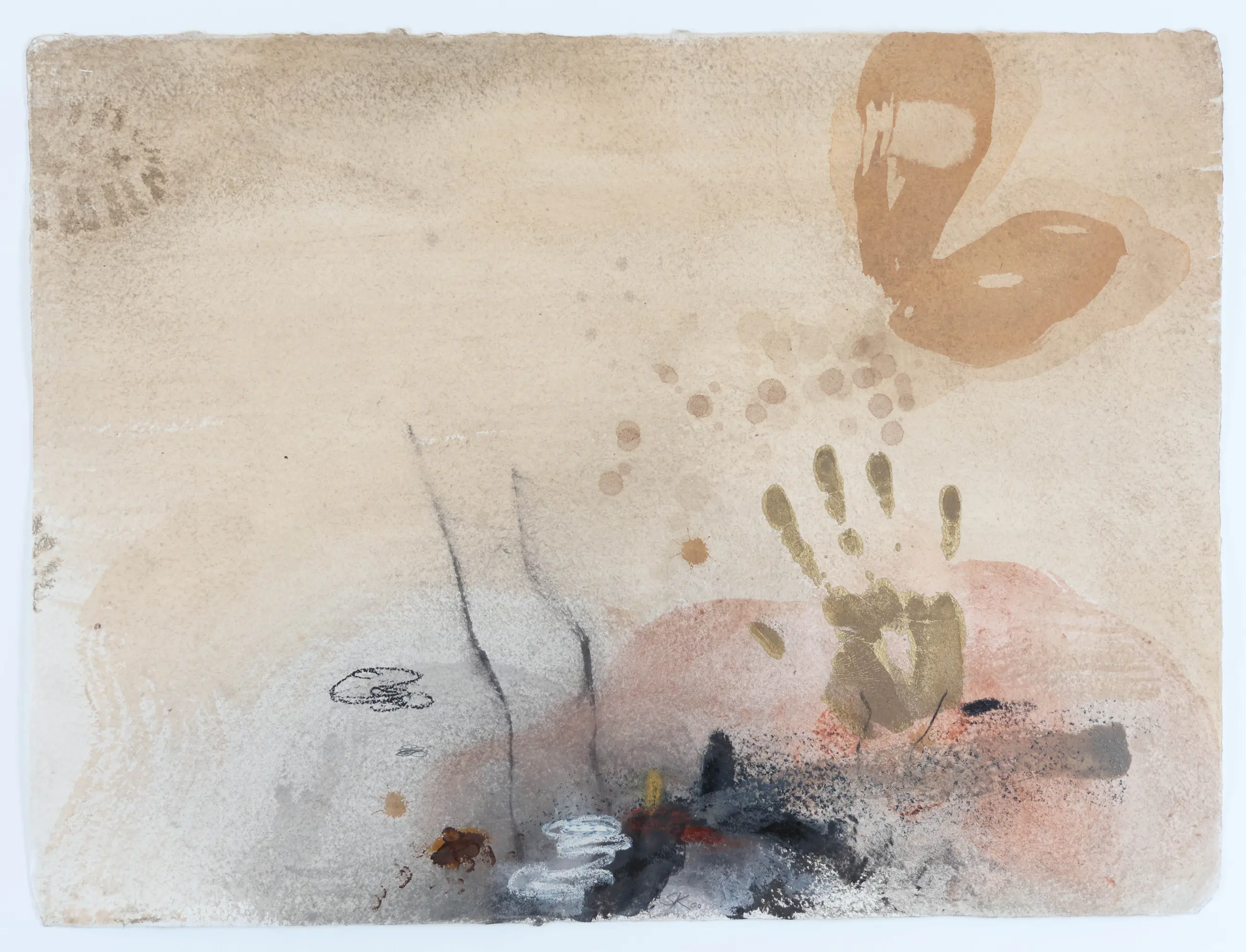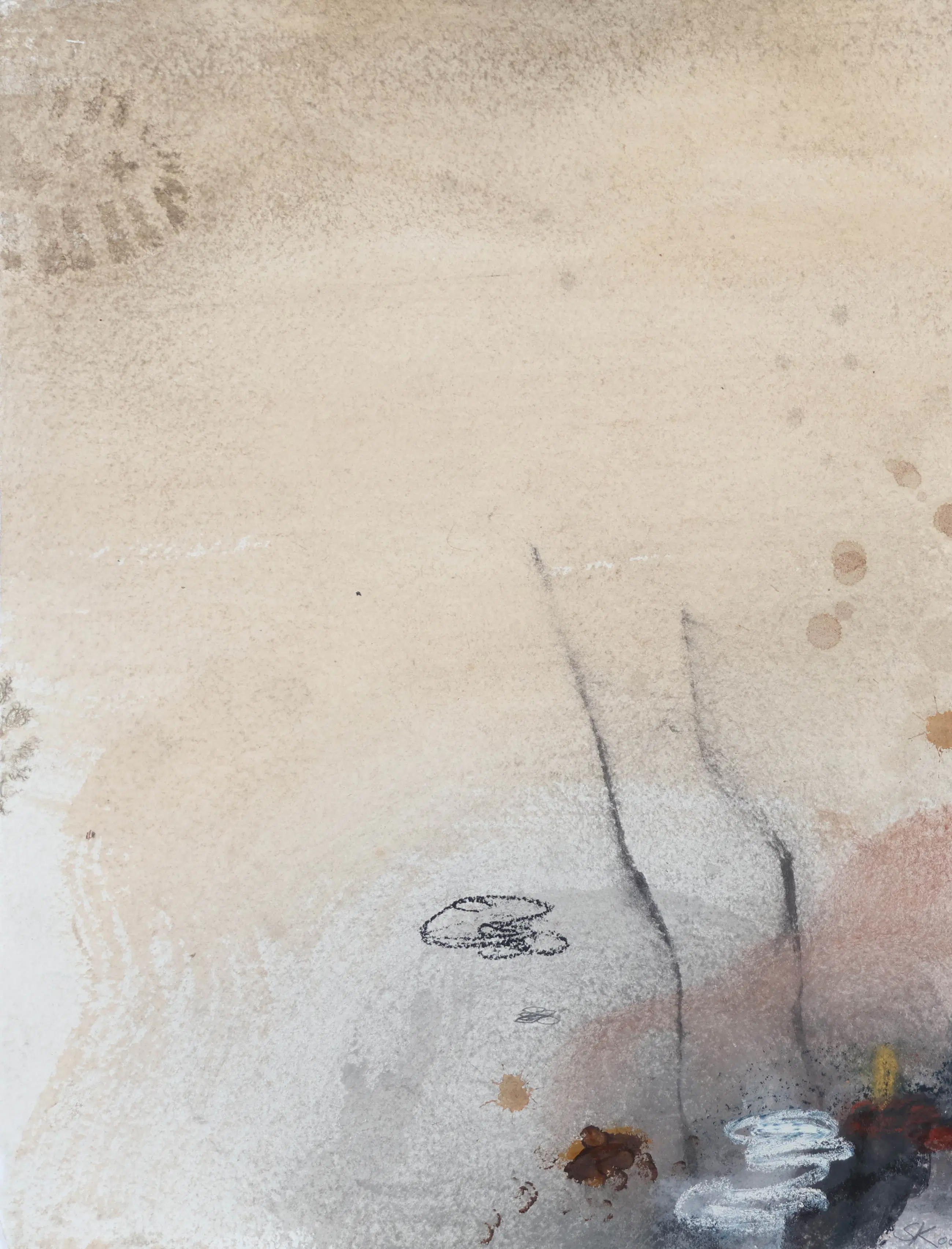 Schilderij in gemengde techniek van de Nederlandse kunstenaar Sjaak Korsten (Helden, 1957). Hij maakt als beeldend kunstenaar schilderijen, werken op papier, objecten, foto's en installaties. Zijn werken zijn poëtisch, intiem en persoonlijk. Alledaagse objecten en situaties worden geïsoleerd en in een andere context geplaatst zodat ze een diepere poëtische waarde krijgen.