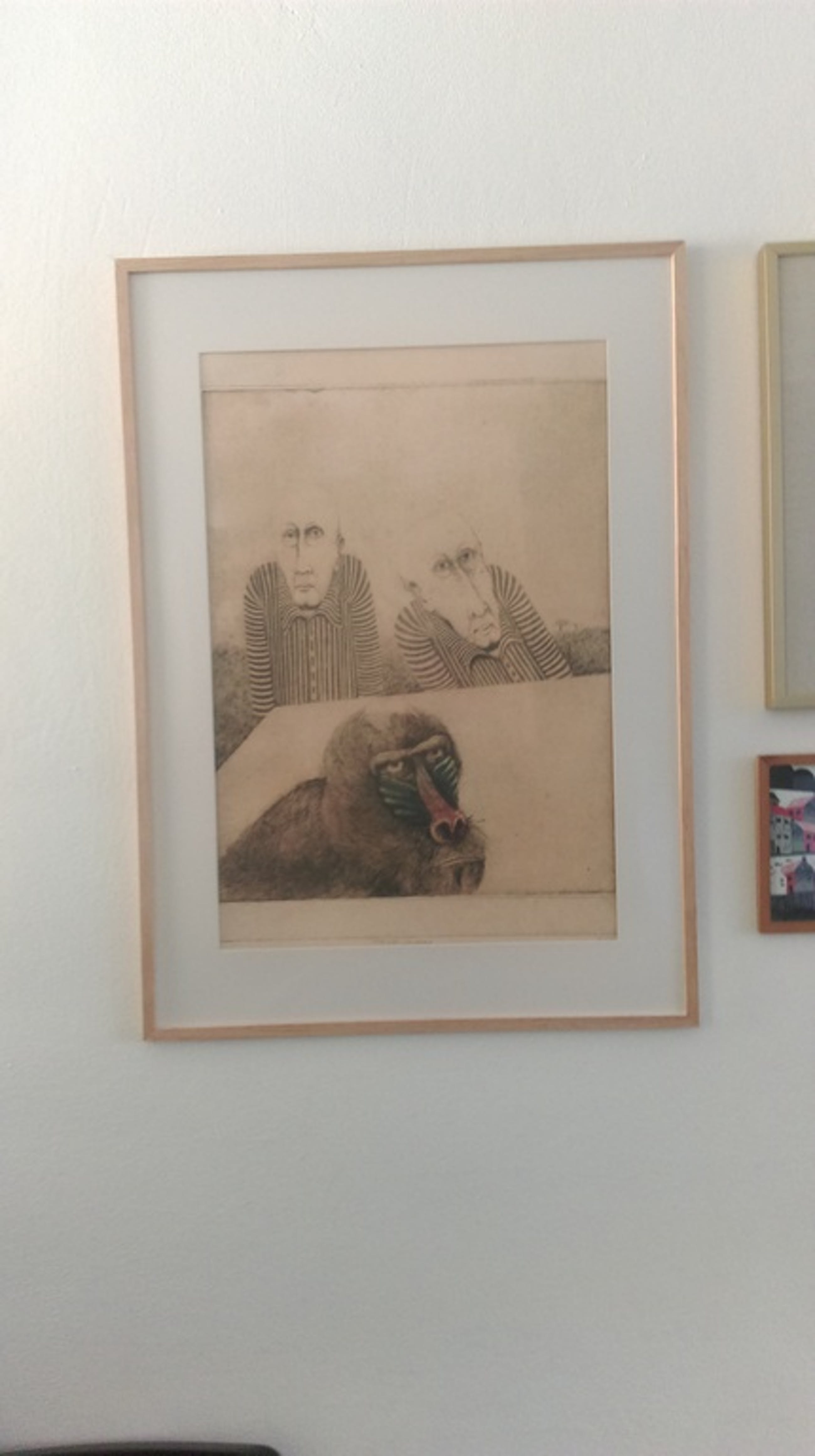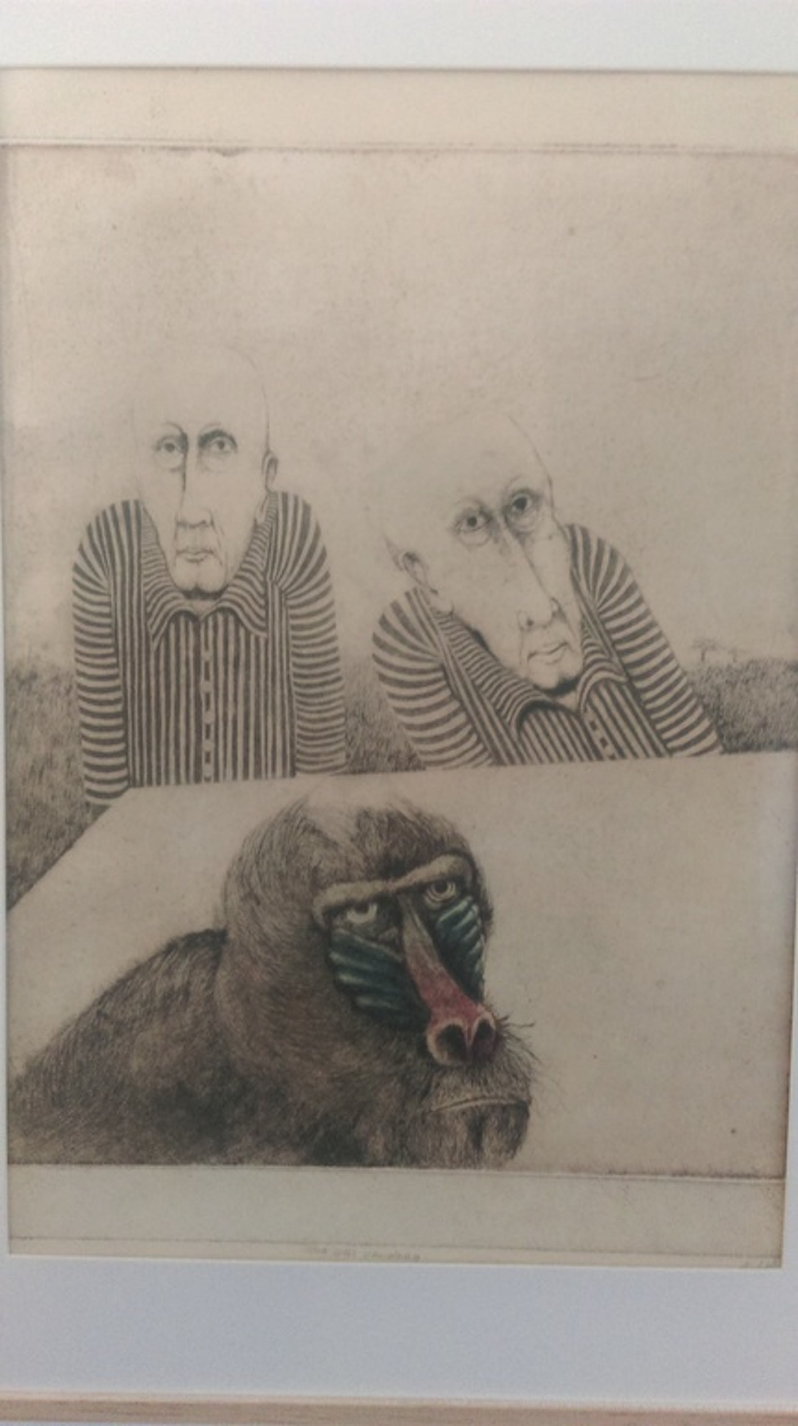 Mooie originele kleurets van Sjef Henderickx, gemaakt in 1973. Scene met baviaan en twee heren. Handgesigneerd. Grootte ongeveer 60 cm hoog, 40 cm breed.