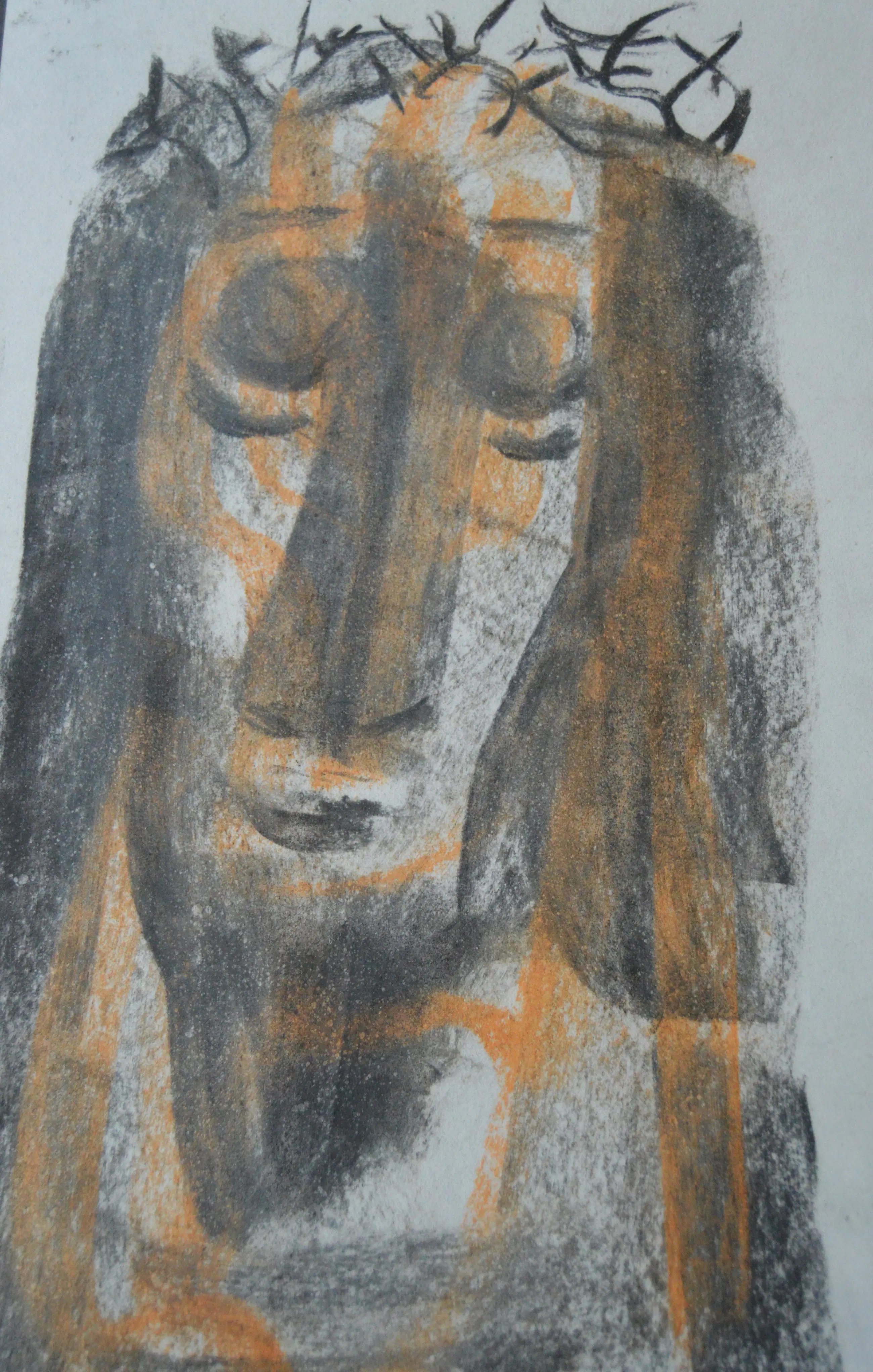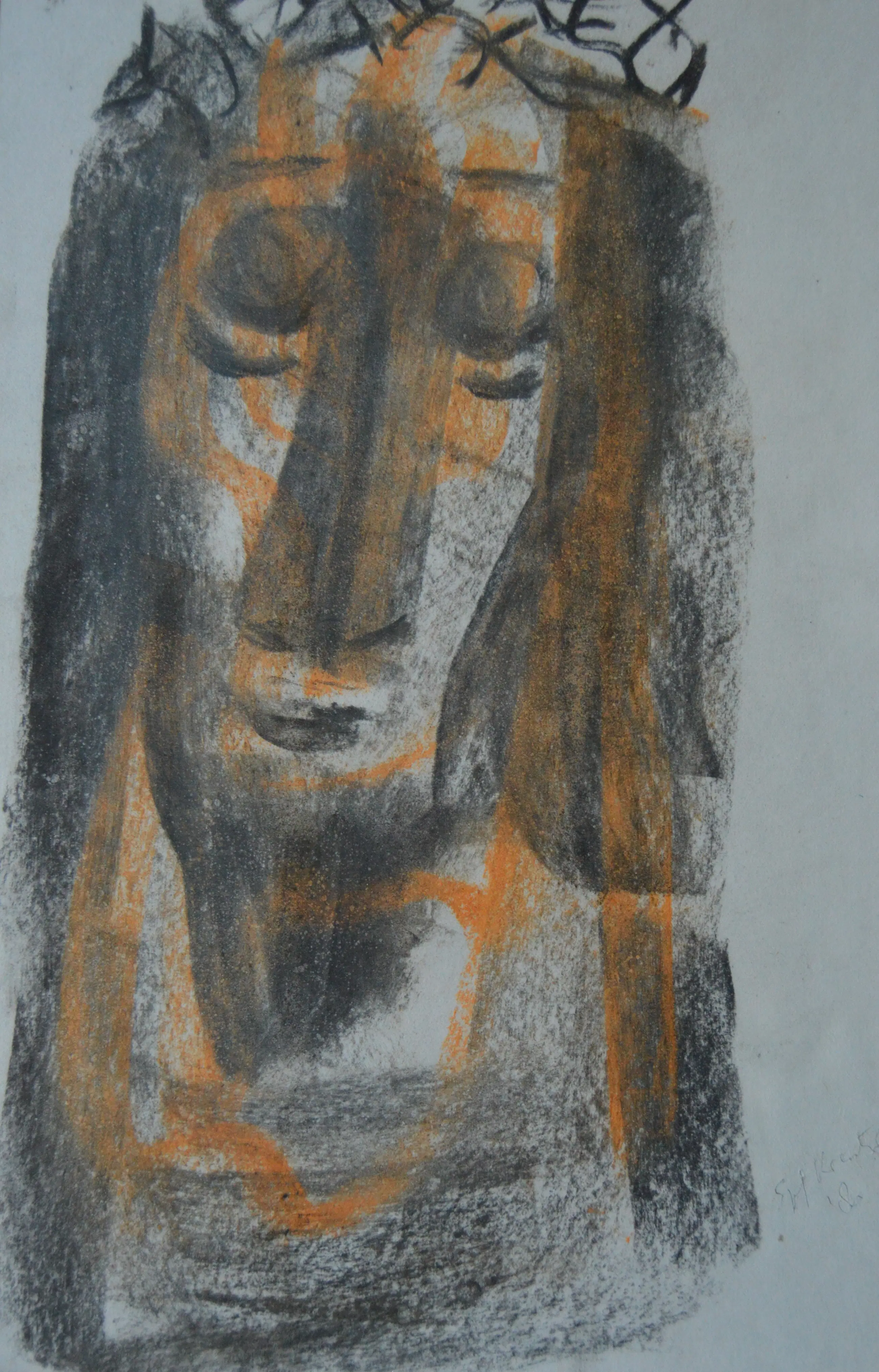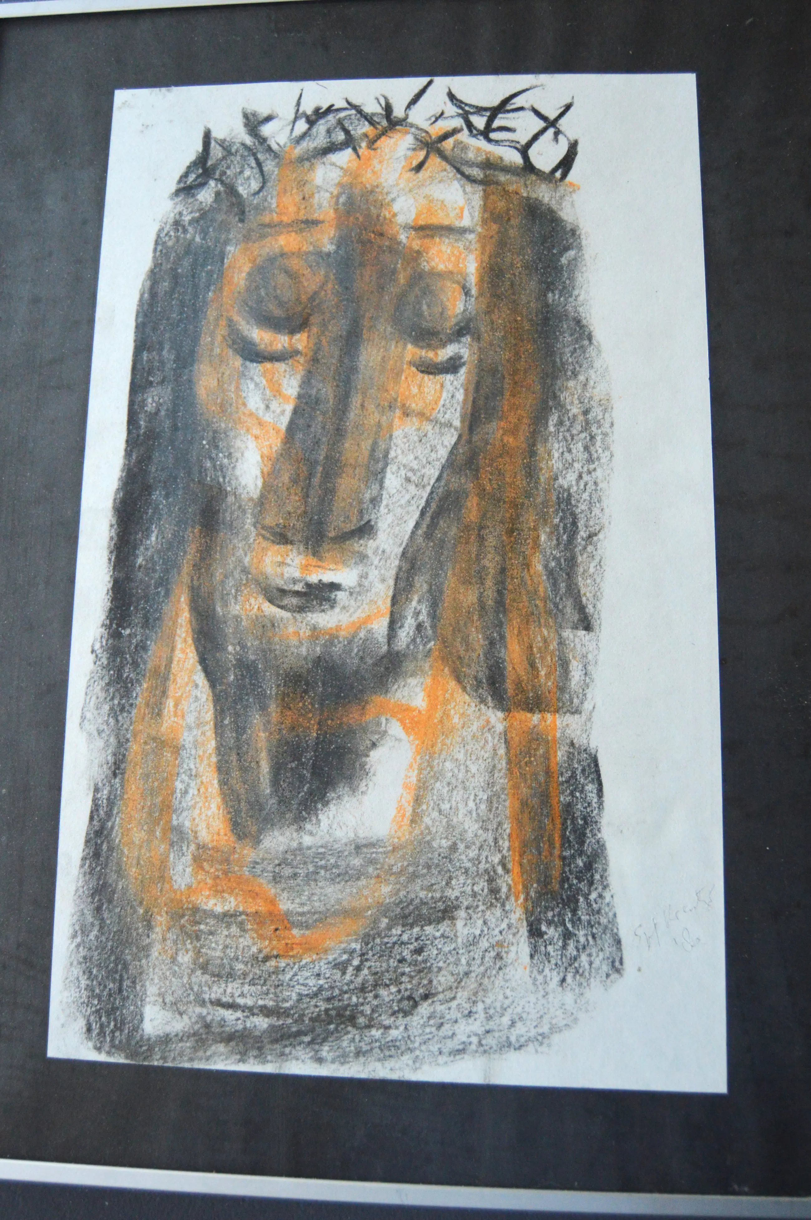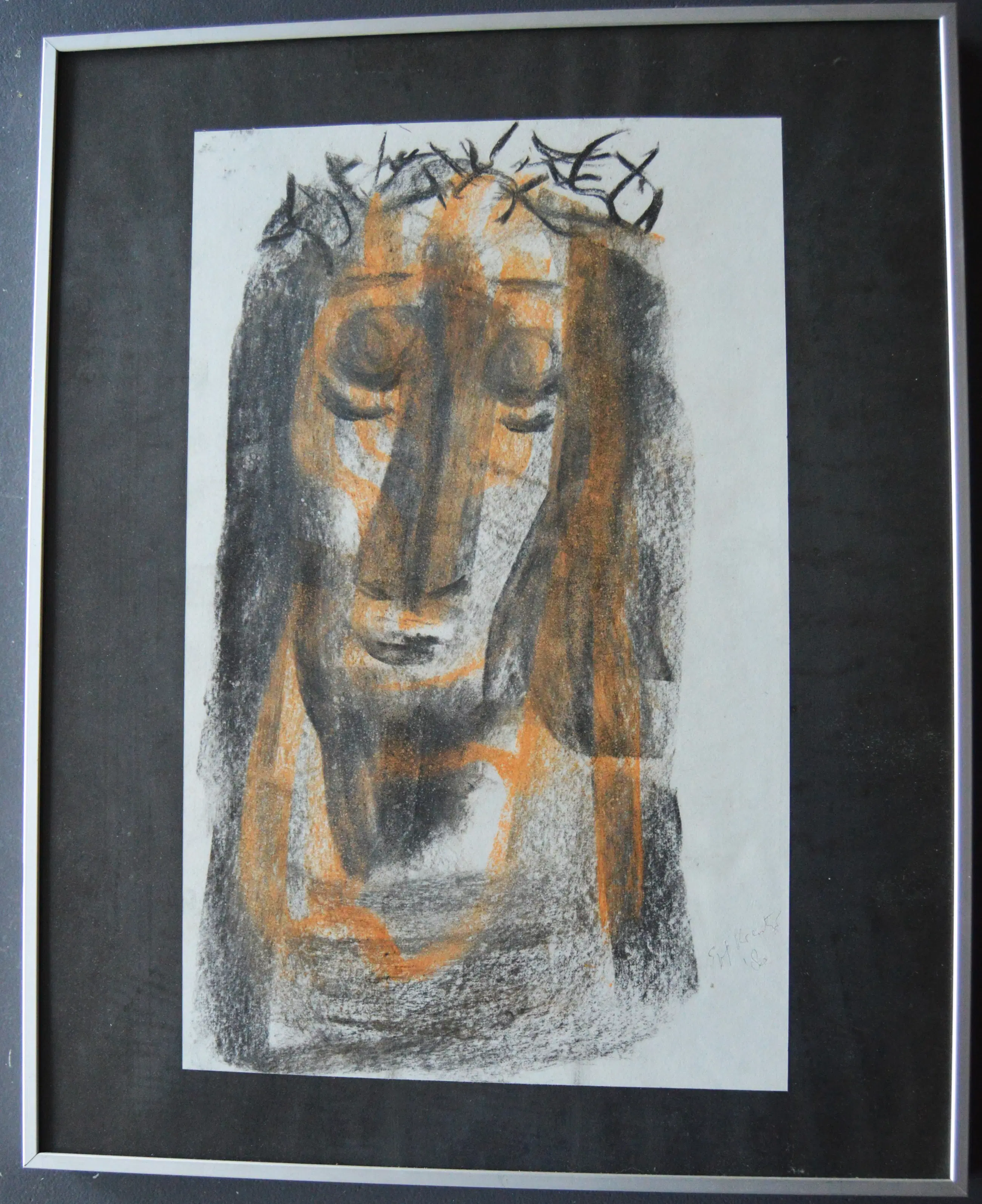 Zeer mooi portret van Christus met doornenkroon. Ingelijst achter ontspiegeld glas. Gesigneerd rechtsonder naast afbeelding.