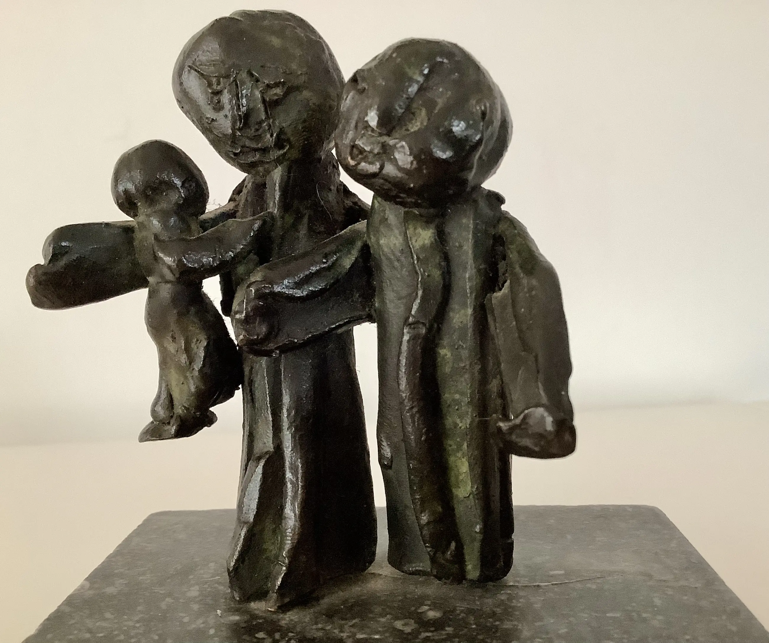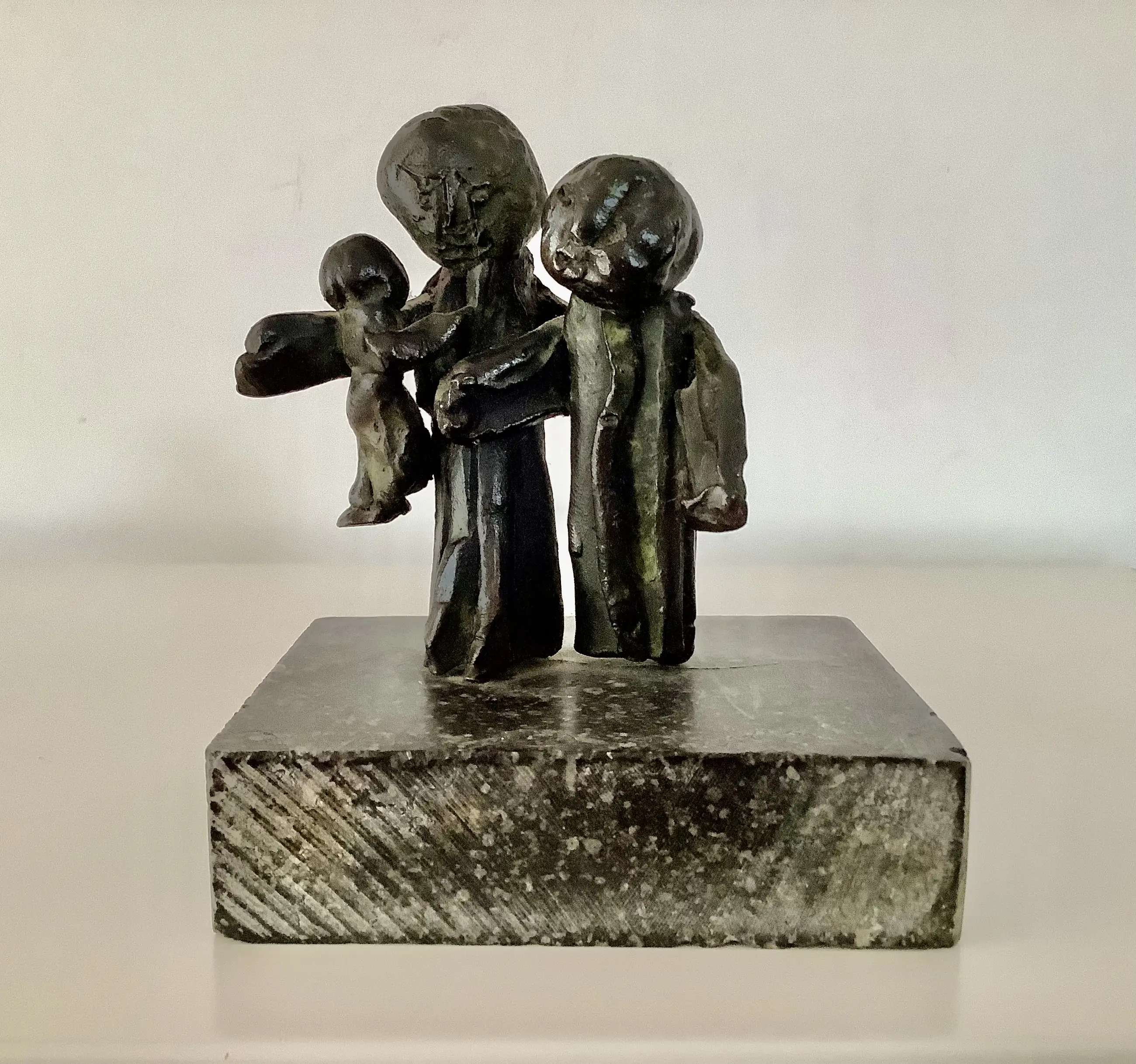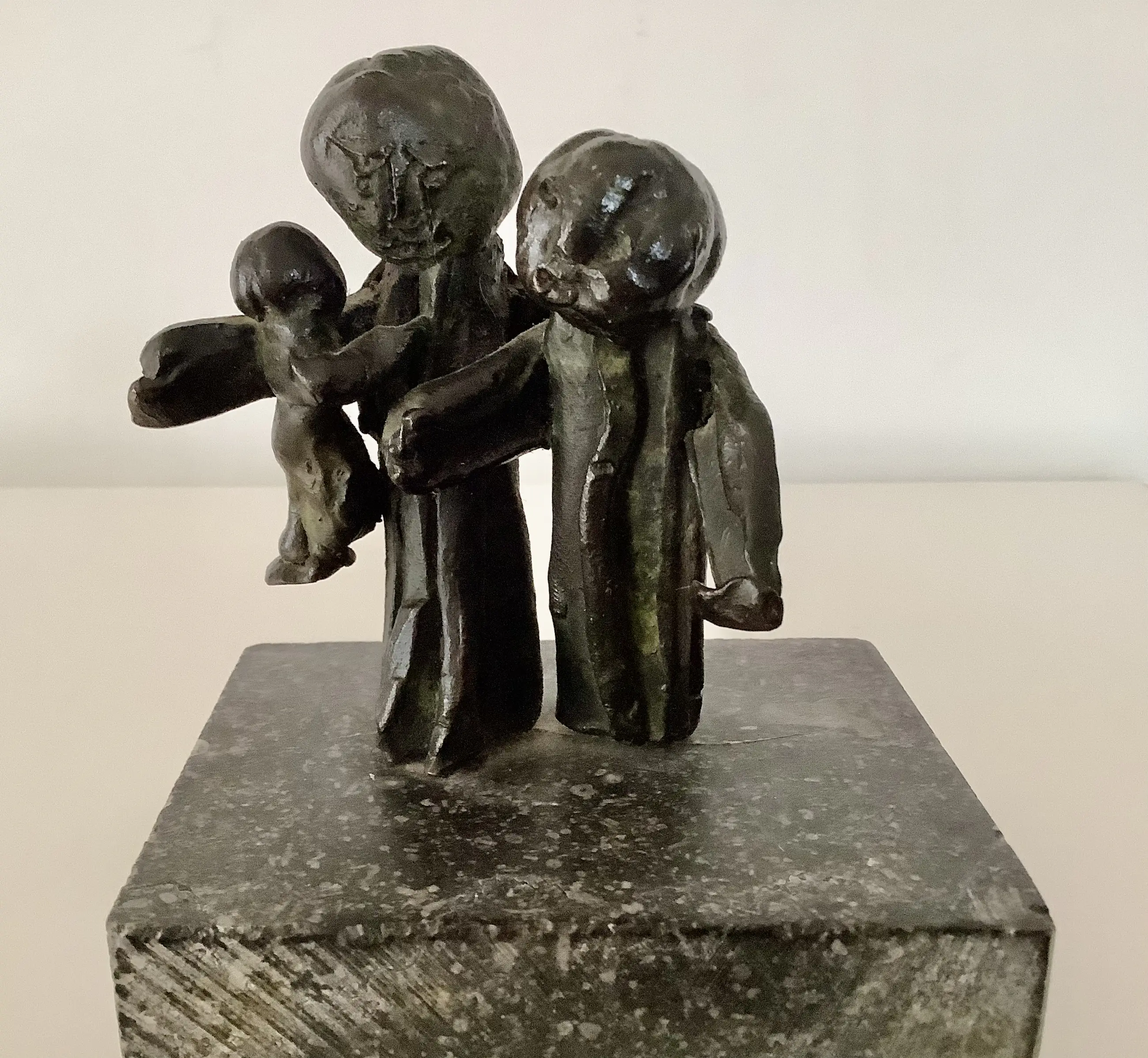 Plastische weergave van een gezin. Massief brons op natuurstenen blok. Aandoenlijk object.