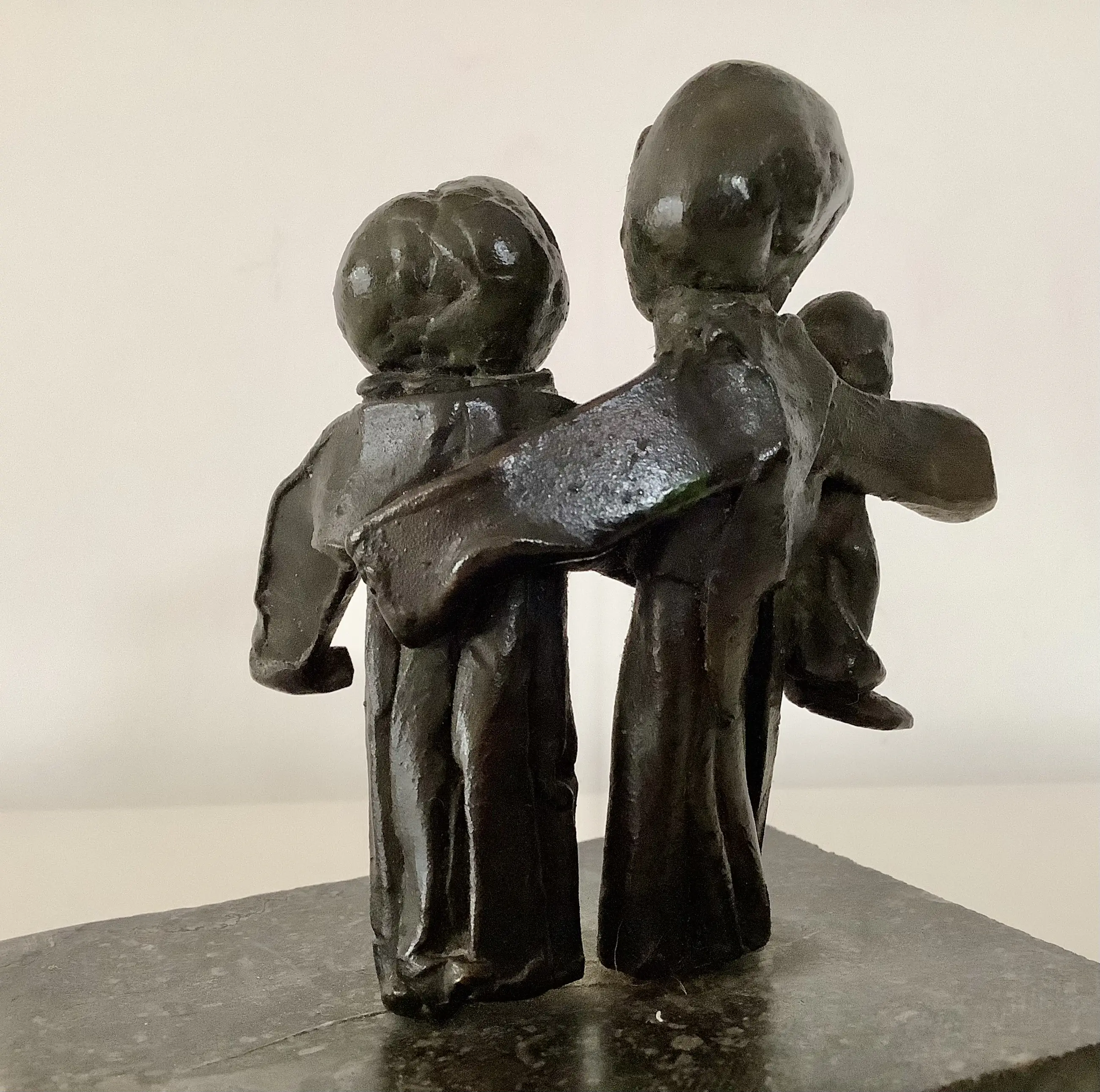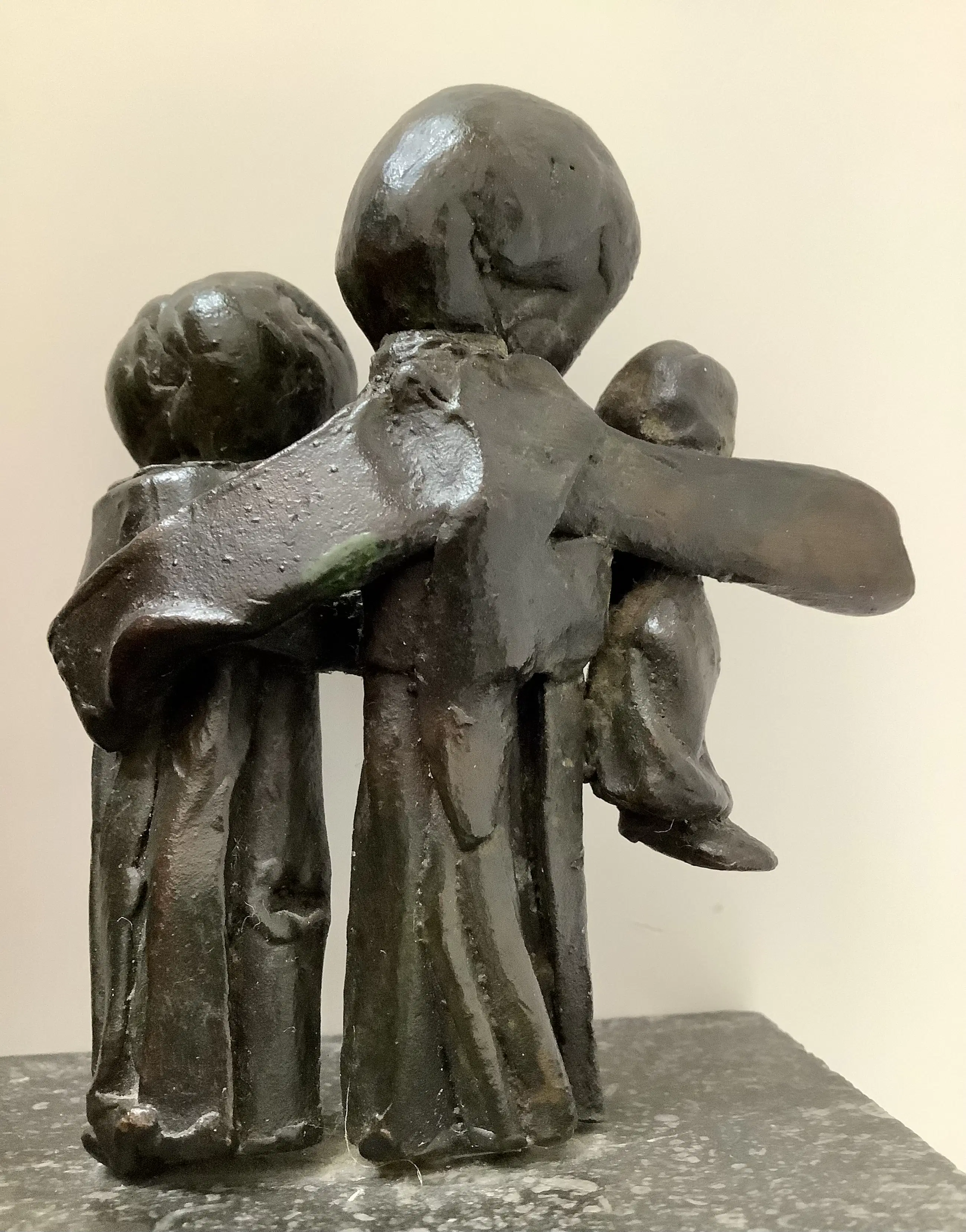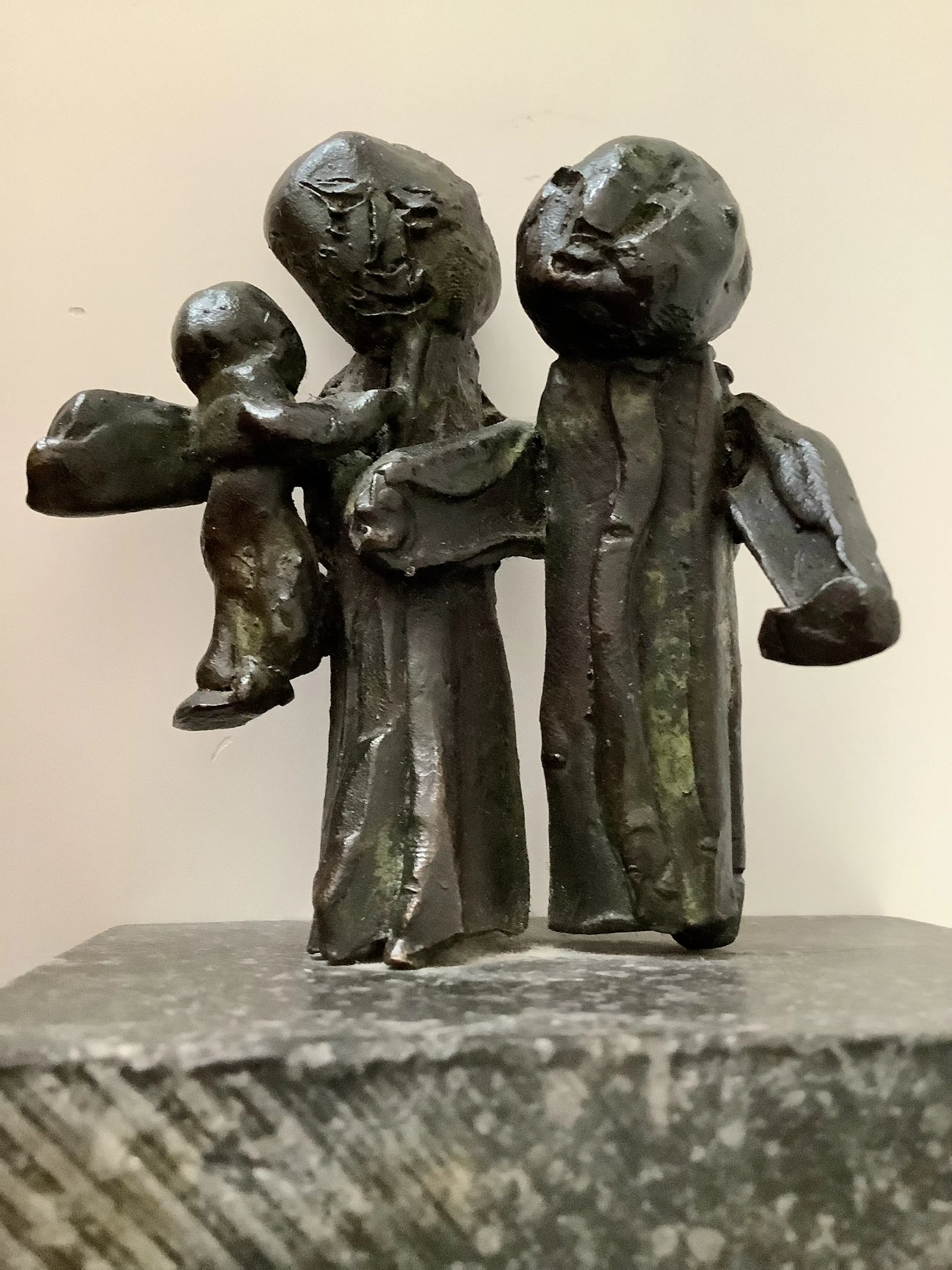 Plastische weergave van een gezin. Massief brons op natuurstenen blok. Aandoenlijk object.