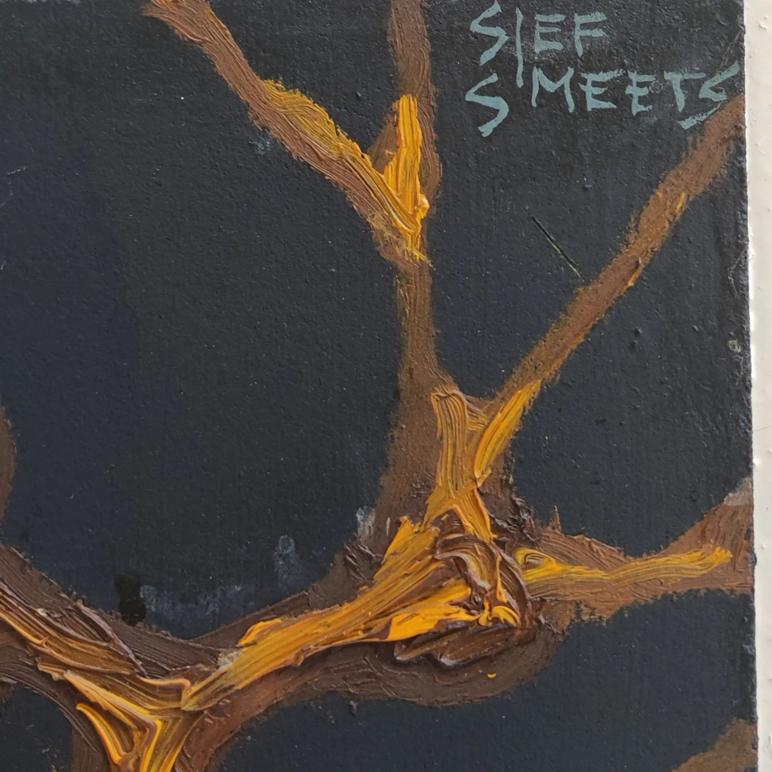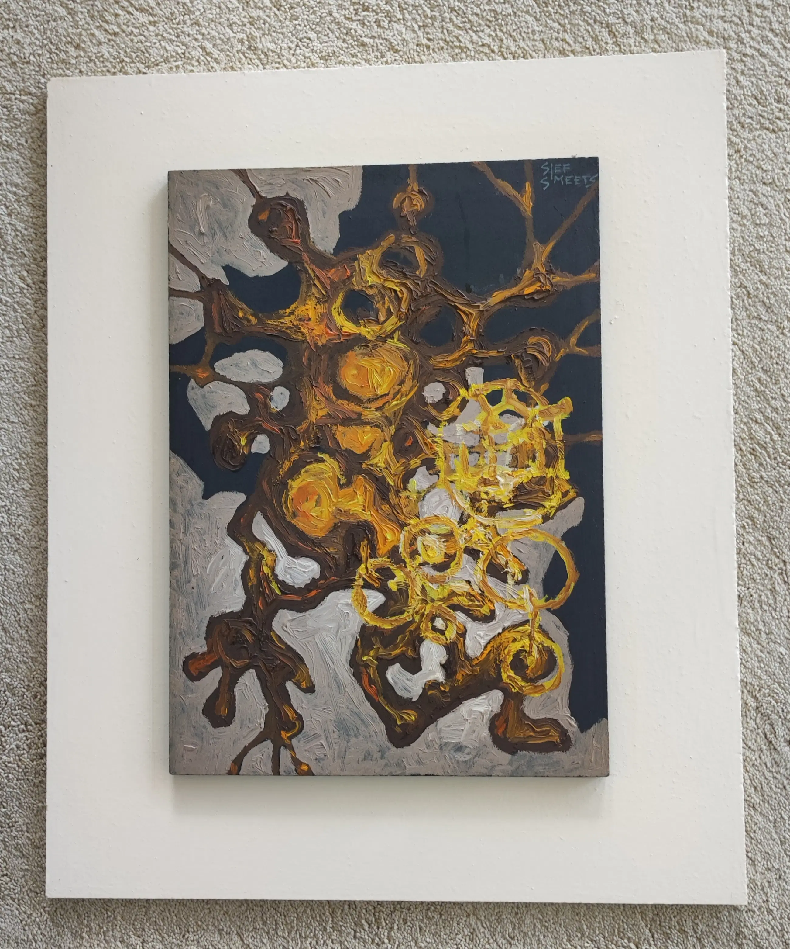 Impasto geschilderd in oranje, geel en bruin. Achtergrond zwart en wit. Takken en cirkelvormen. Paneel bevestigd op wit board. Geschilderd in jaren zeventig.