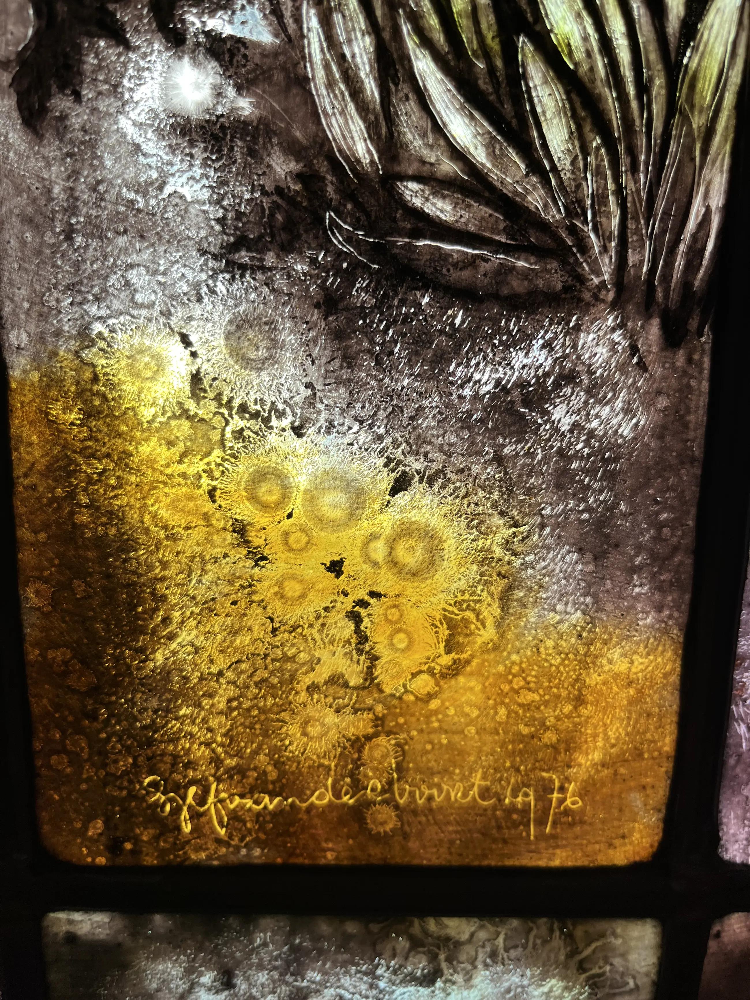 Origineel glas in loodraam van kunstenaar Sjef van der Voort uit 1976. Het raam is 125 cm hoog en 56,5 cm breed (excl. kozijn) en in zeer goede staat.