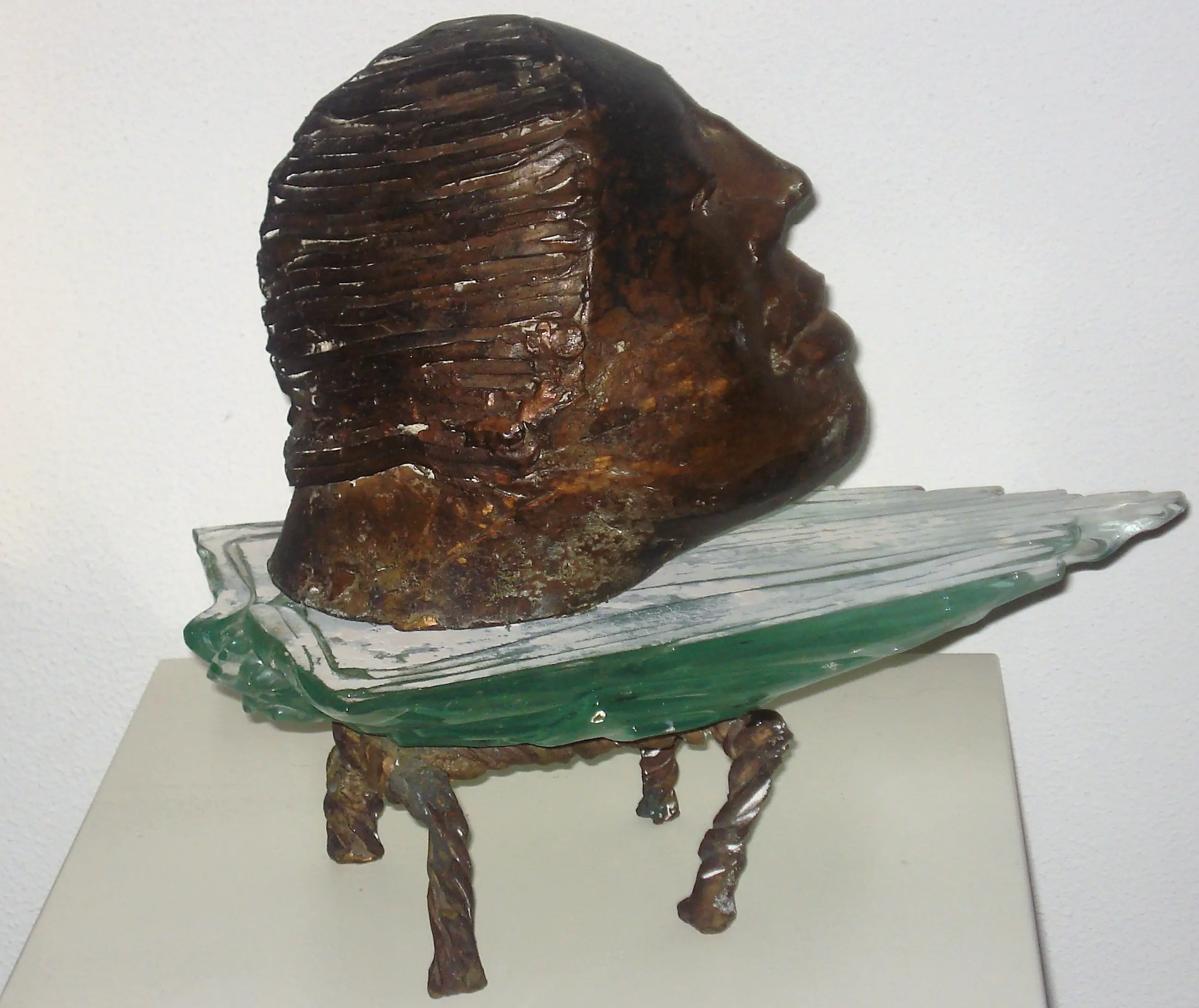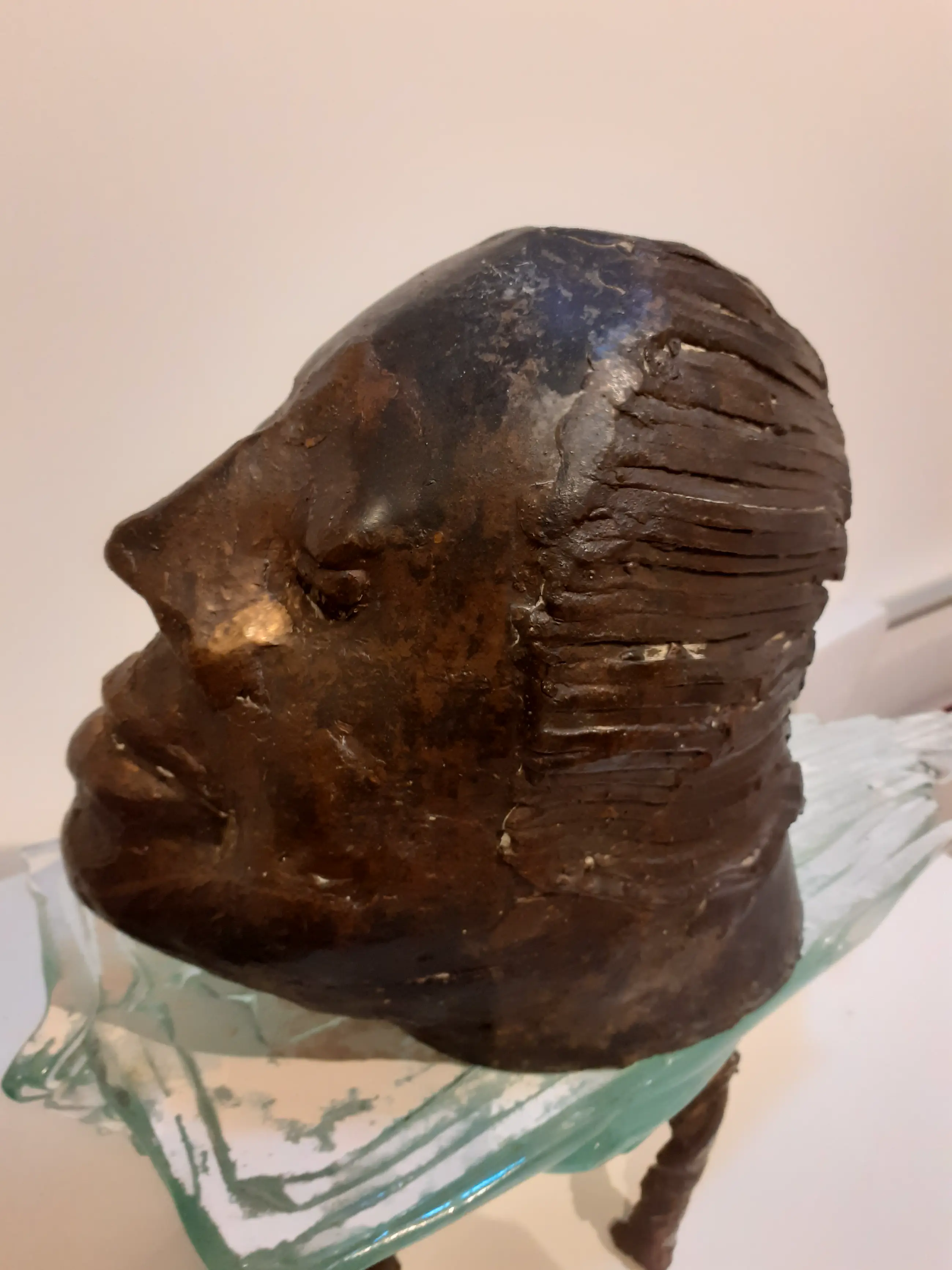 Bronzen hoofd op glazen sokkel met bronzen pootjes, uniek stuk Specificaties: