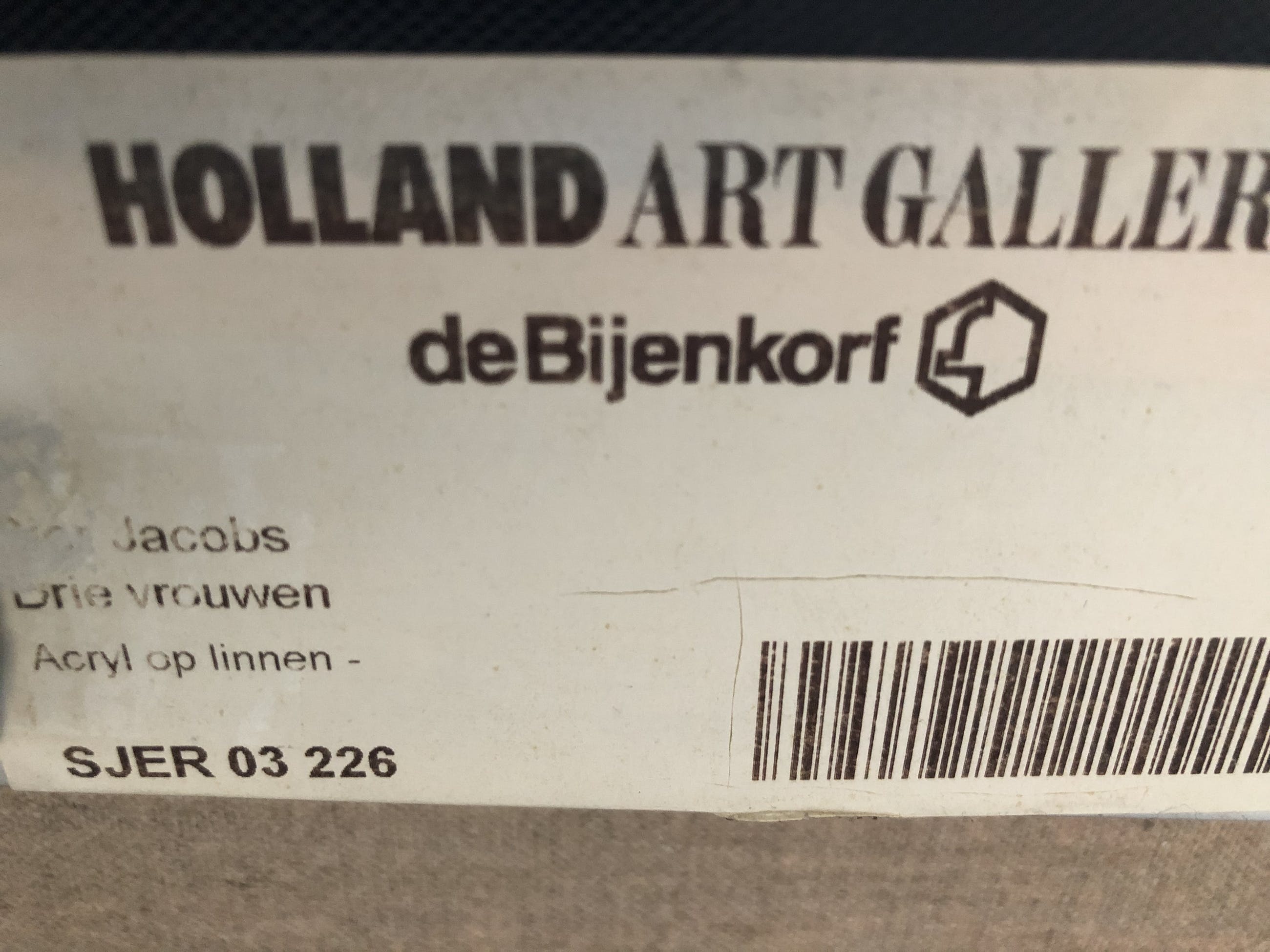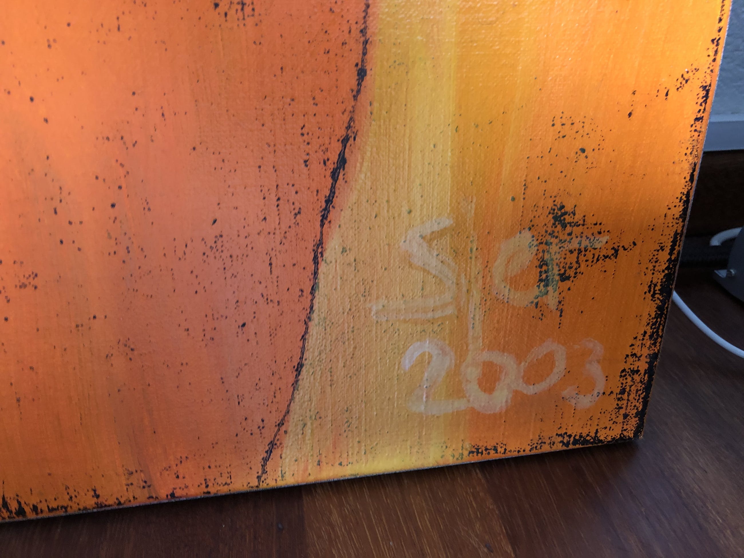 Doek van Sjer Jacobs in kleur oranje/bruin. Heeft altijd bij ons in de woonkamer gehangen. Samen met ander schilderij van Sjer Jacobs, ook uit 2003: Twee vrouwen. Ook dat bieden wij te koop aan.