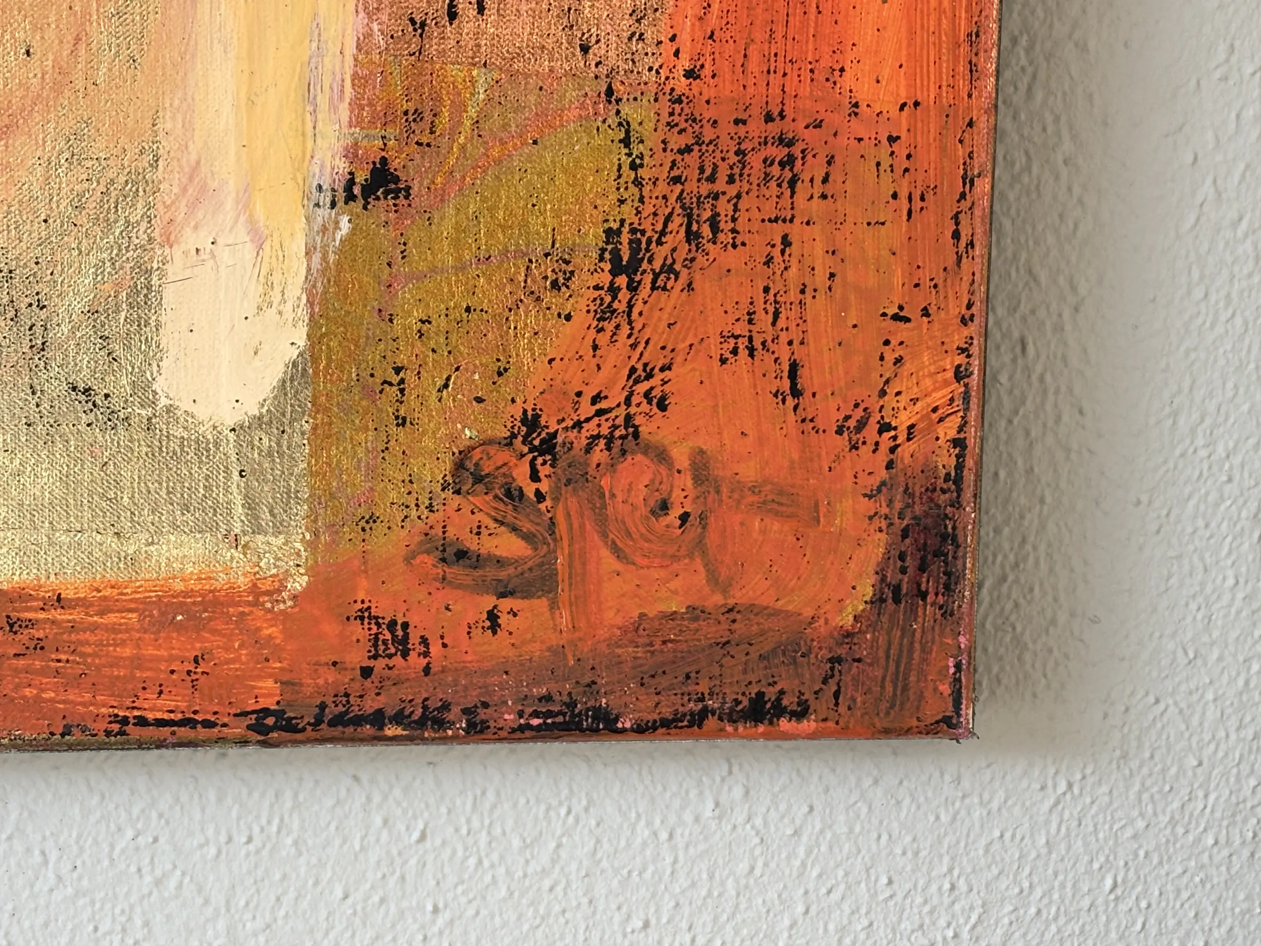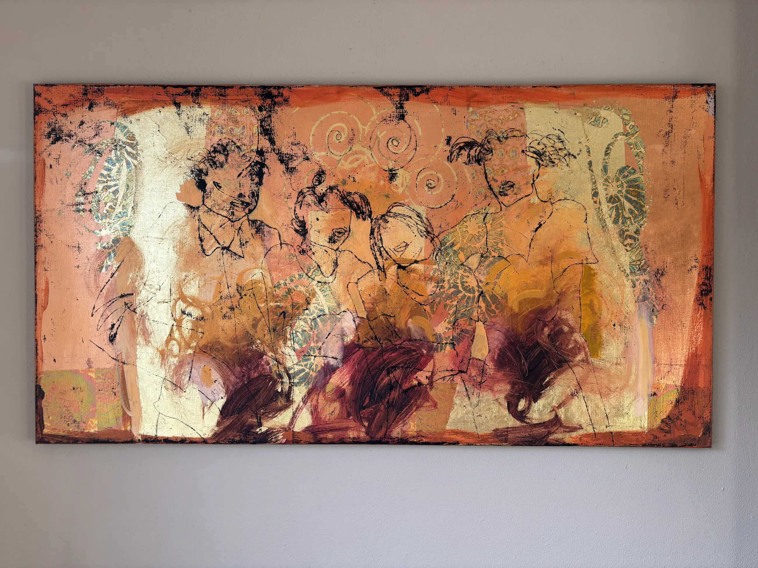 Dit werk toont een groep figuren in warme tinten oranje, rood en goud, met verfijnde lijnvoering en levendige textuur – kenmerkend voor zijn oeuvre.