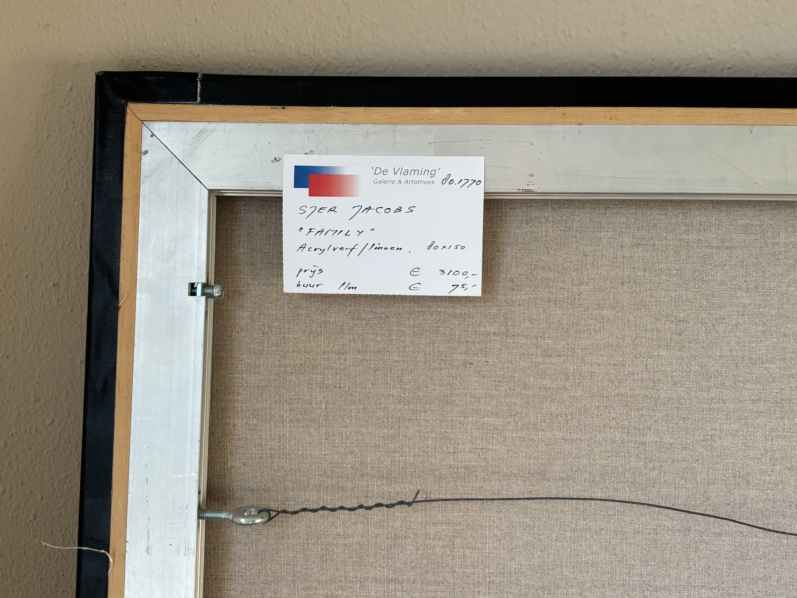 Prachtig groot schilderij van de Limburgse kunstenaar Sjer Jacobs (geb. 1947). Jacobs staat bekend om zijn expressieve en kleurrijke schilderstijl waarin mensfiguren en emoties centraal staan.