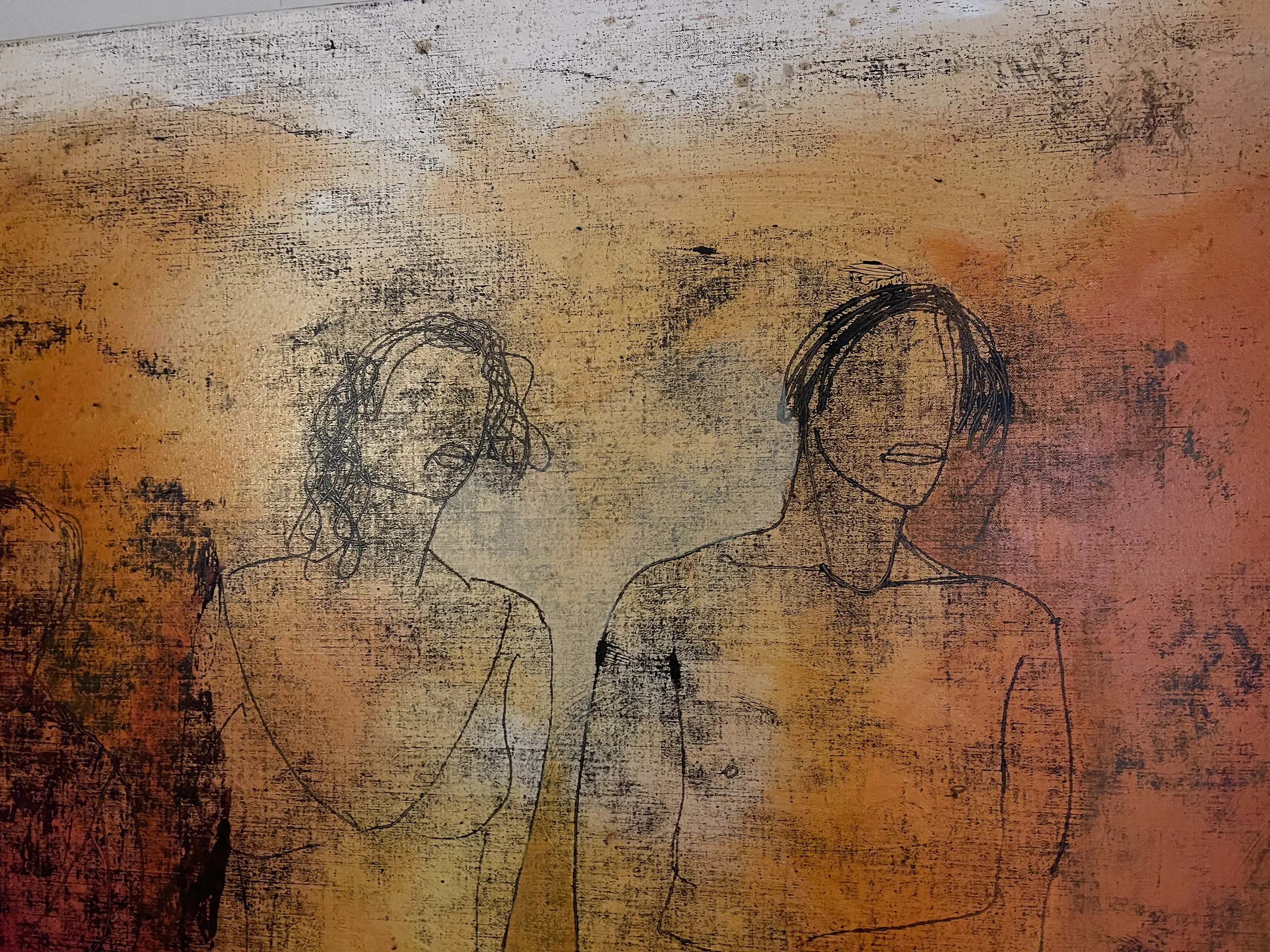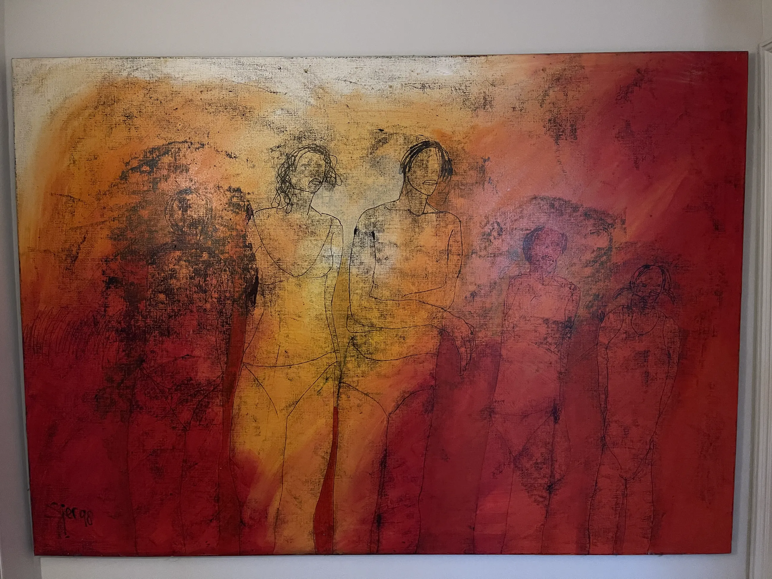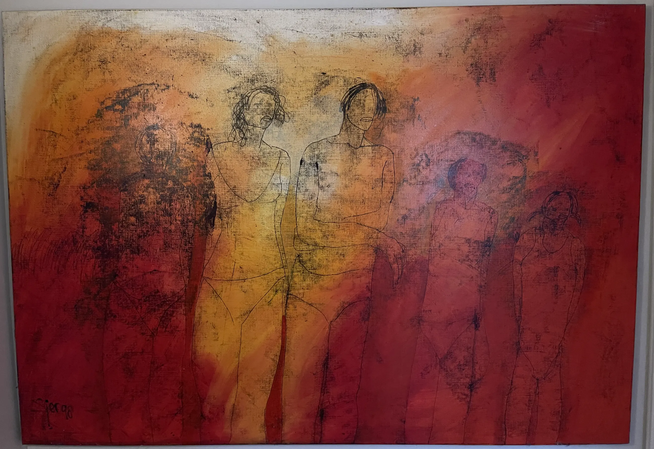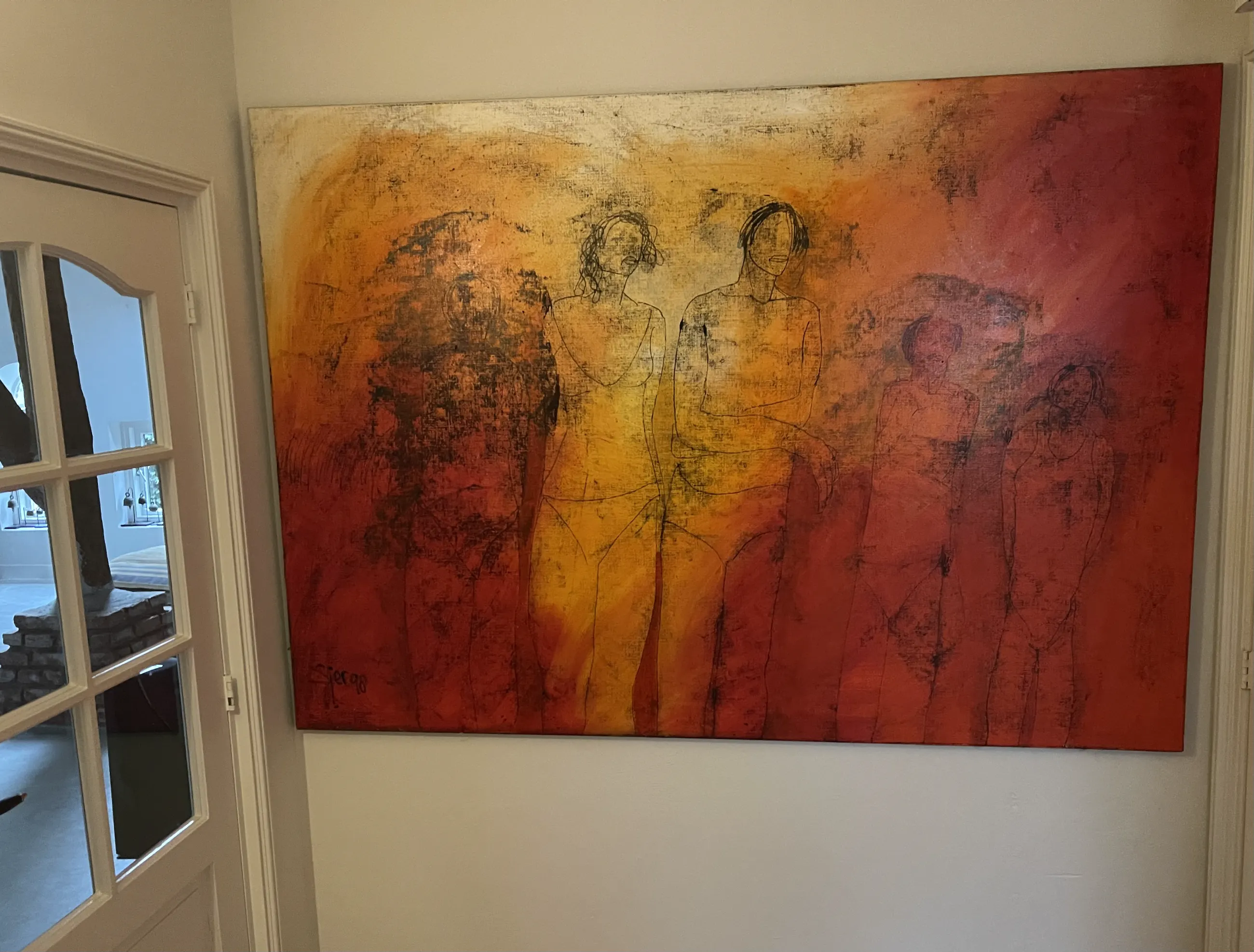 Figuratief schilderij, man vrouw en 3 kinderen voorstellende