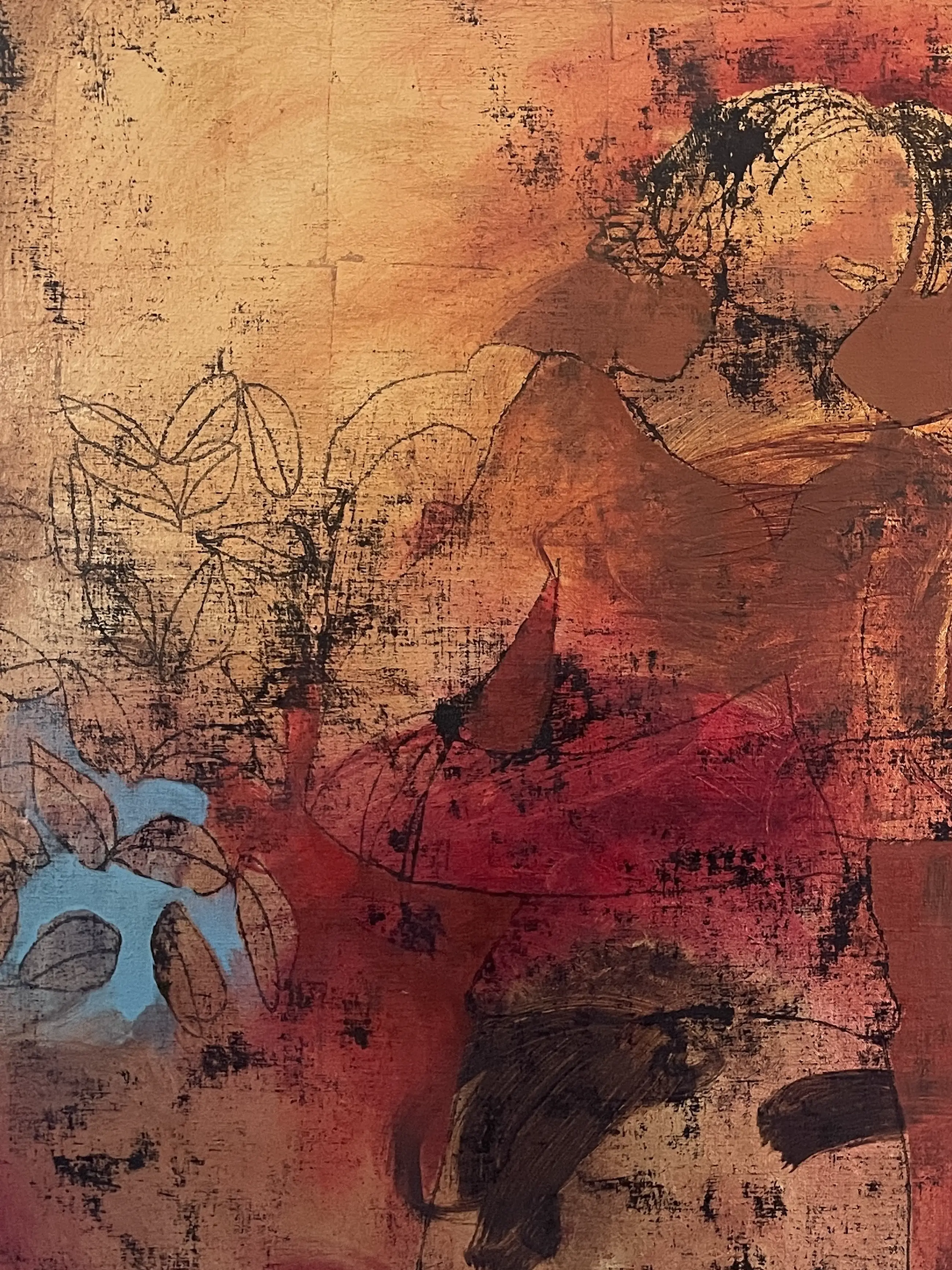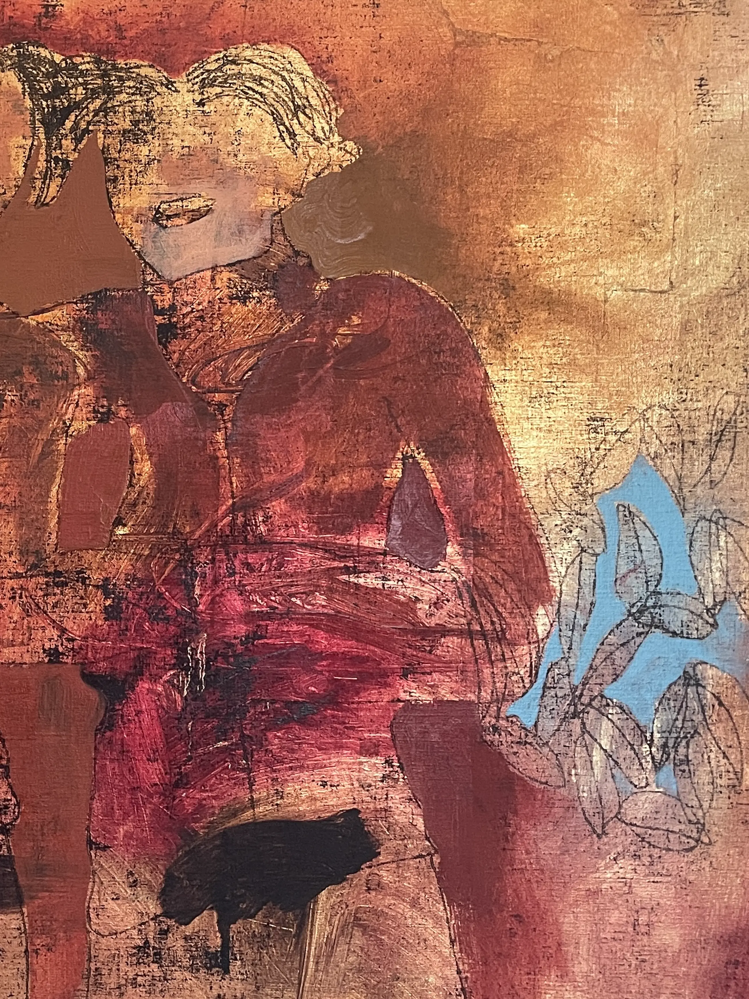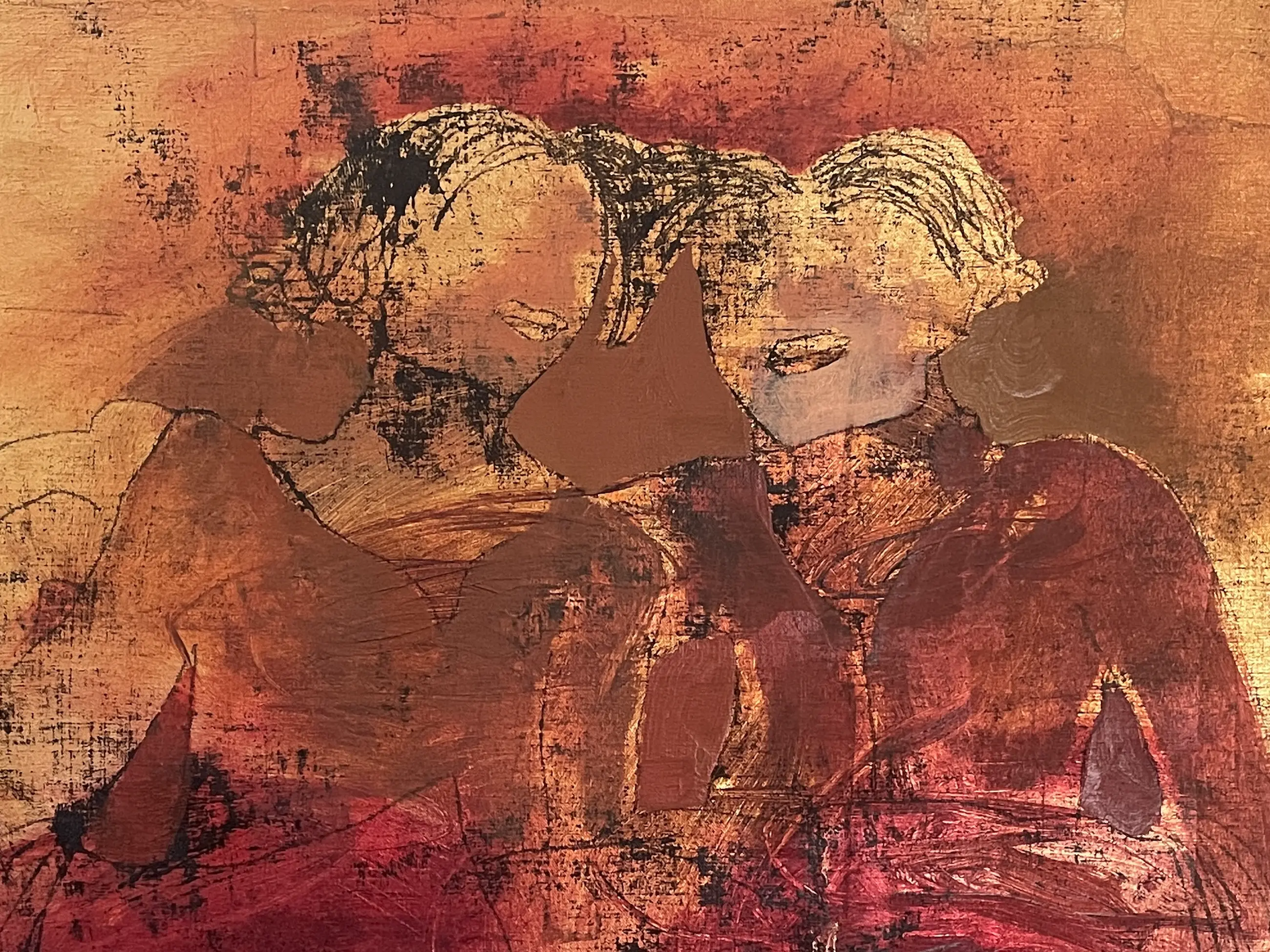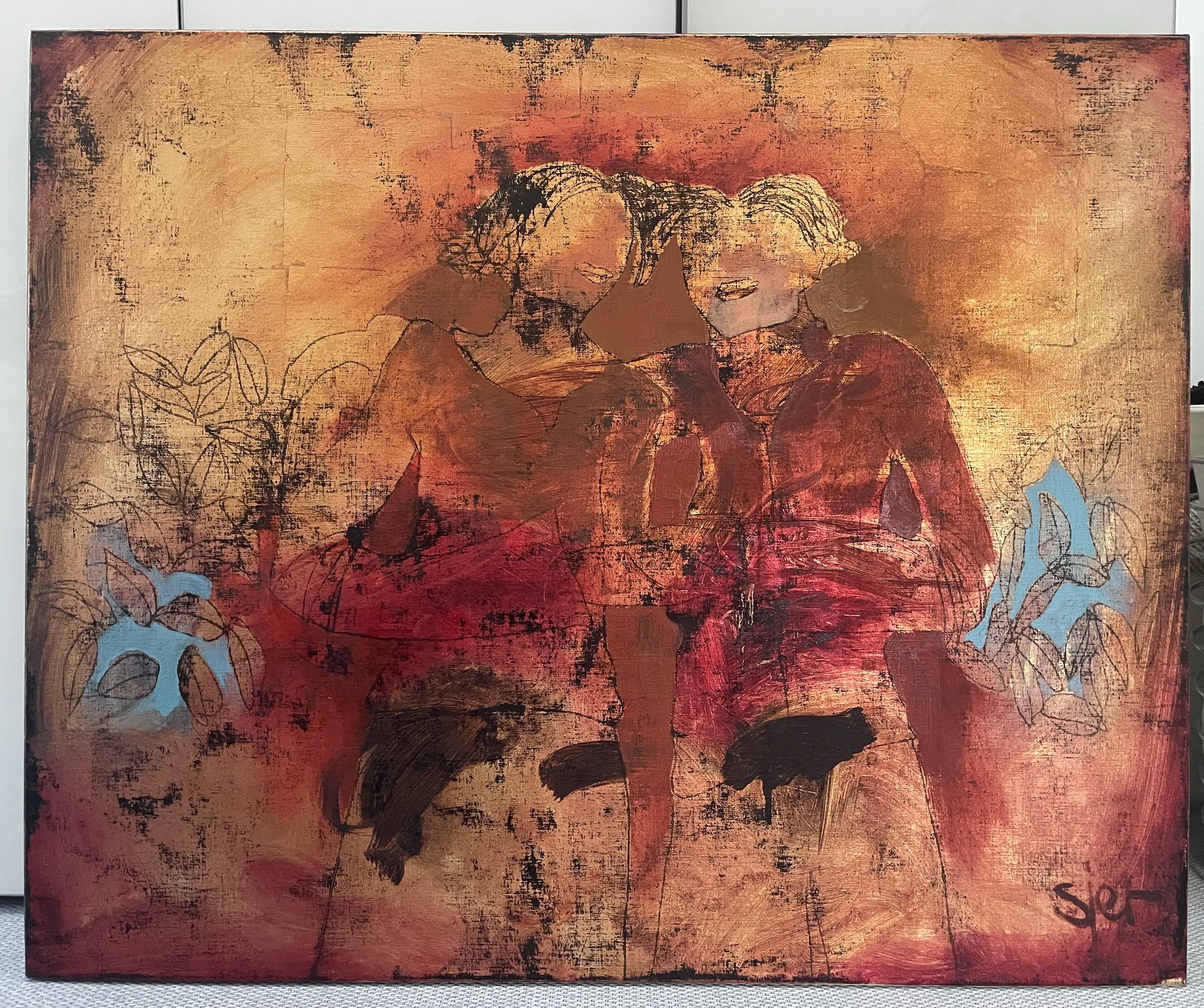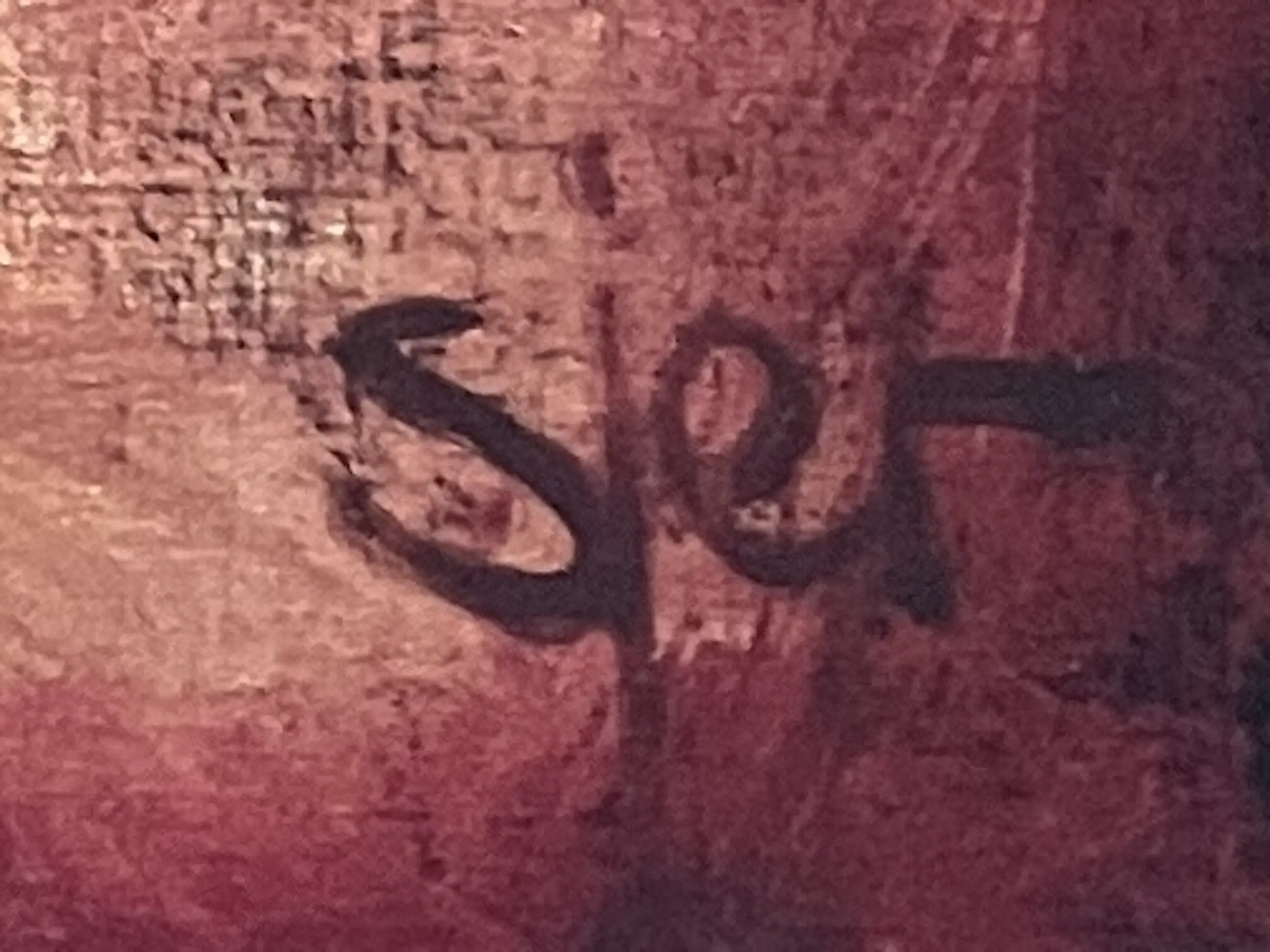 Man en vrouw gemonteerd op een lichtgewicht artelframe. Geen schade aan doek. Kleine acrylverfvlek op de achterkant van het canvas, zoals weergegeven op de vergrote foto.