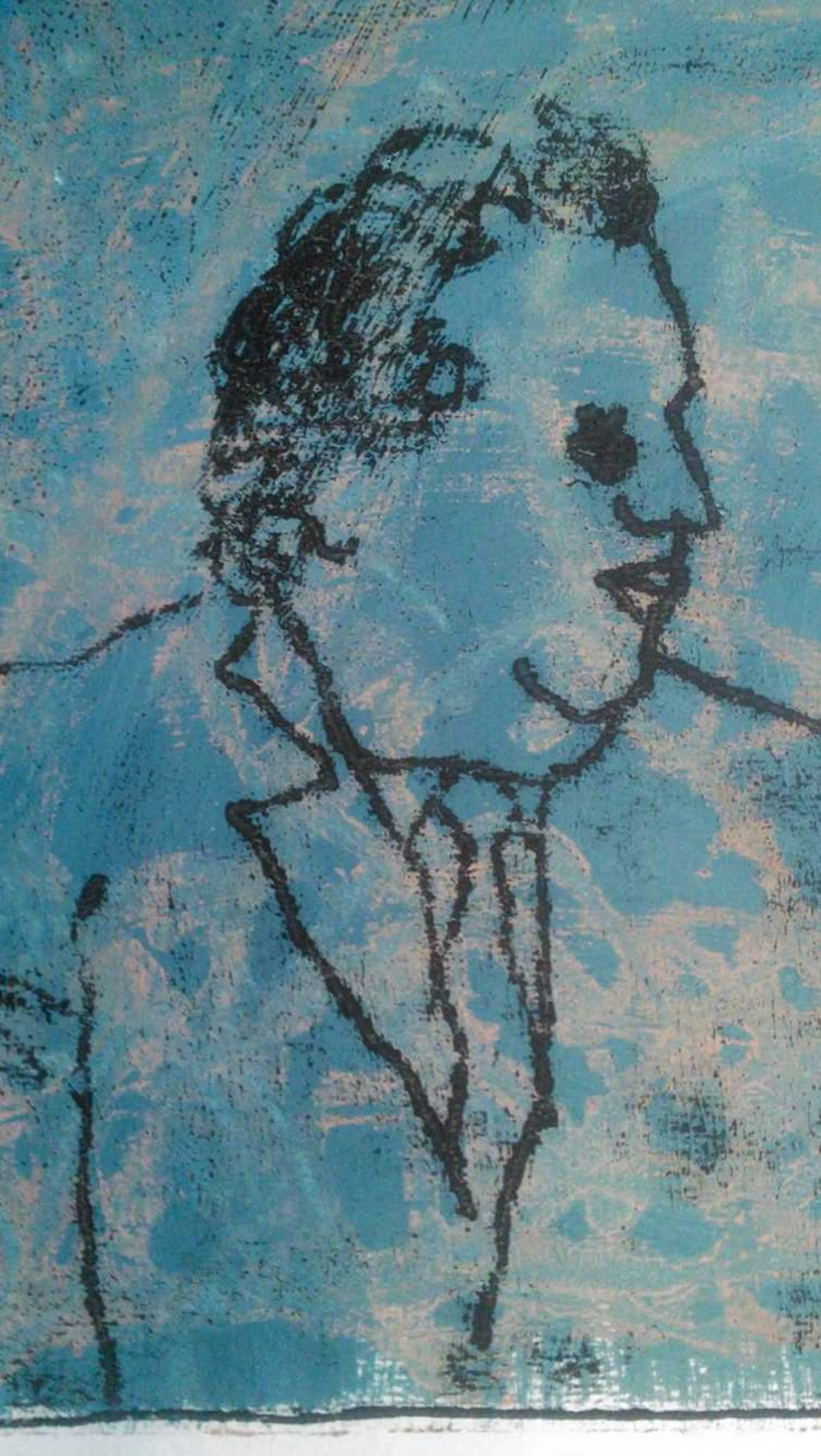 Eenmalige afdruk (unicum) op papier van een op glas of metaal geschilderde voorstelling, gemaakt als de verf nog nat is.Ingelijst 70 x 50 Beeldformaat 28 x 31 cmGesigneerd en gedateerd '97