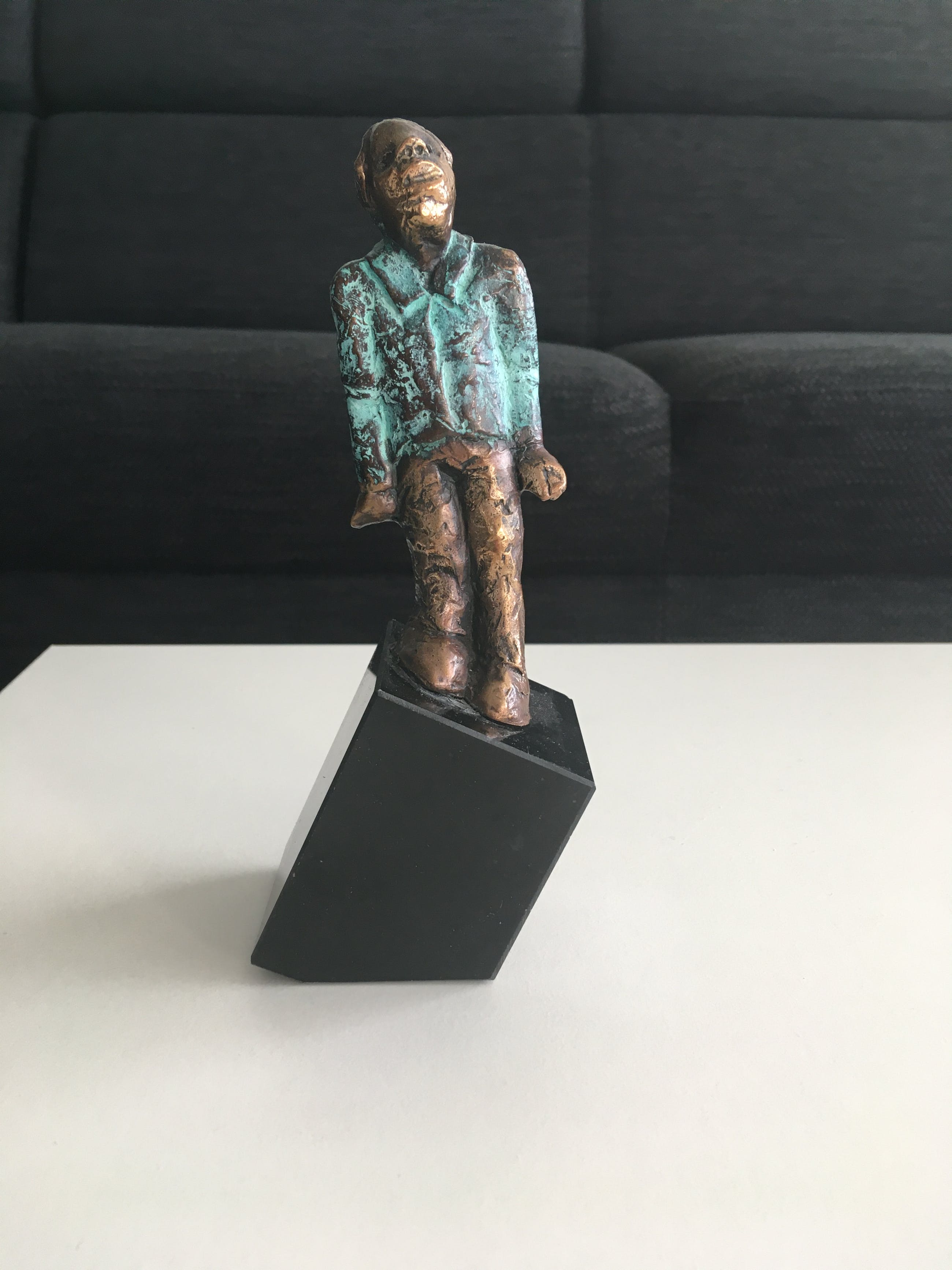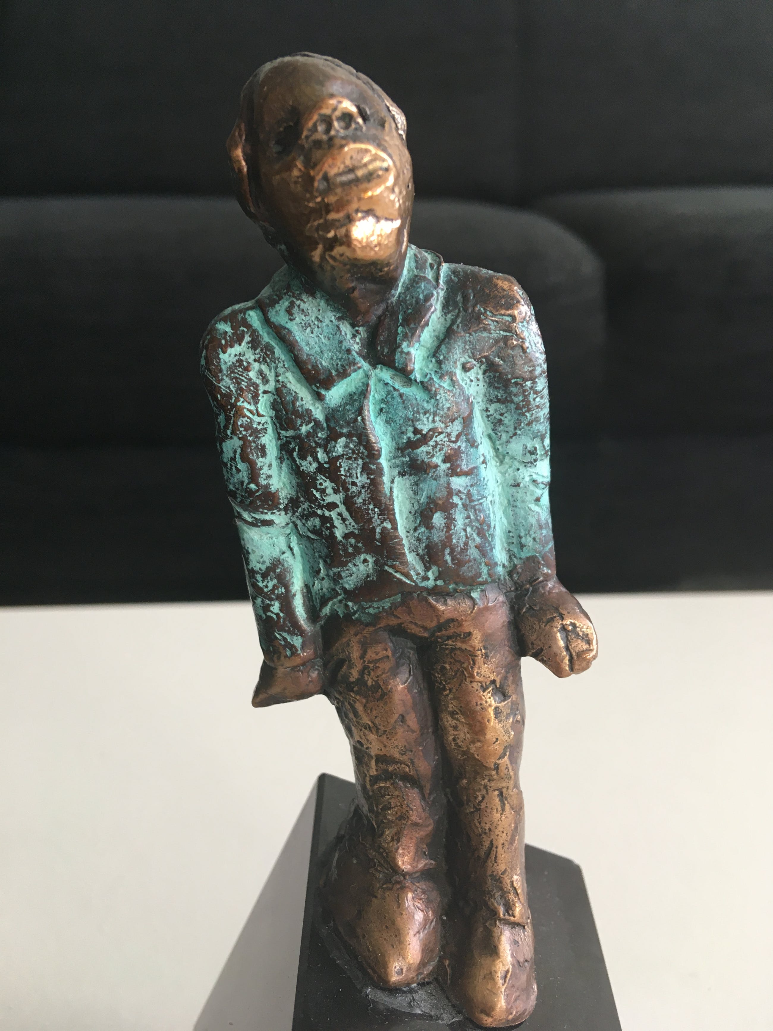 Fraai bronzen beeldje van de bekende Limburgse kunstanaar. Dit mannetje ( Menneke) in brons is typerend voor de stijl en het werk van Jacobs. De vermelde maat is inclusief marmeren sokkeltje waarop het beeldje balanceert ( het Menneke zelf is 12*6*4 cm). Buitengewoon fraai bronzen beeldje op zoek naar een nieuw huis.