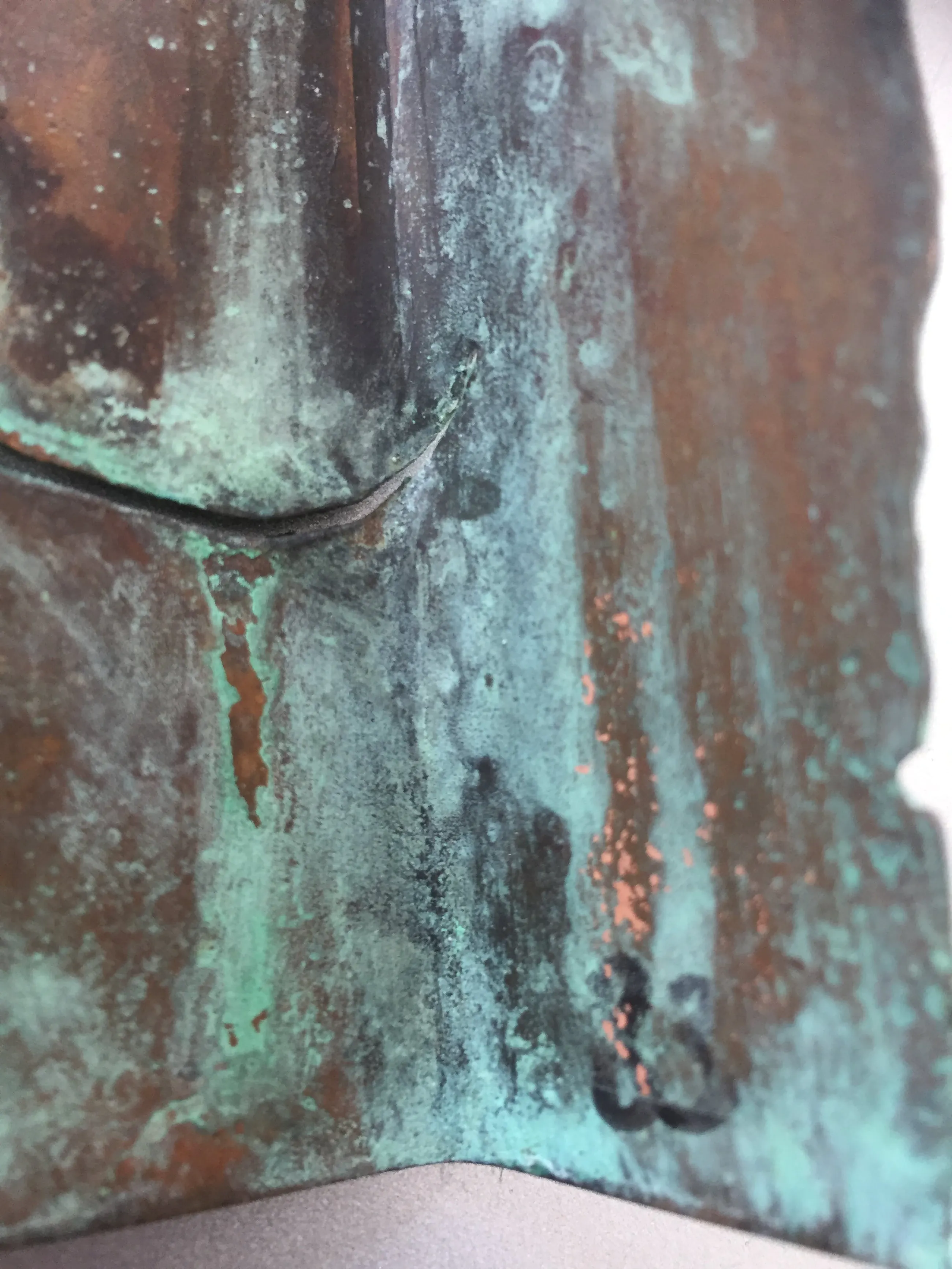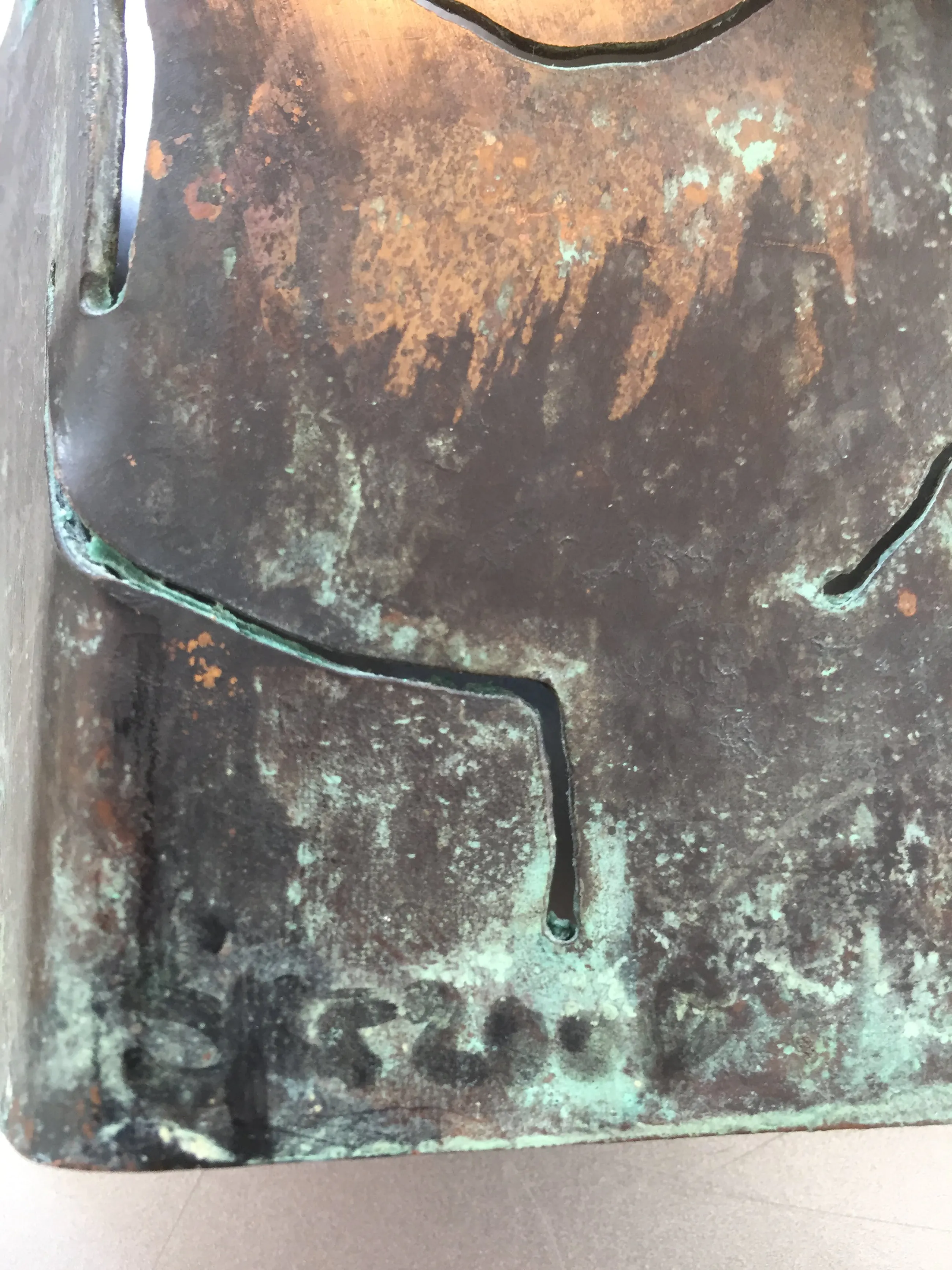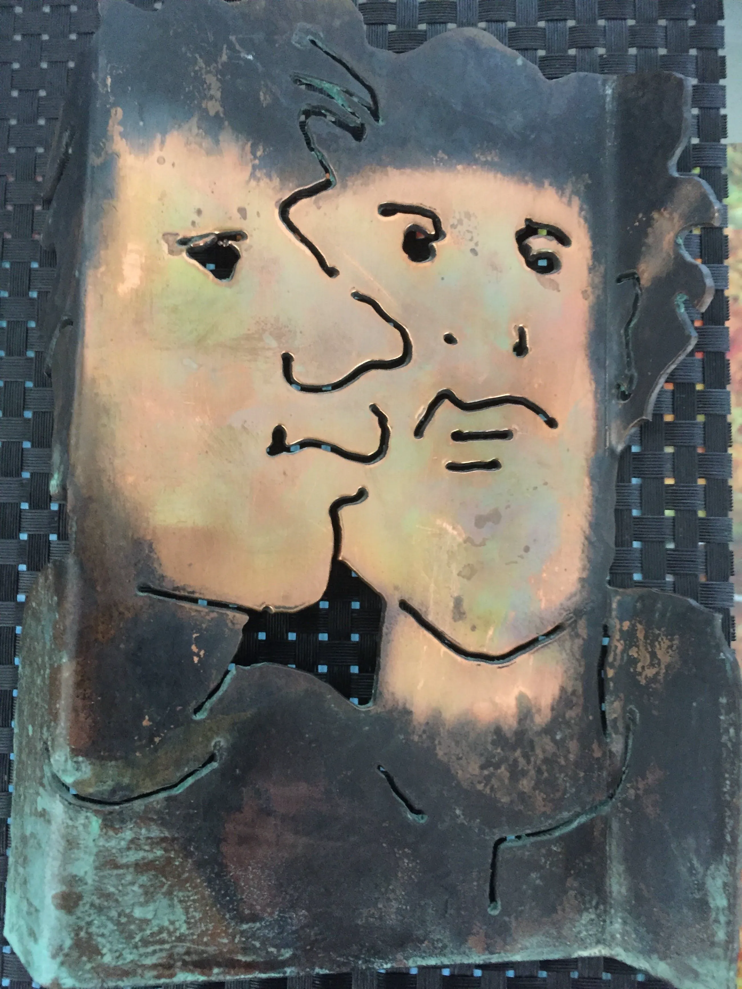 Naast de bekende keramische beelden van Sjer Jacobs maakt hij ook metalen objecten zoals dit Koperen raamobject van koperplaat uitgesneden vriend en vriendin met extra detaillering door verkleuring van glanzend roodkoper tot zwart met groene nuances
