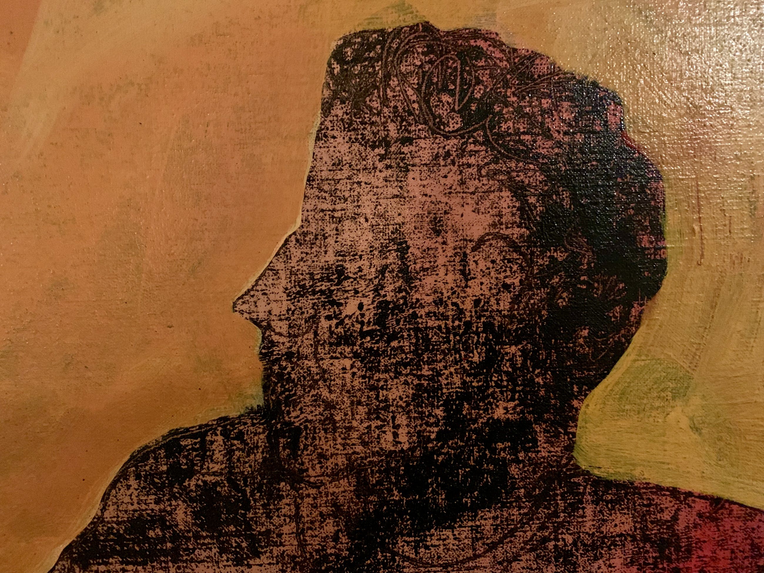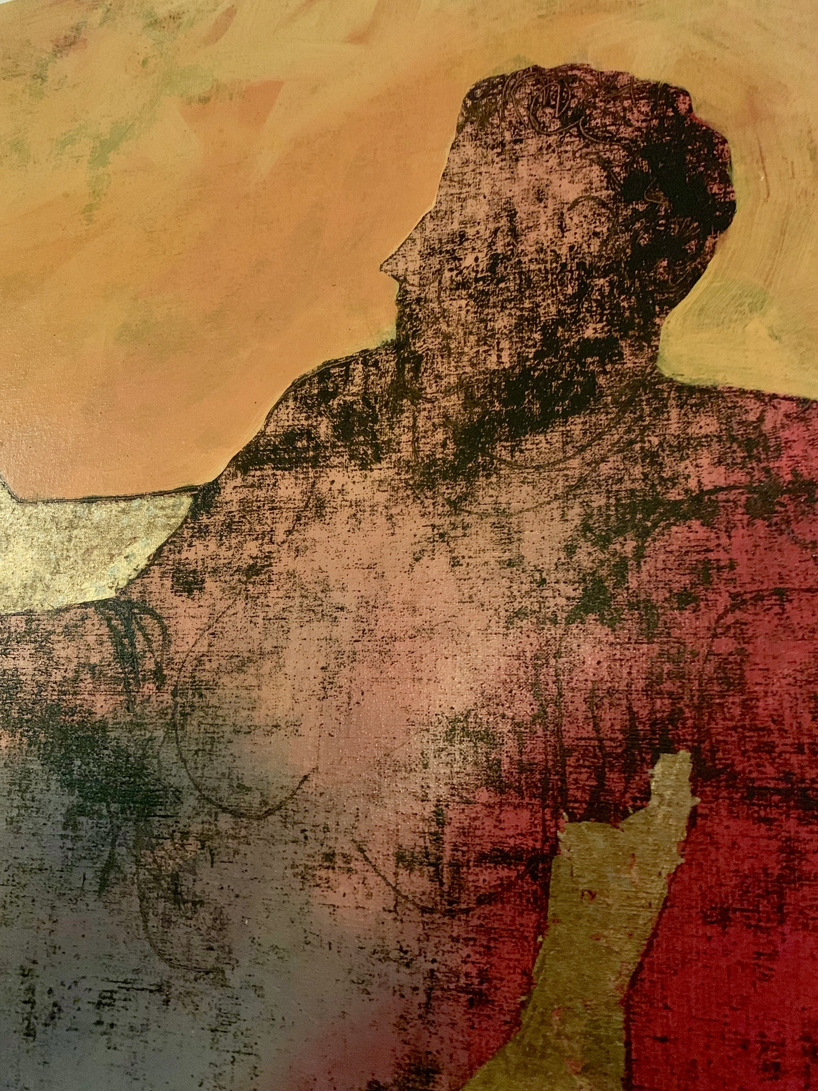 Sjer heeft een dame afgebeeld op een sofa. Het betreft een olieverfdoek, waar verschillende technieken zijn uitgevoerd. Zie hiertoe de detailfoto's. Hoofdkleuren zijn rood, oud roze, goud en gemêleerd oranje.