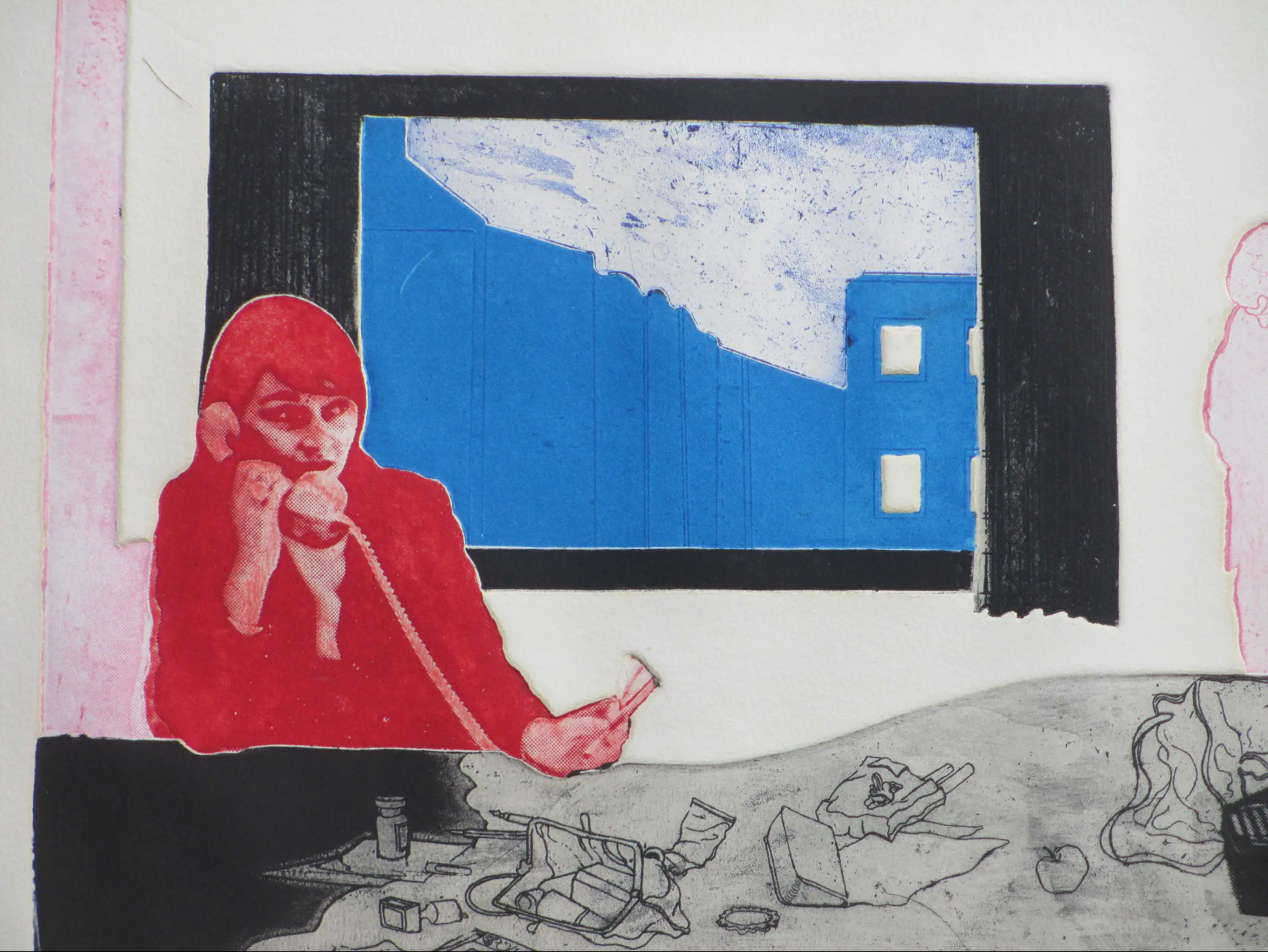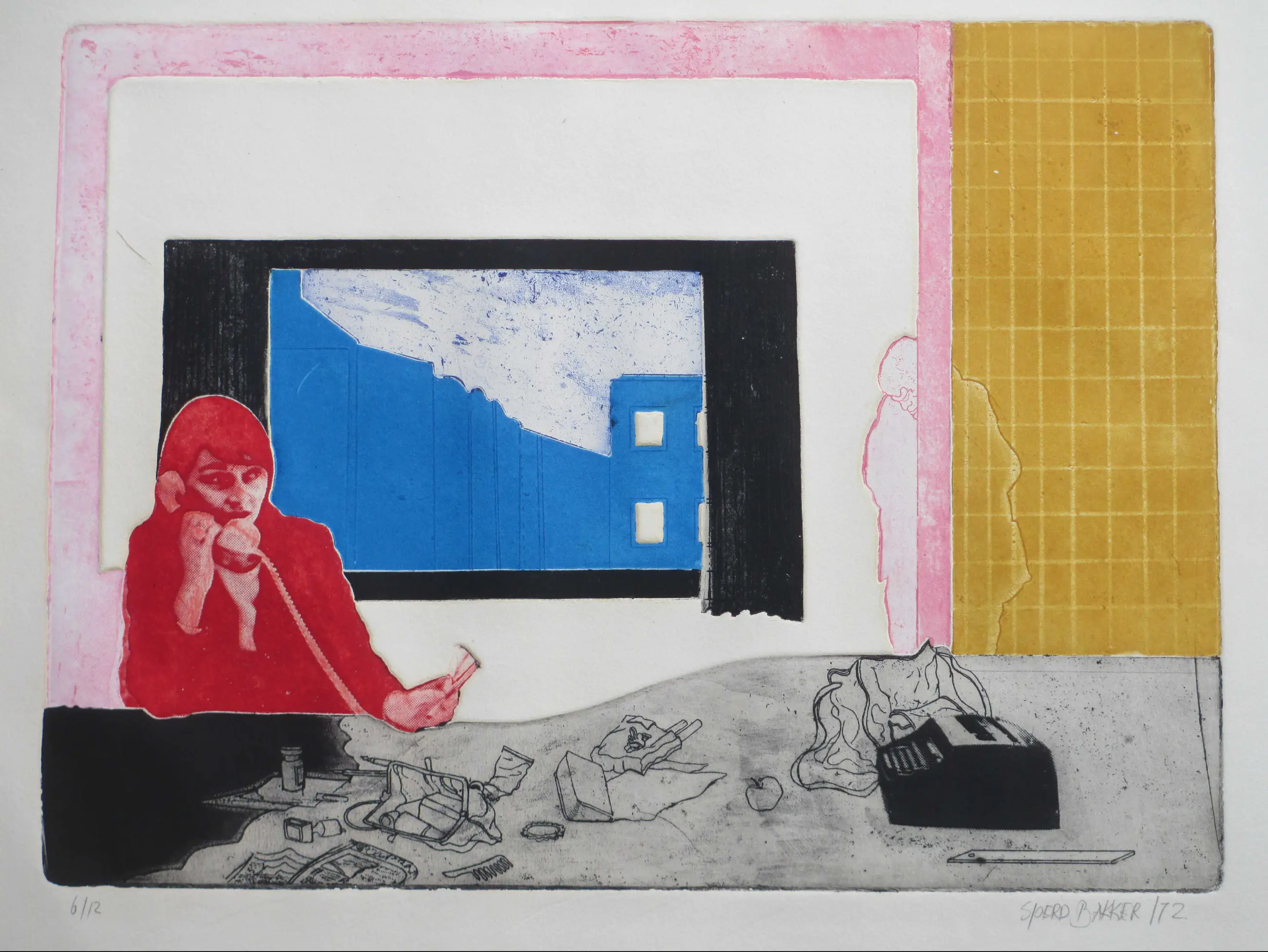 Kleurets in kleine oplage door Sjoerd Bakker Voorstelling van een vrouw aan de lijn voor een tafel met voorwerpen in een bijzondere scene Losbladig, beeldmaat 33x44, bladmaat 50x65 Gesigneerd en gedateerd in potlood r.o.: 'Sjoerd Bakker /72' Genummerd in potlood l.o.: '6/12' Fraaie diepdruk (zie achterzijde) Authenticiteit volledig gegarandeerd