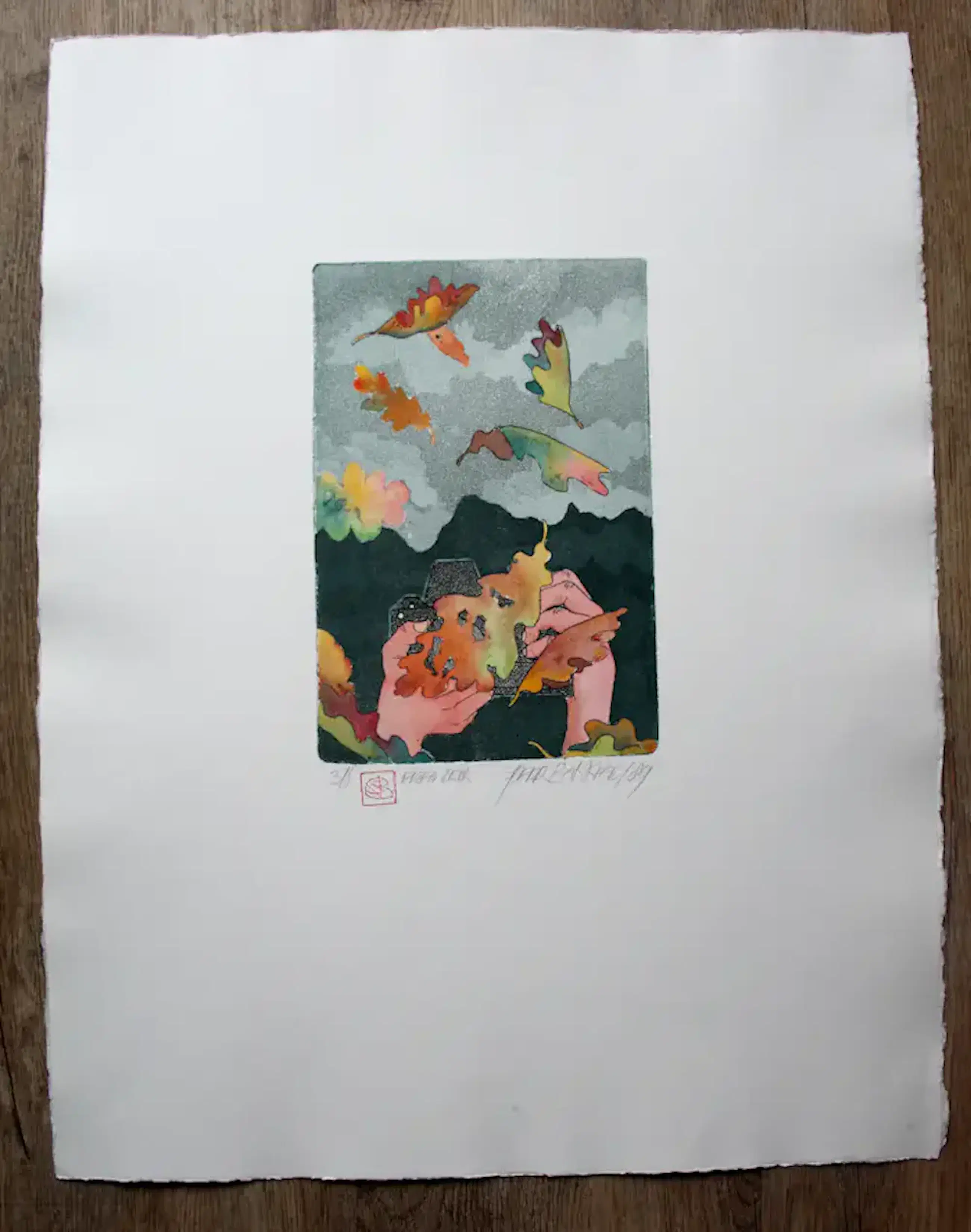 Ets van Sjoerd Bakker Jaar: 1989. Nummer: 3/6. Titel: herfstbladeren. Afmetingen blad: H65 x b50.5cm. Afmetingen voorstelling: H28x b19 cm. Het werk is rechts onder, met potlood, gesigneerd door de kunstenaar. De authenticiteit van het aangeboden werk wordt volledig gegarandeerd. Een certificaat van echtheid kan, op aanvraag worden gemaild.