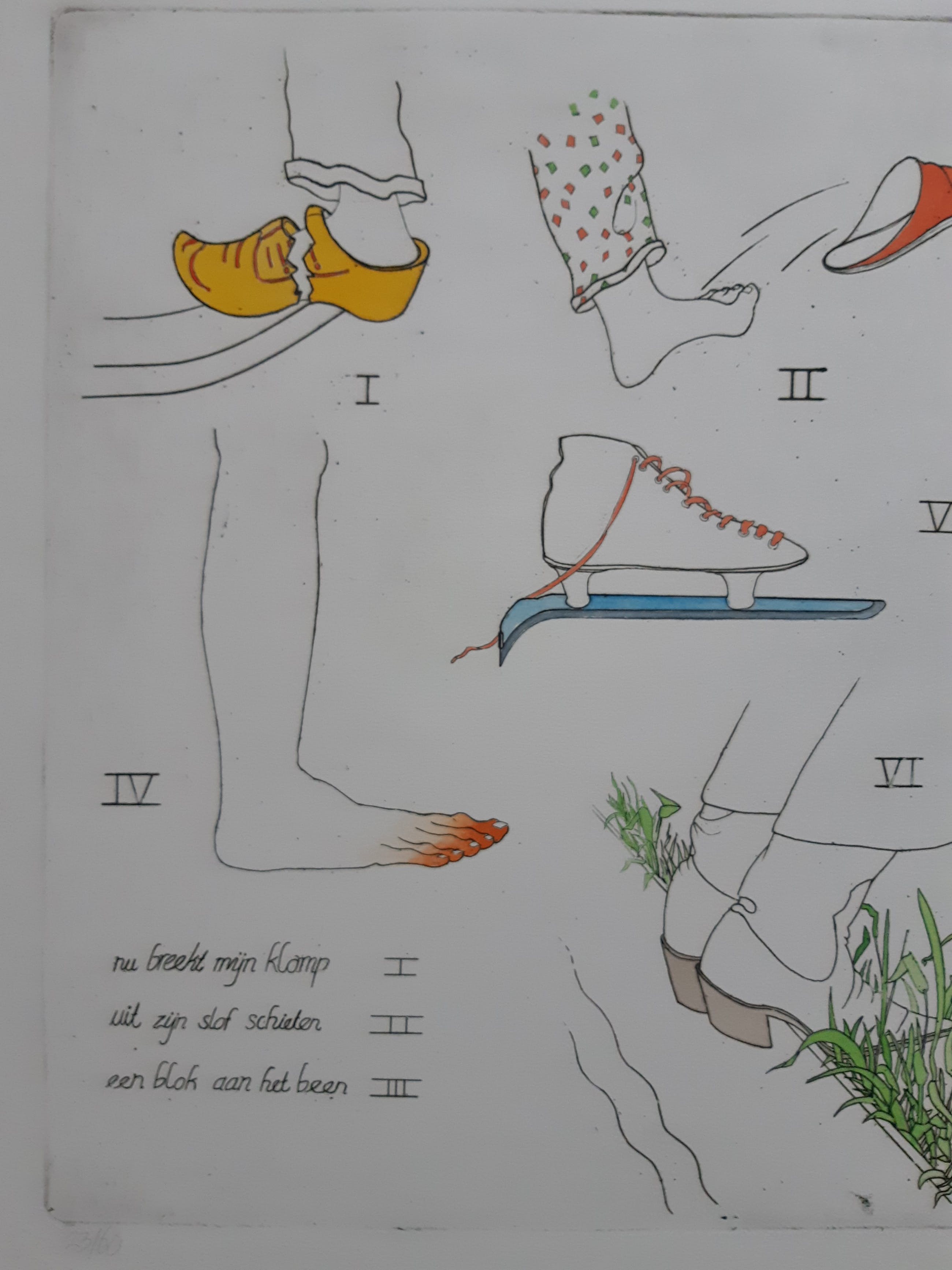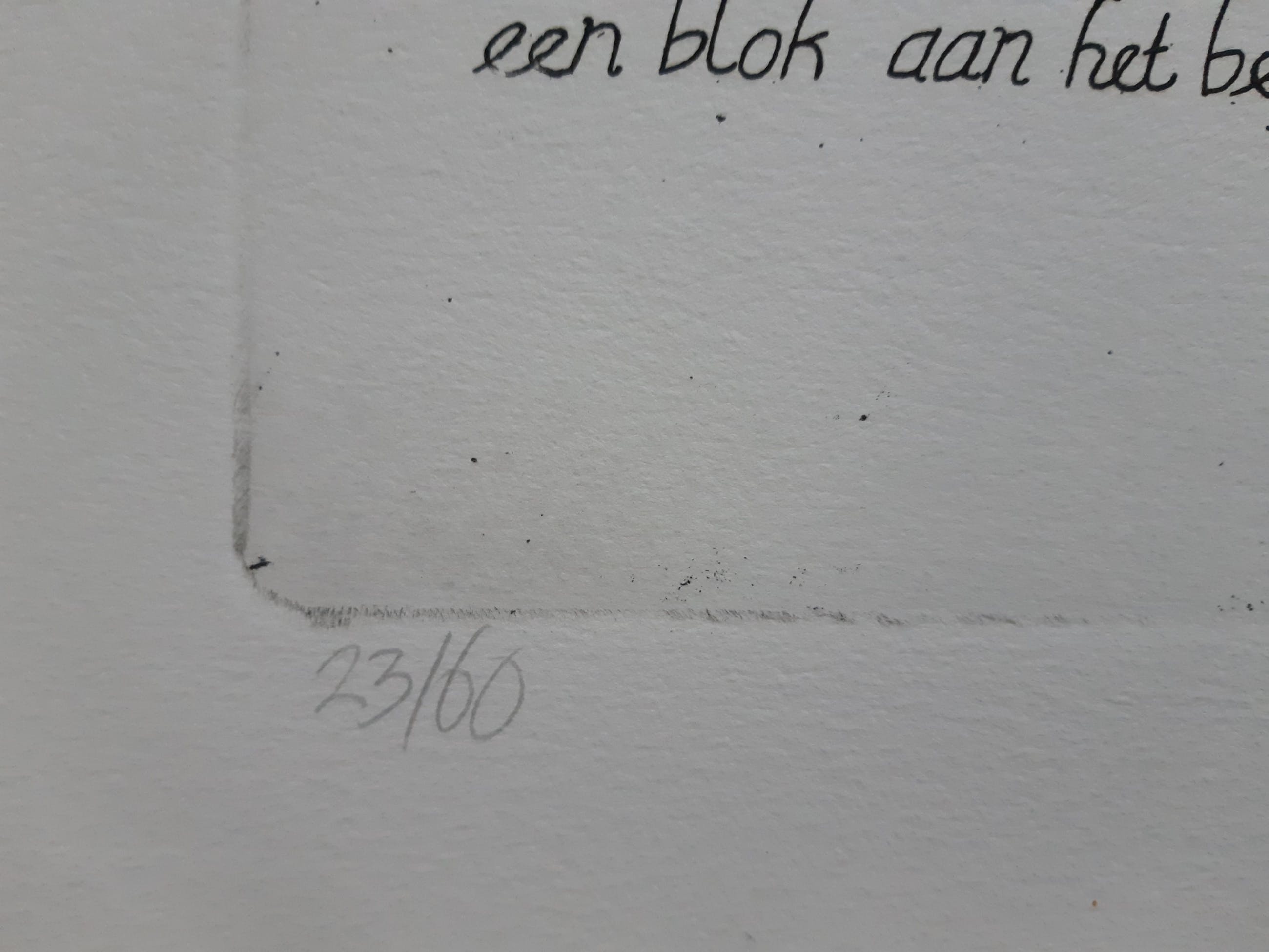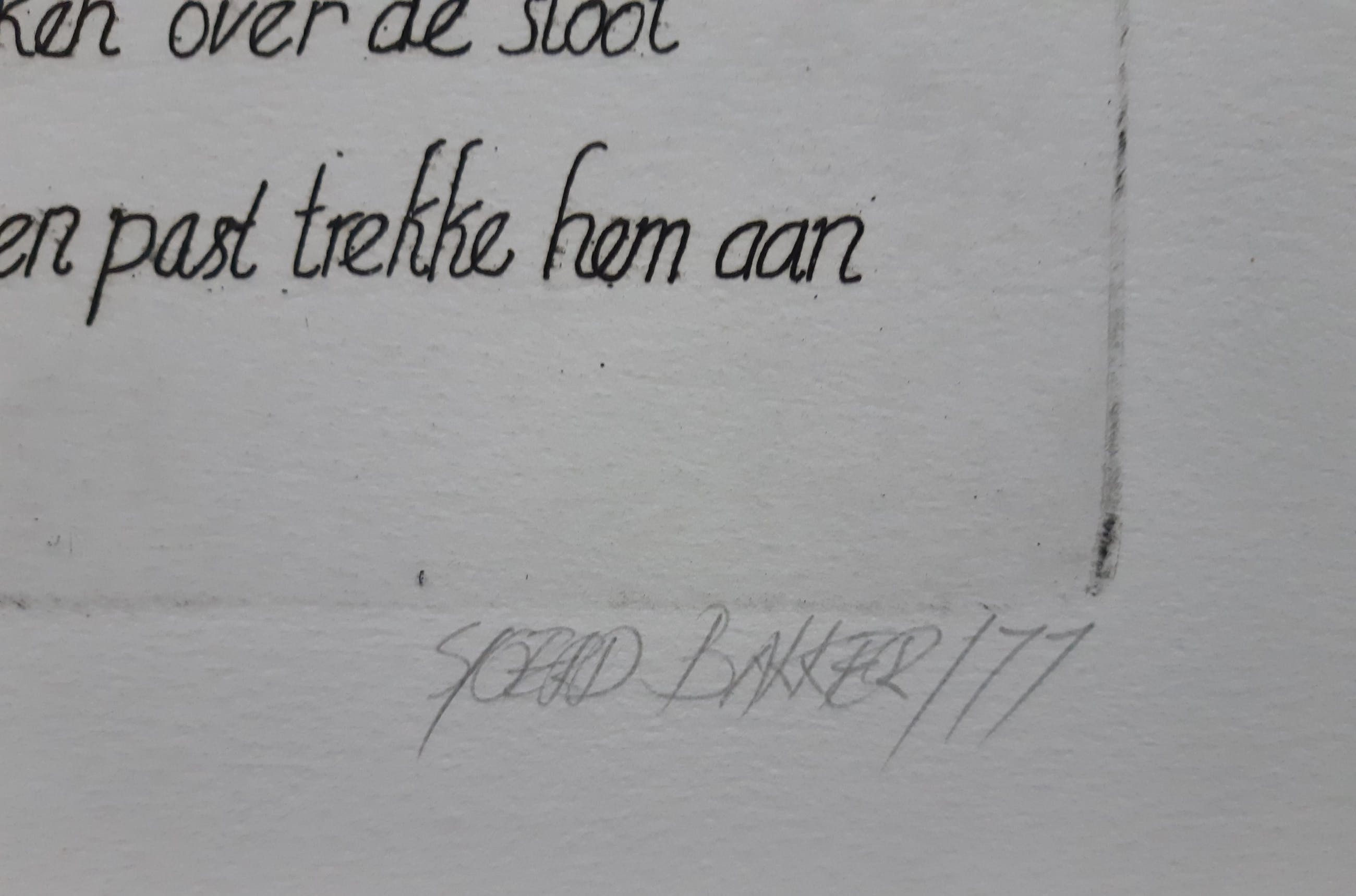 Kleurenets van Sjoerd Bakker zonder titel. De ets op geschept papier is met potlood gesigneerd, gedateerd 1977 en genummerd 23 / 60. De afbeelding meet 49 x 63 cm. De ets is in uitstekende conditie. Het werk kan zonder kosten worden opgehaald in Breda of op kosten van de koper aangetekend worden verzonden in een stevige koker.