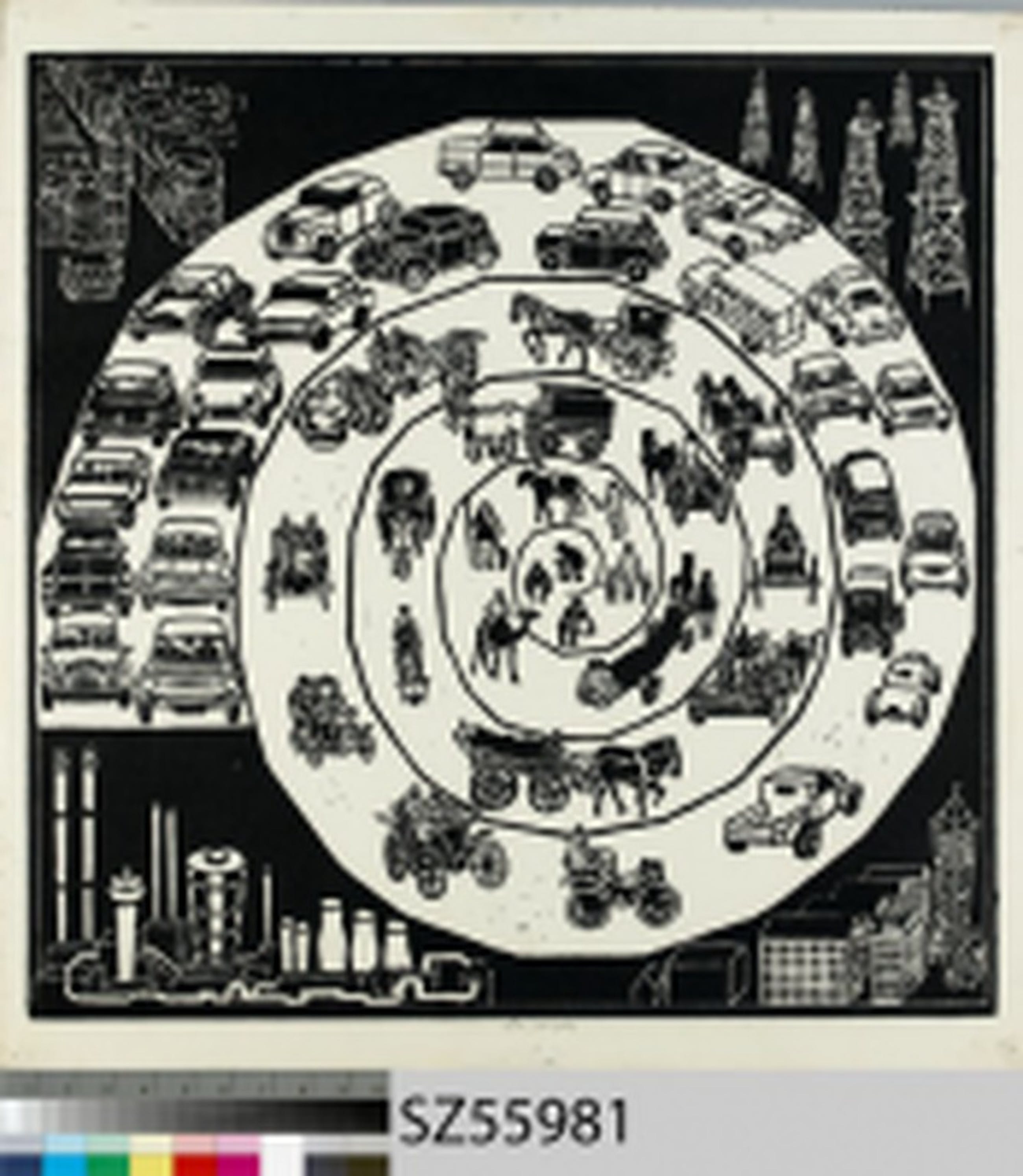 Ideaal voor de autoliefhebbers : van mens aap via paard en wagen tot aan Peugeot 404.
