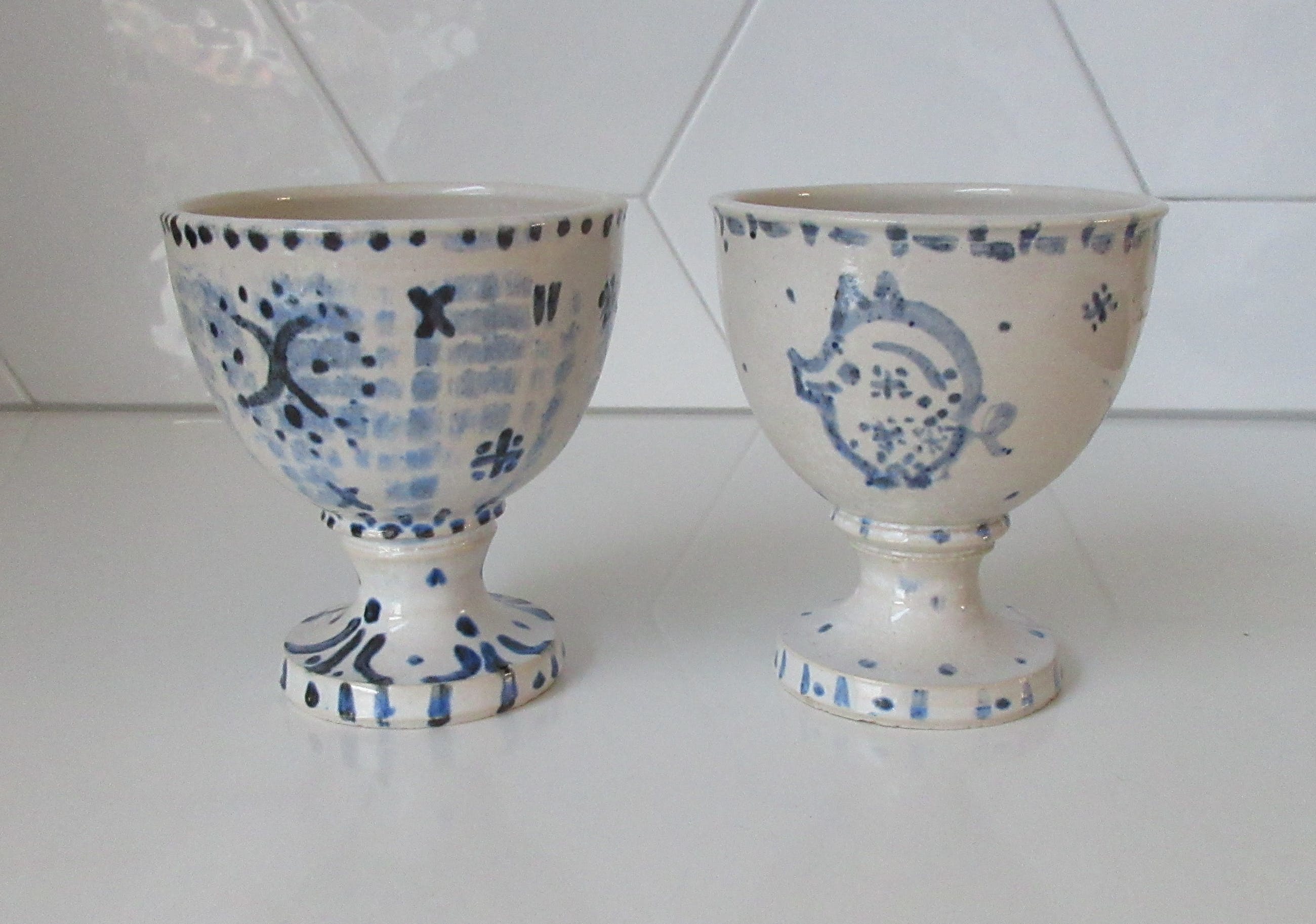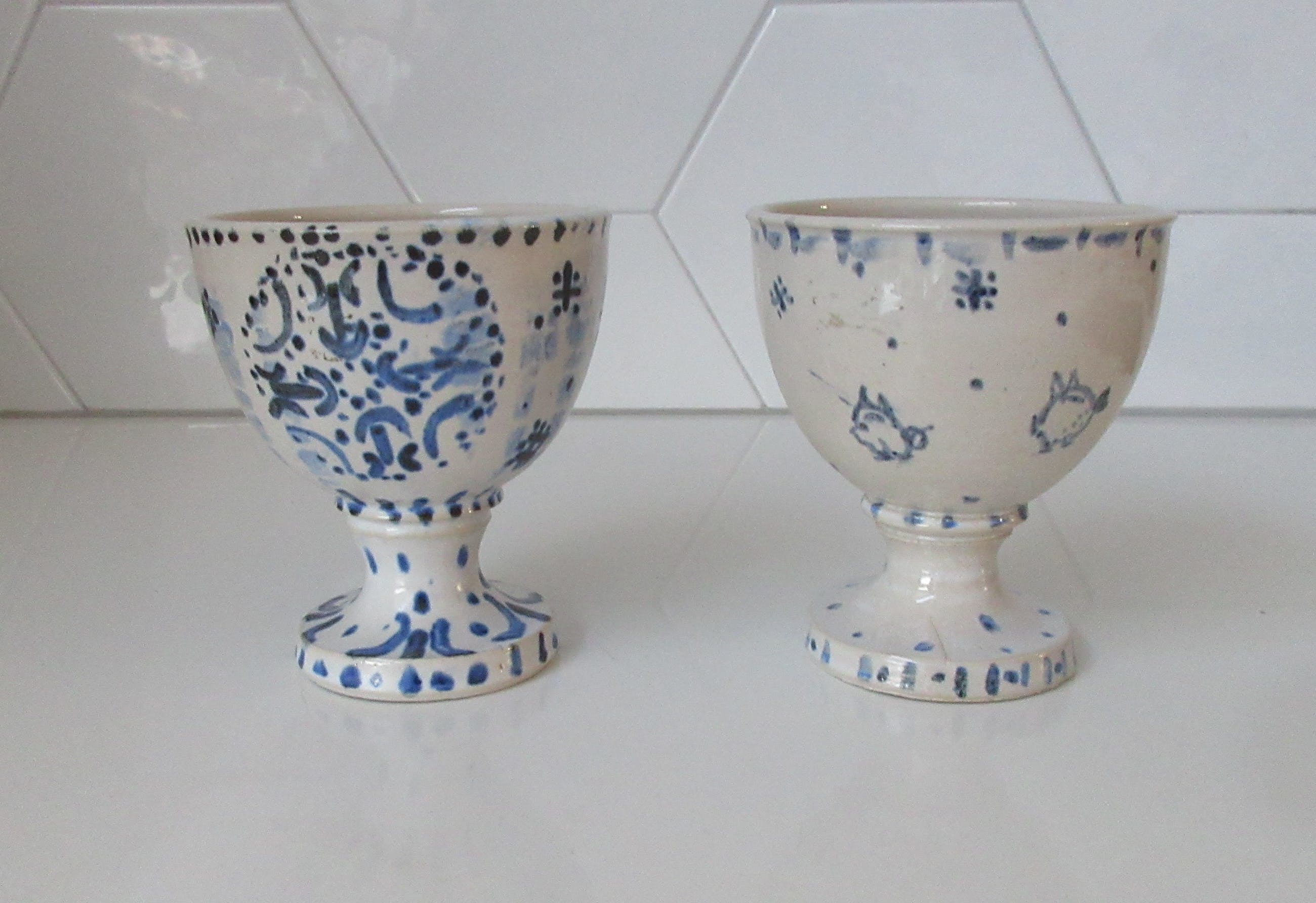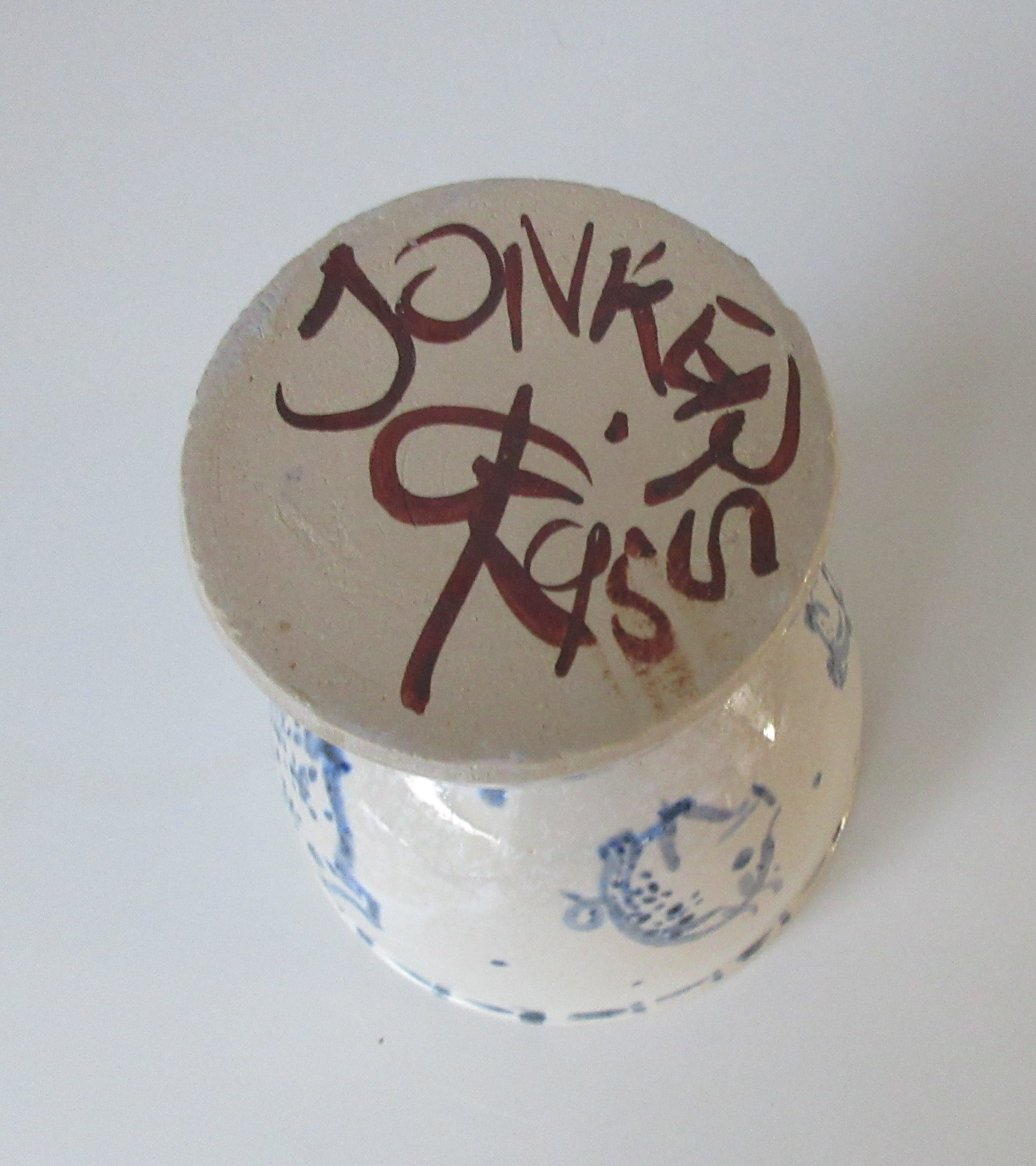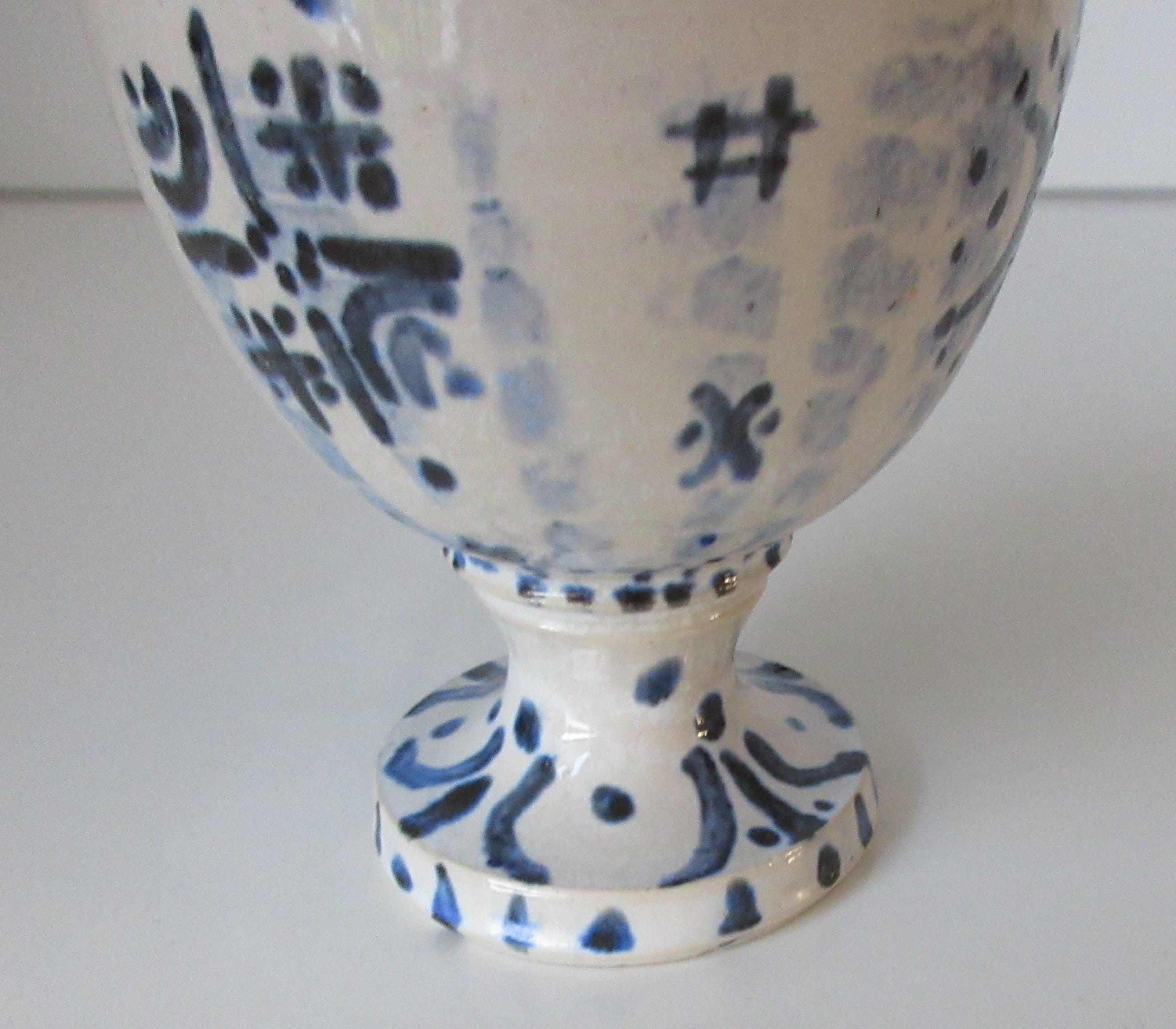 Twee Studio Keramische blauw witte bokalen van Sjoerd Jonkers uit Amsterdam. De een is gedecoreerd met biggetjes en de ander heeft een fantasie decoratie. Aan de onderzijde met de hand gesigneerd en gedateerd.
