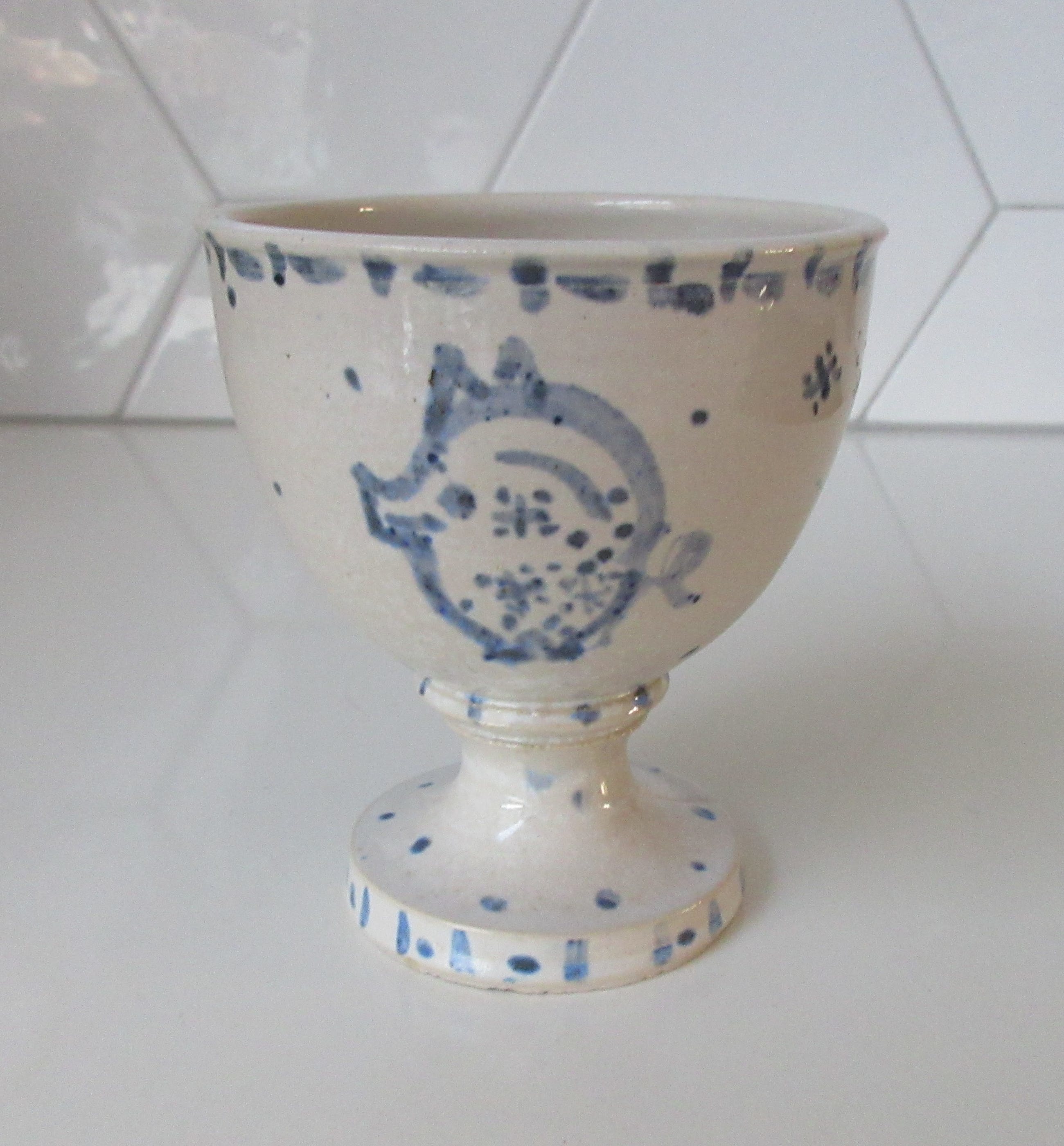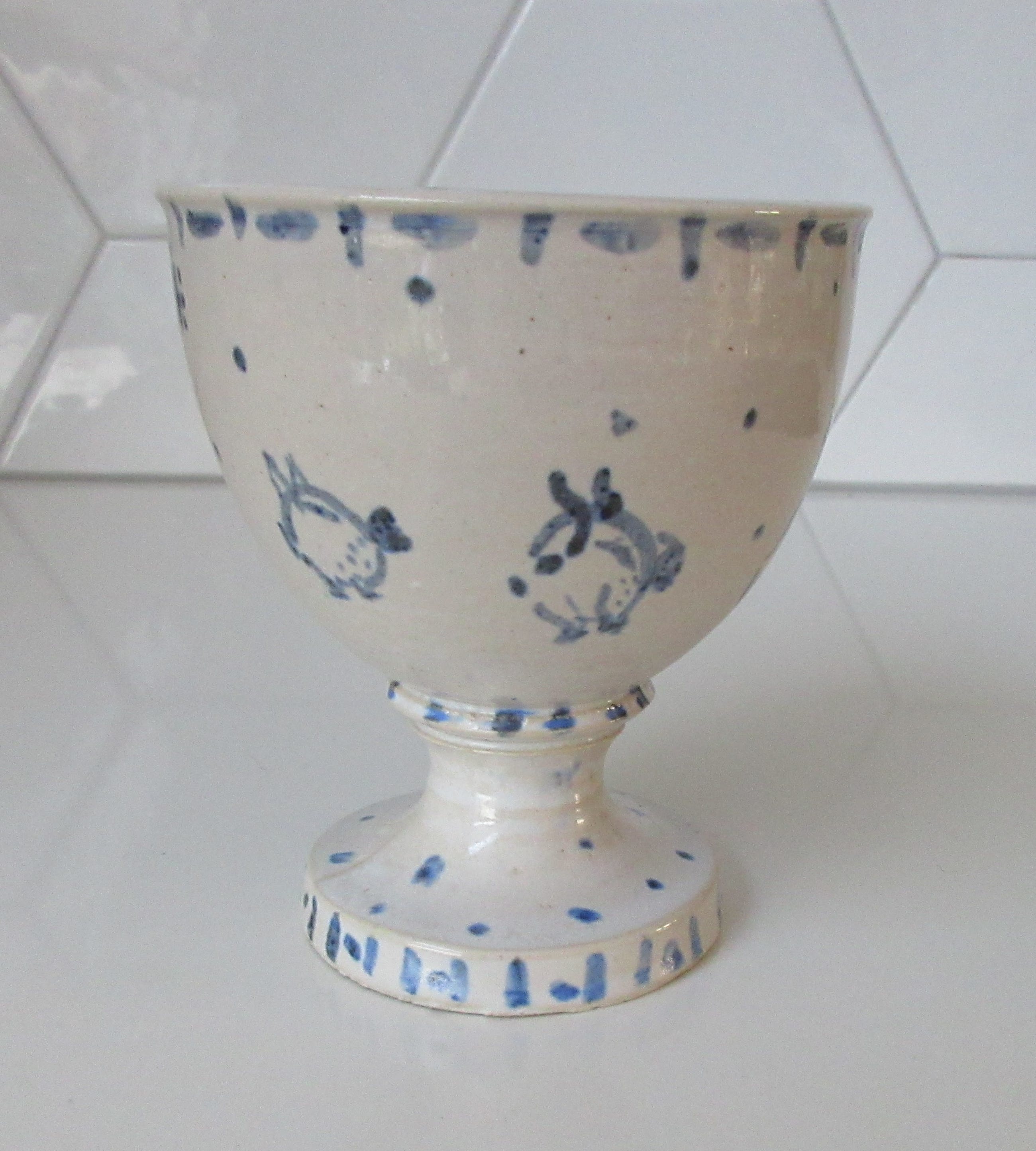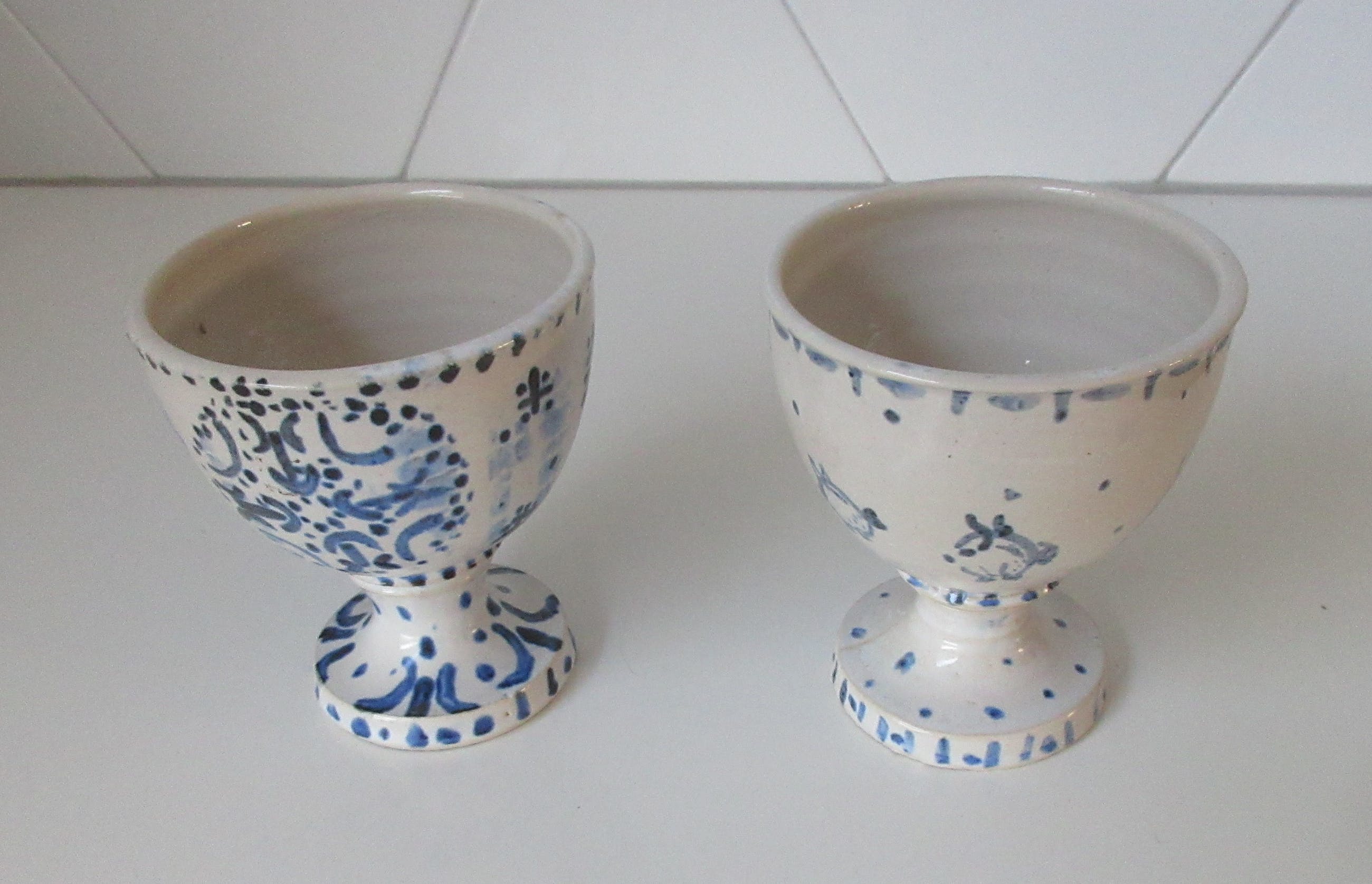Twee Studio Keramische blauw witte bokalen van Sjoerd Jonkers uit Amsterdam. De een is gedecoreerd met biggetjes en de ander heeft een fantasie decoratie. Aan de onderzijde met de hand gesigneerd en gedateerd.