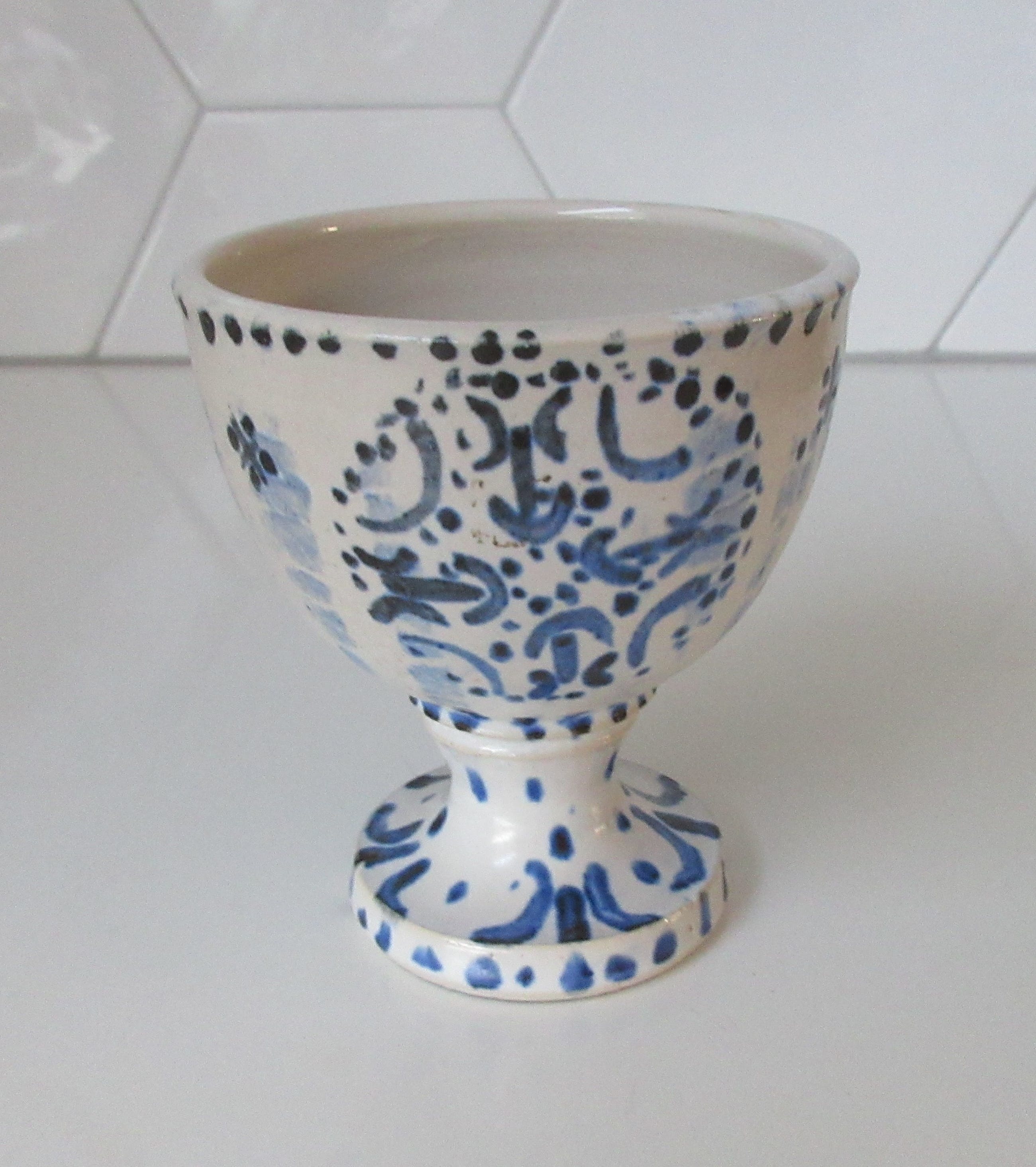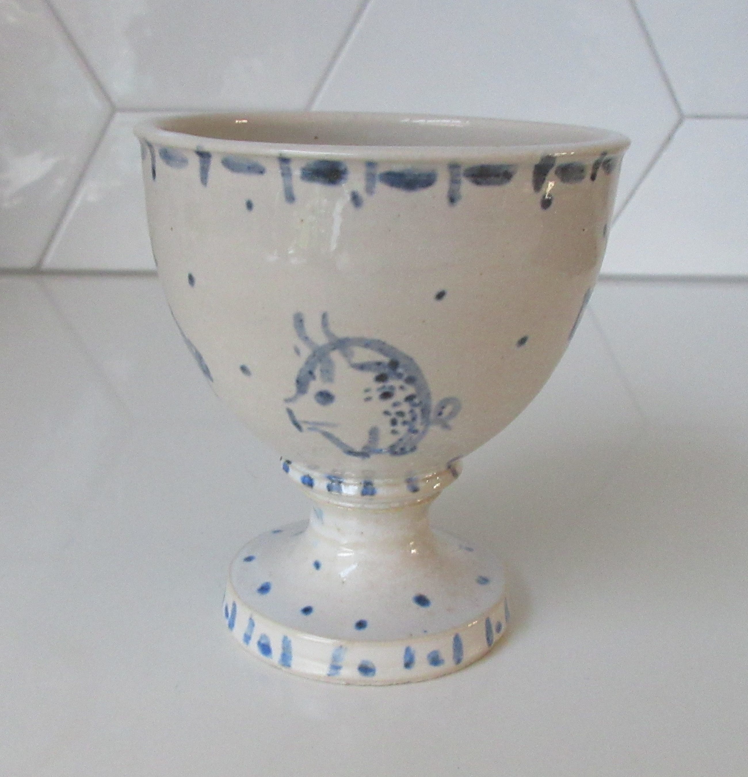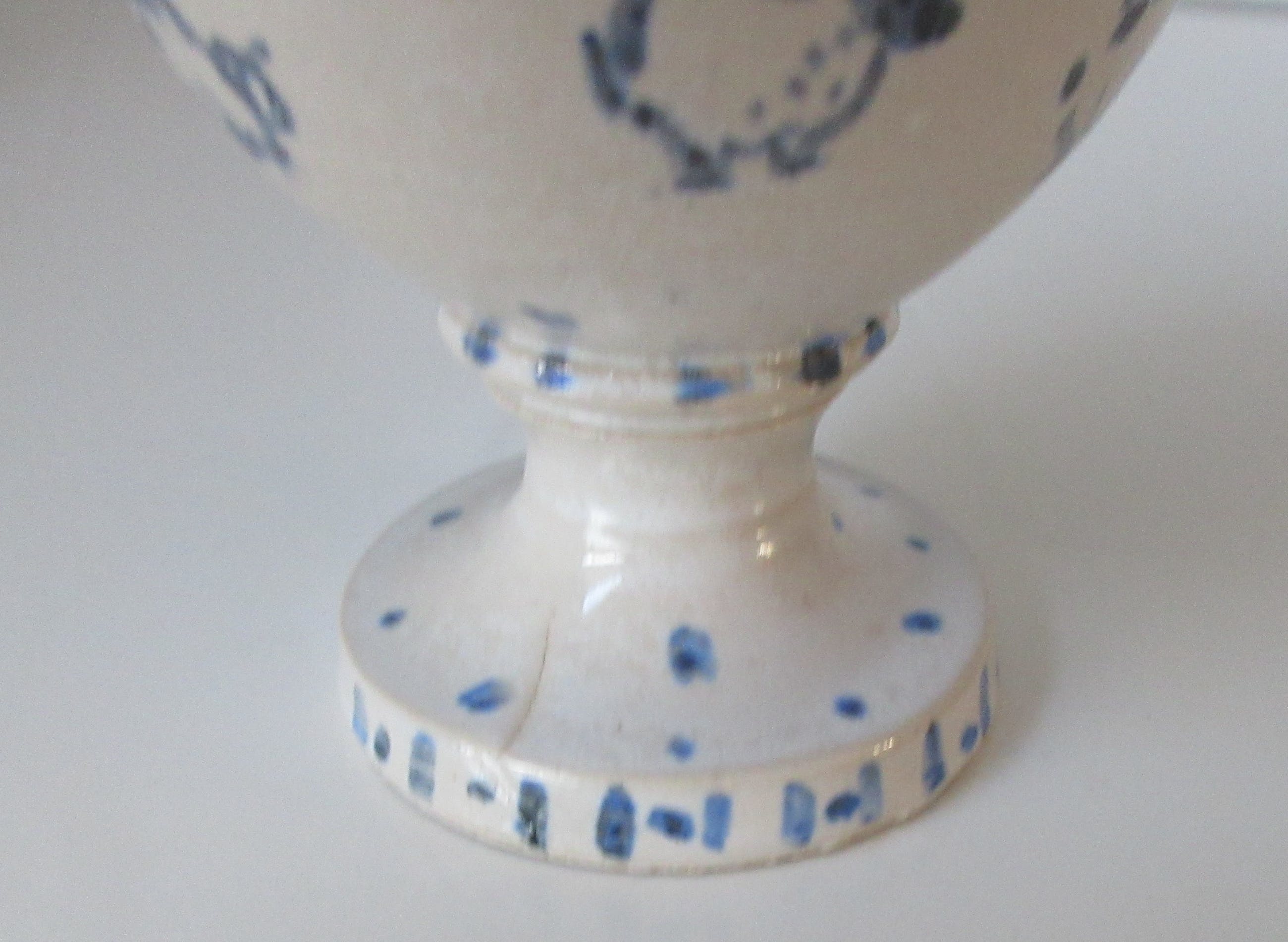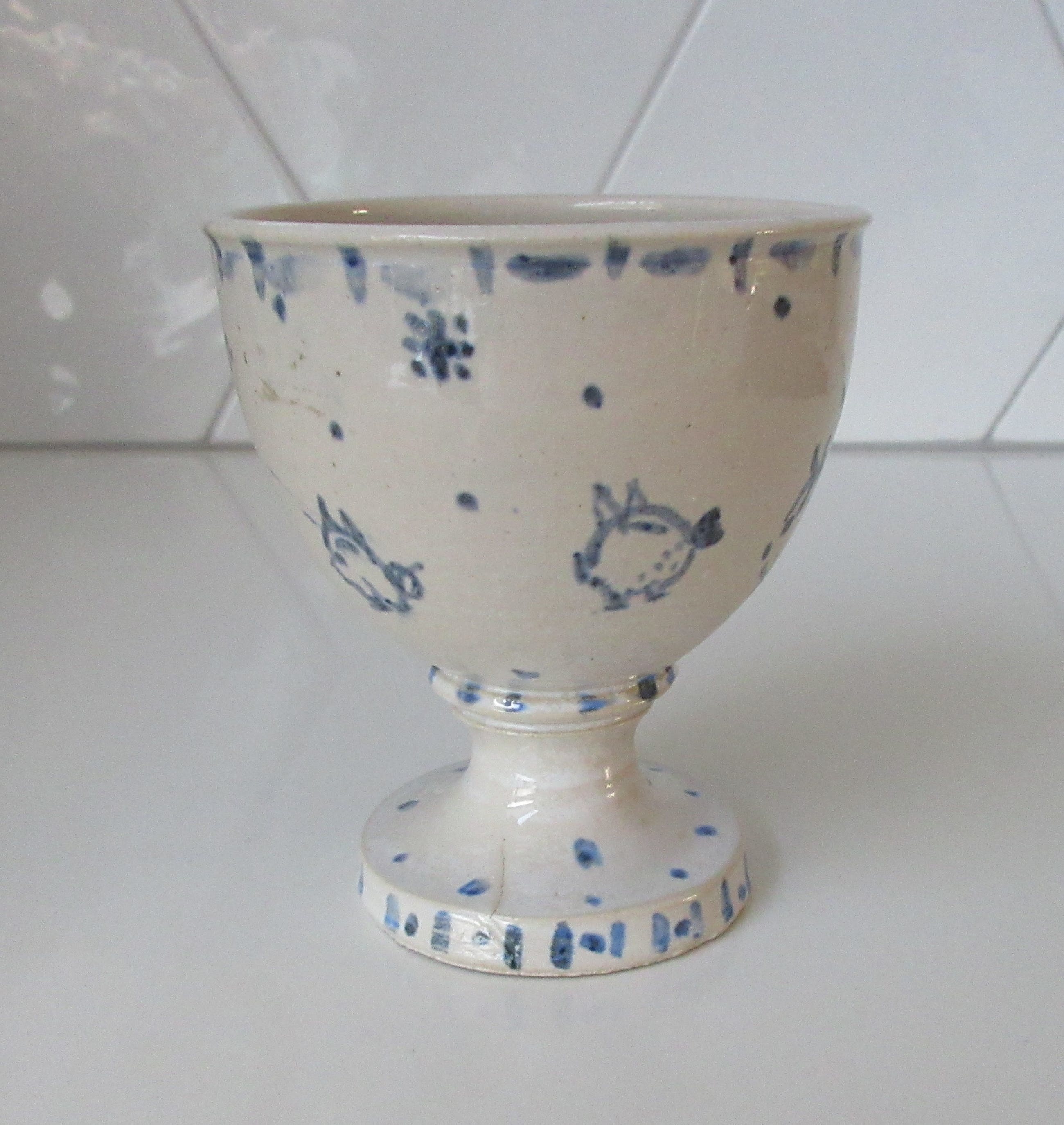 Twee Studio Keramische blauw witte bokalen van Sjoerd Jonkers uit Amsterdam. De een is gedecoreerd met biggetjes en de ander heeft een fantasie decoratie. Aan de onderzijde met de hand gesigneerd en gedateerd.