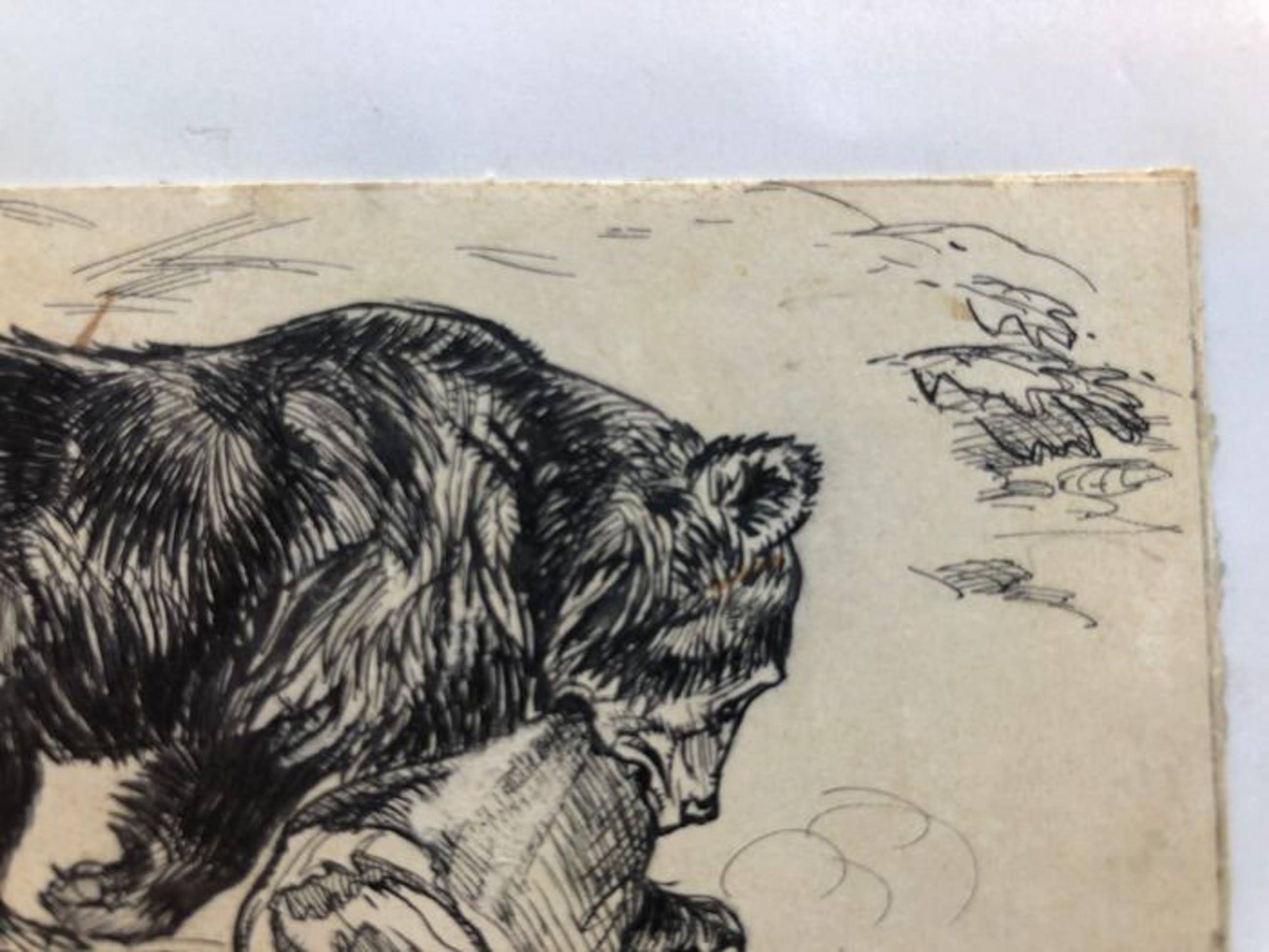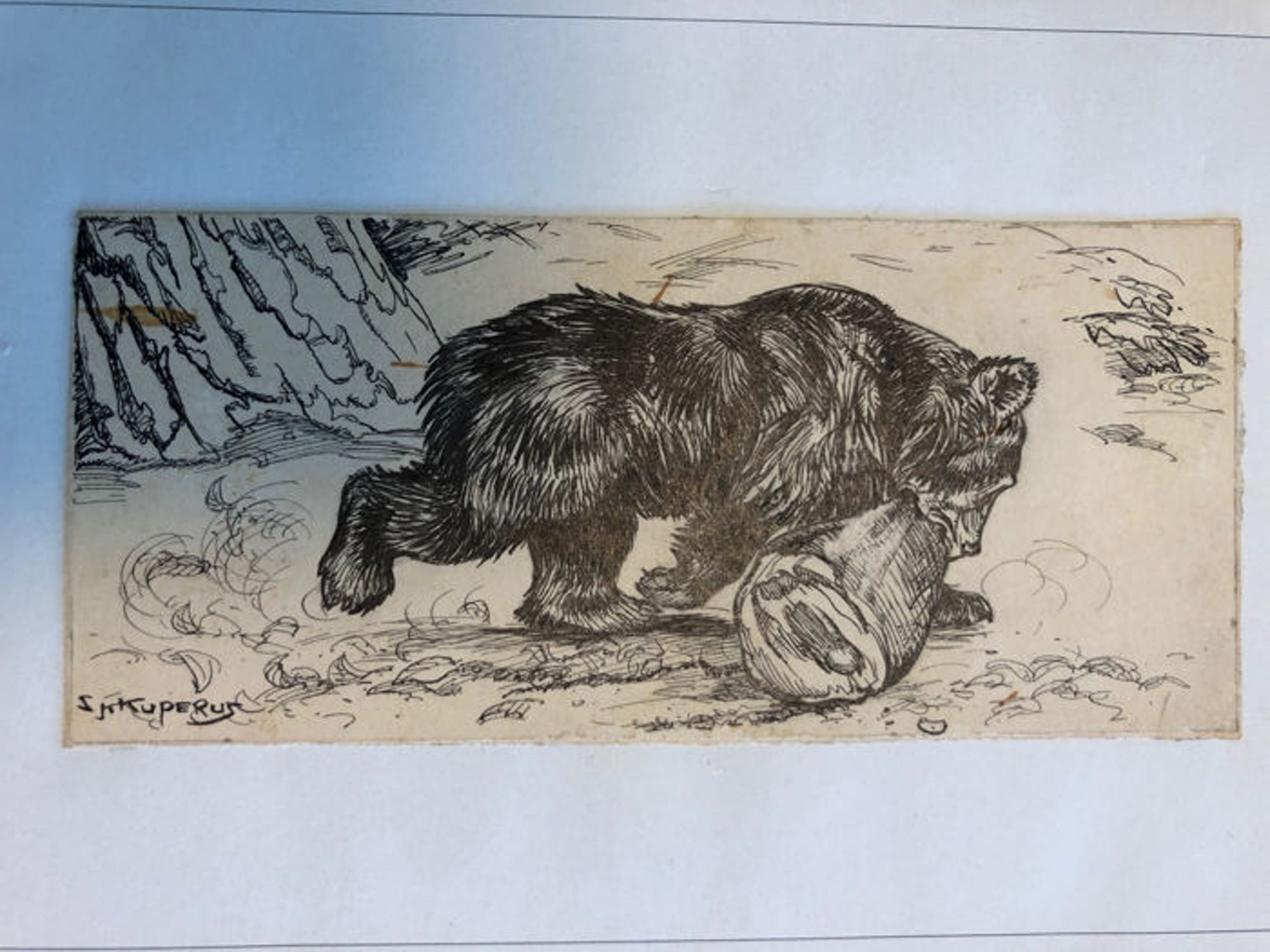 Mooie tekening van de bekende kunstenaar Sjoerd Kuperus: beer die voedsel meesleept. Gesigneerd linksonder. Beeldmaat: 6 x 13,5 cm. Het tekeningetje verkeert in nette conditie en heeft enkele bruine vlekjes (zie foto's). Netjes gelijst in wit lijstje van Nielsen.