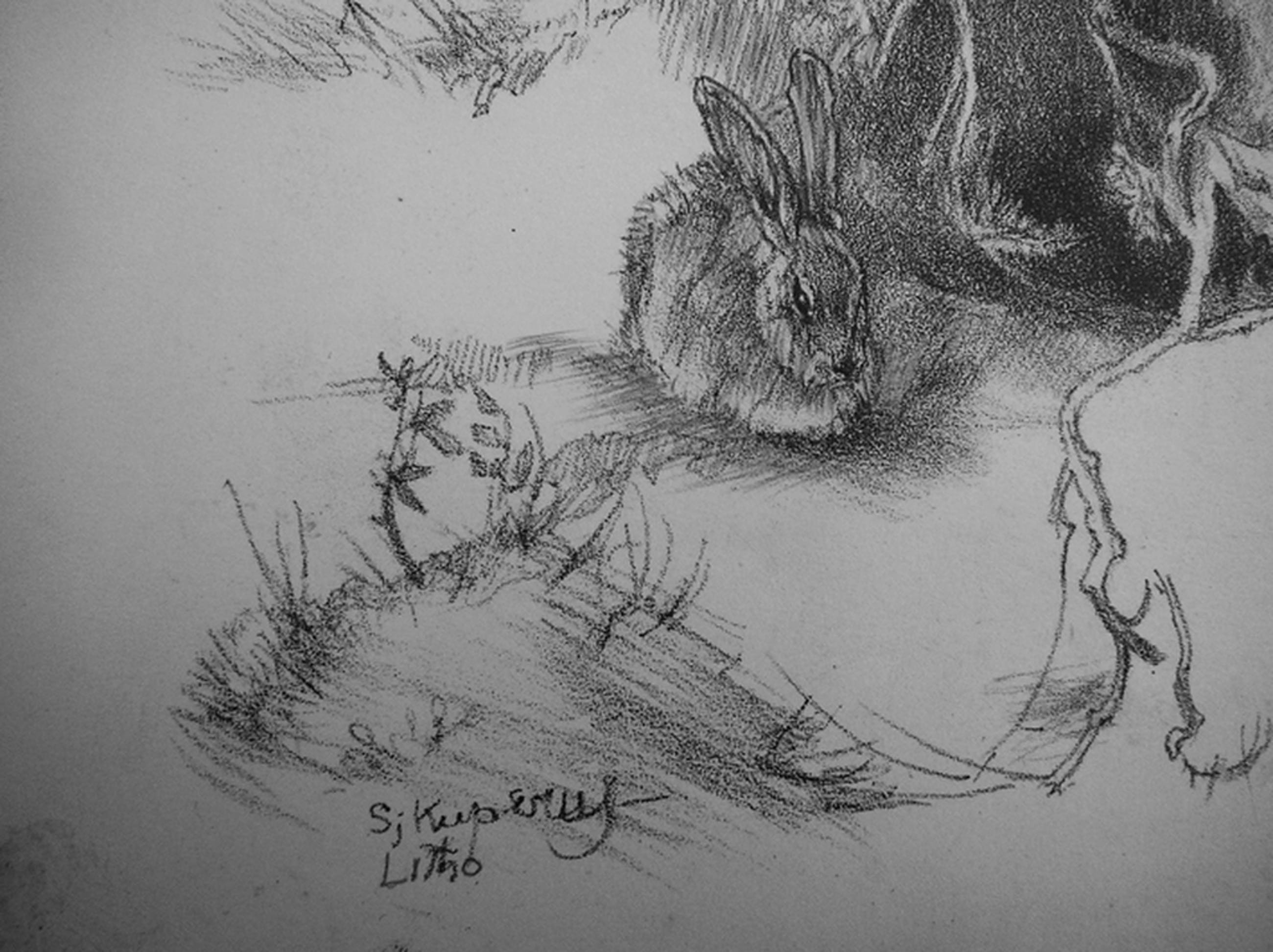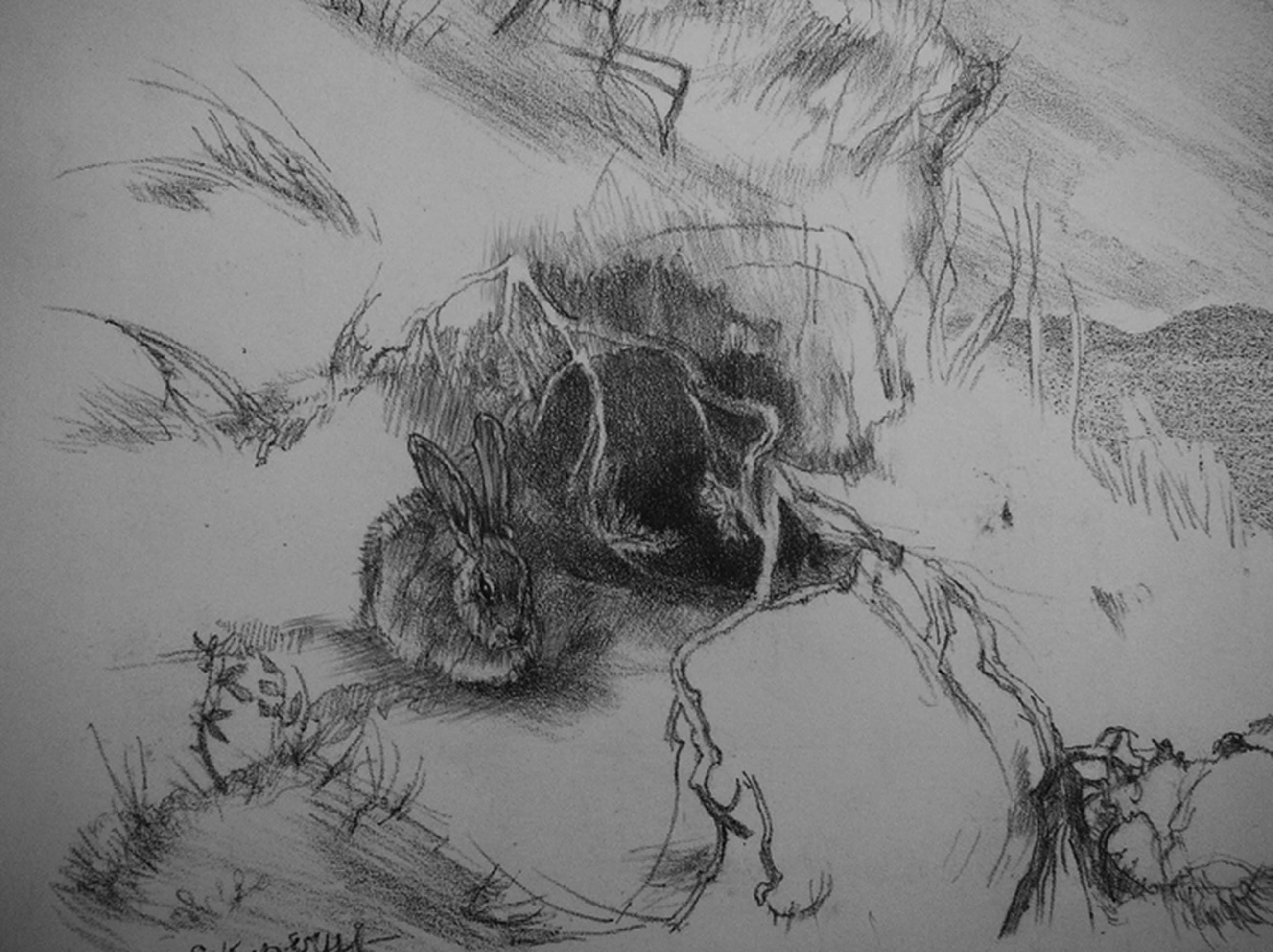 Karakteristiek werk van Sjoerd Kuperus, gedateerd circa 1950, op zwaar papier voorstellende een duinlandschap met een haas en hol.