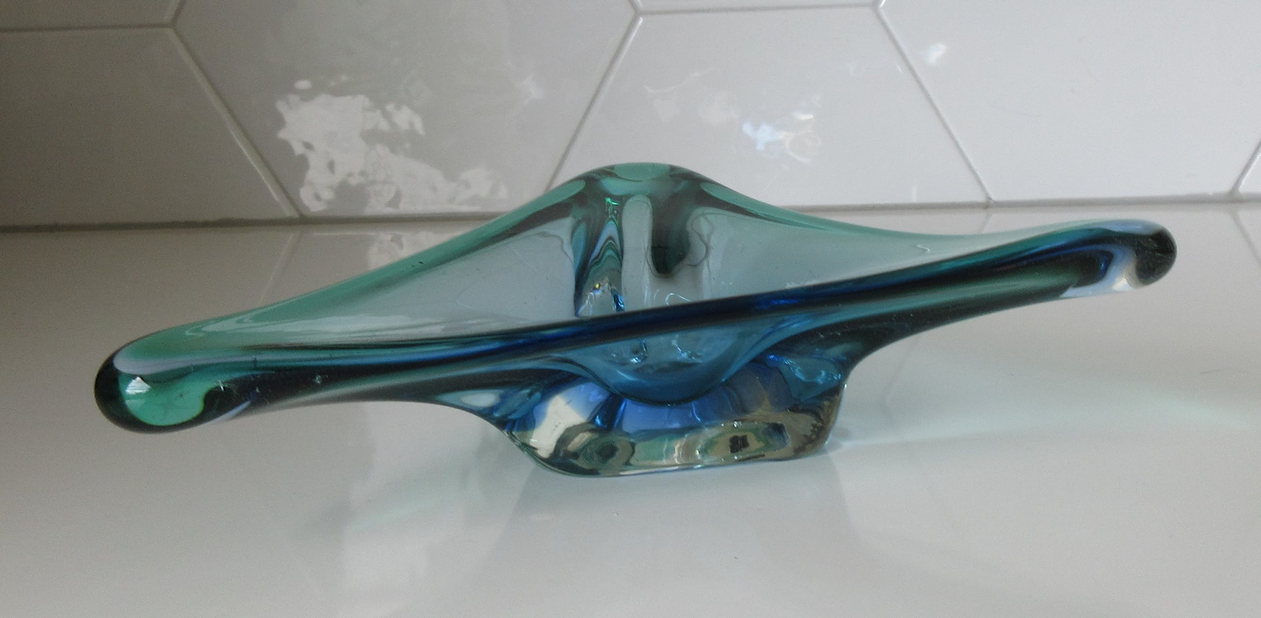 + Onbekende dikwandige driehoekige blauw - groene vrij gevormde glazen schaal. Ontwerper onbekend, mogelijk Josef Chribska. Afmetingen; 5 cm hoog, 21,5 cm breed en 19 cm diep.
