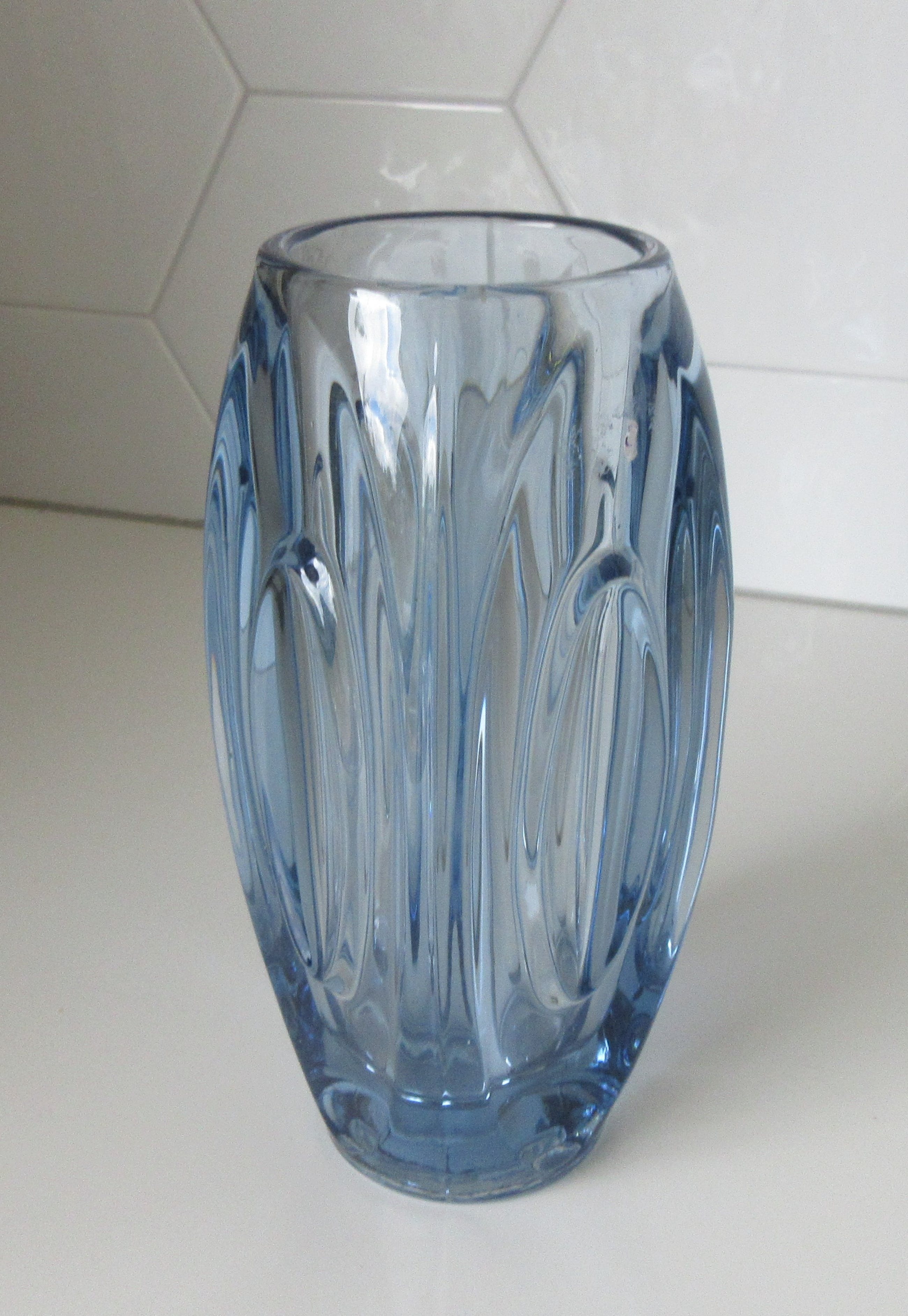 Nog een iconische lichte blauwe persglazen vaas model of patroonnummer 20036 ontworpen door Vaclav Hanus voor Hermanova Hut in 1963. In zeer goede gebruikte conditie. Niet gemerkt. Afmetingen; 19,5 cm hoog en 15 cm in diameter.