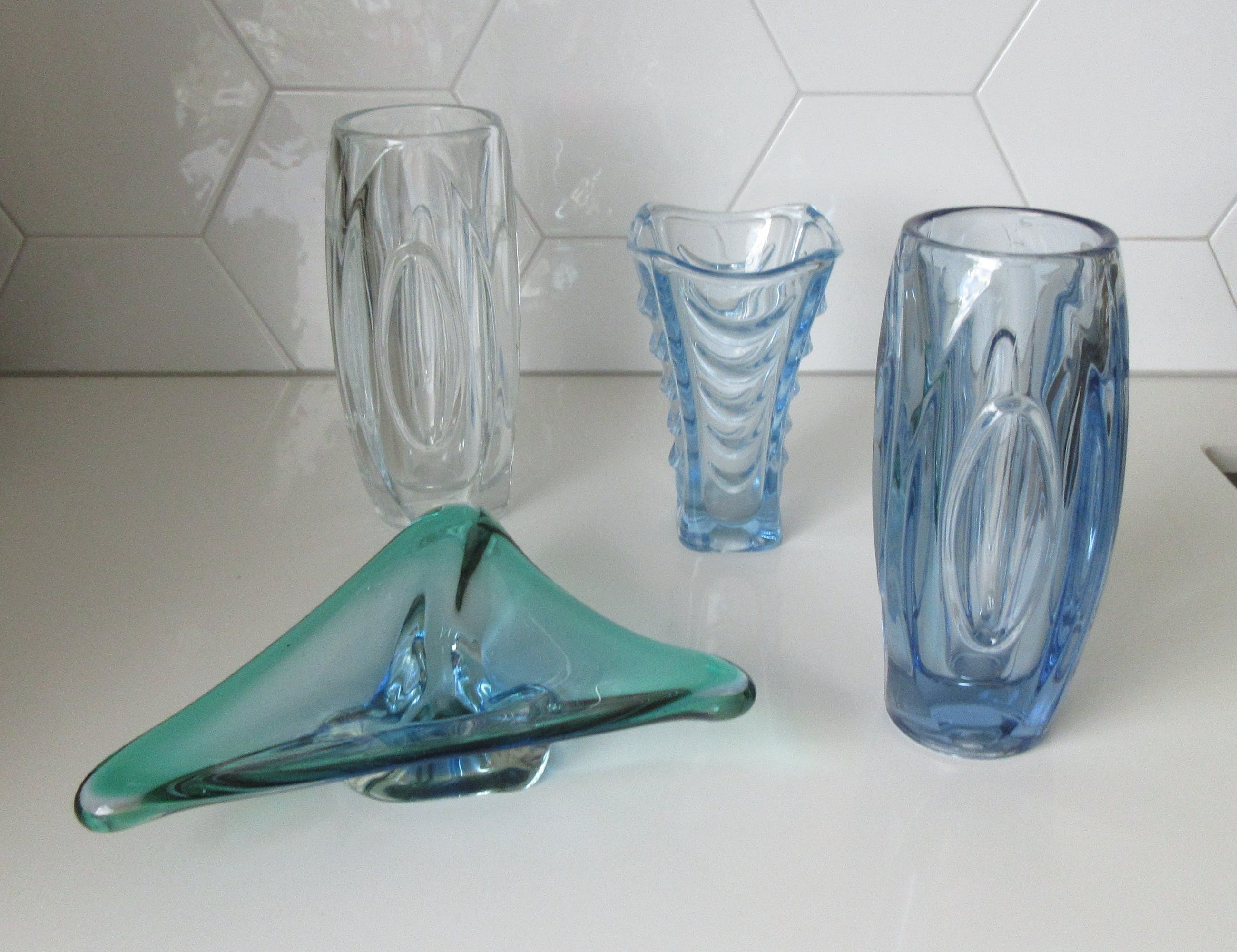 Iconische grote blank en blauwe glazen 'Bullet' of Lensvazen ontworpen door Rudolf Schrotter in 1955 voor Sklo Union (Rosice Glassworks). In goede gebruikte conditie, blanke heeft lichte aanslag. Afmetingen; 20 cm hoog, 8 cm in diameter.