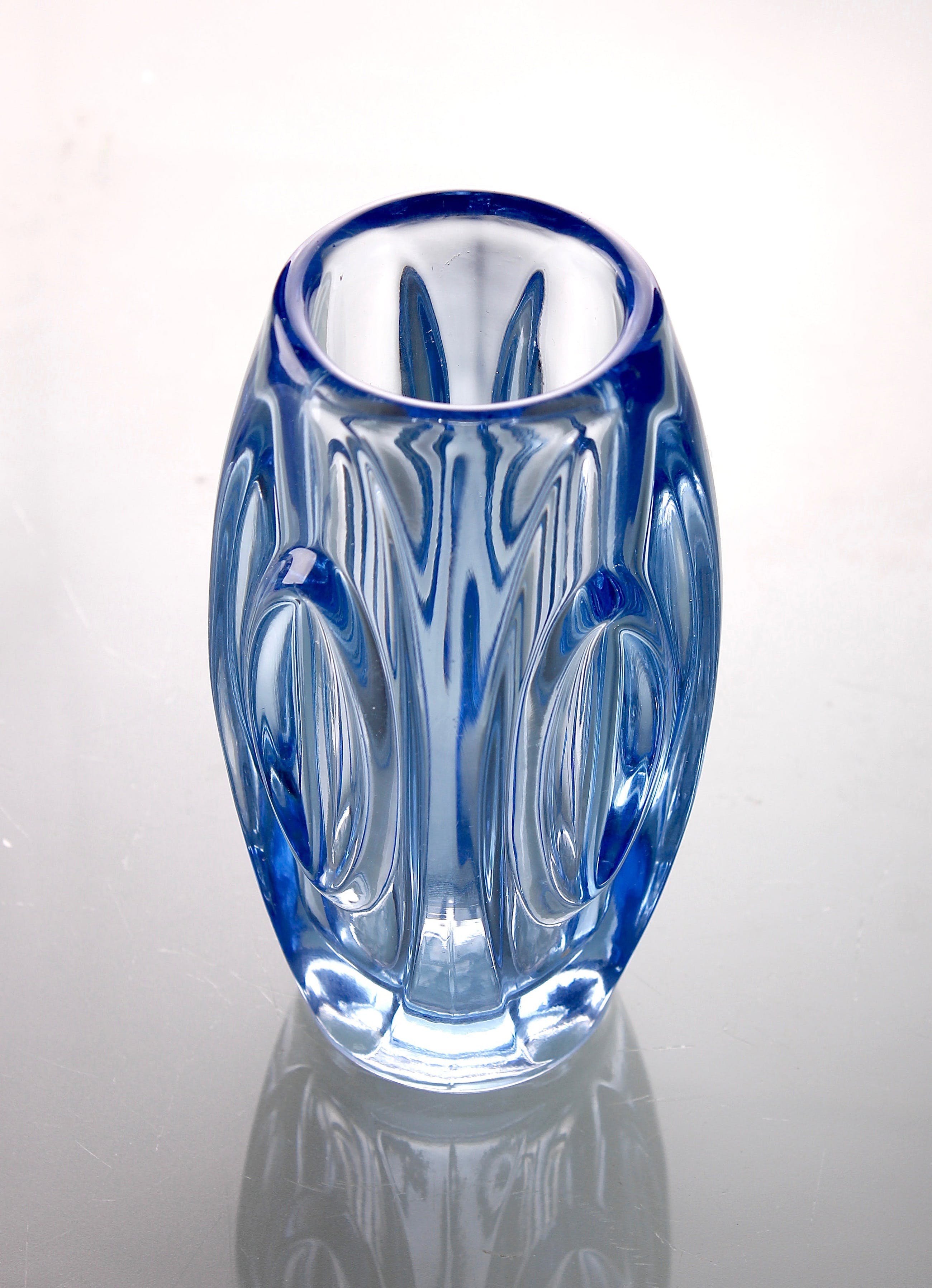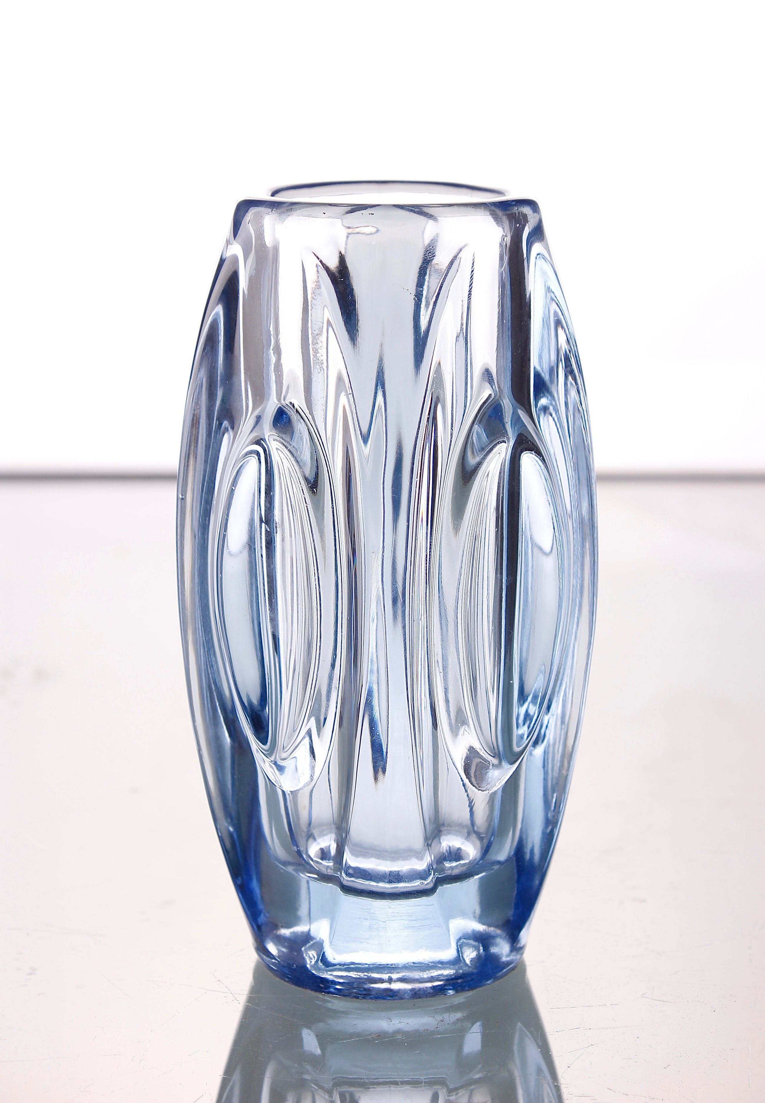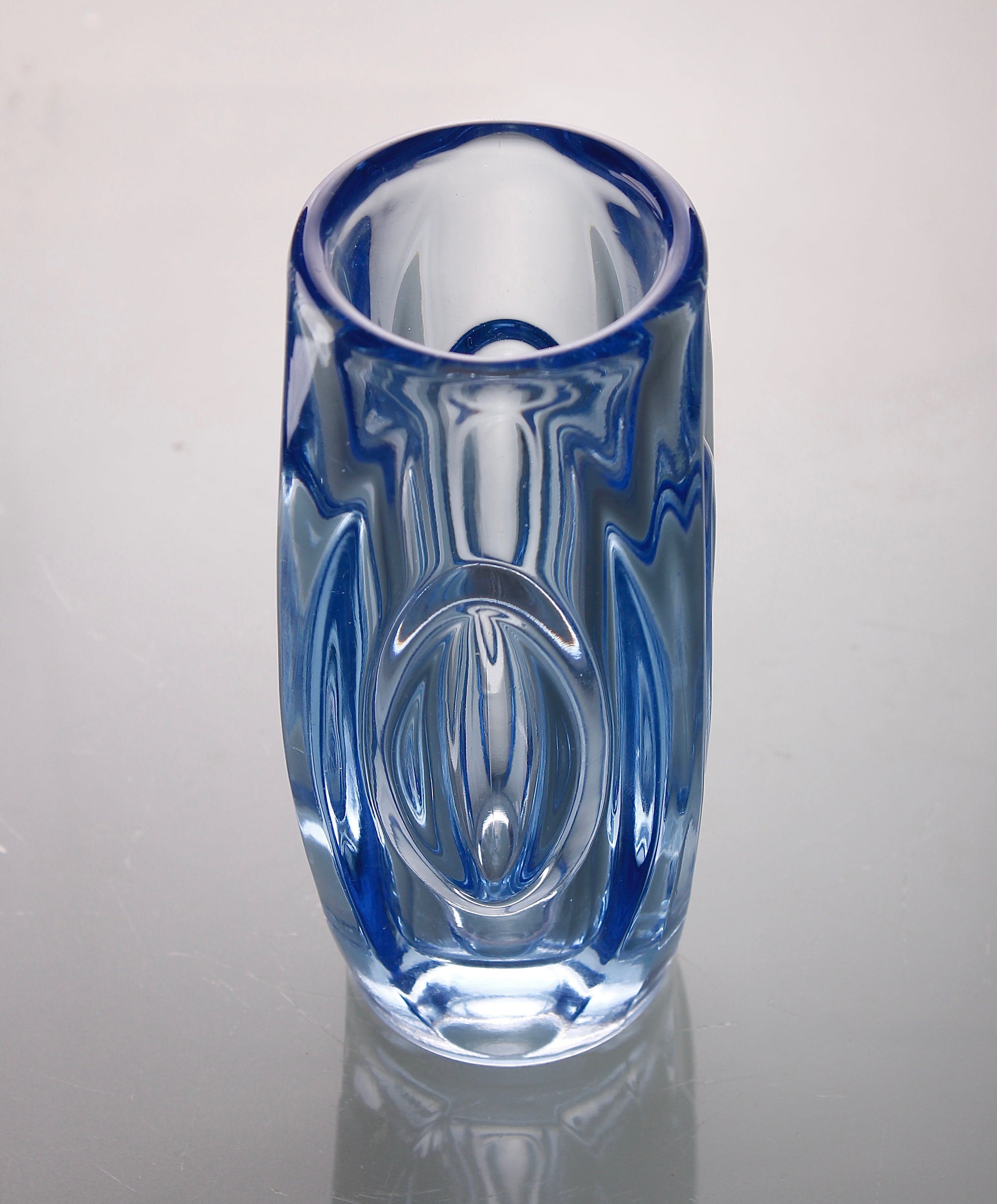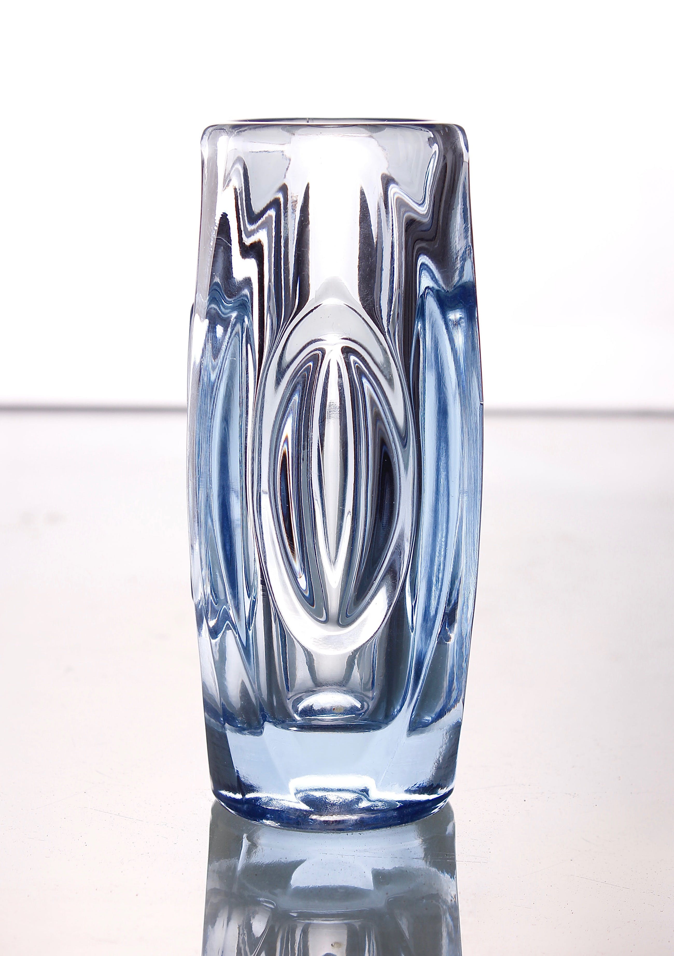 Fraaie lens vaas cq 'Bullet' vaas ontworpen door Rudolf Schrötter in 1955 (patentnr. 914) voor Sklo Union.Wordt vermeld in het Mark Hill boek op blz. 128: Czech glass Design. De vaas is inmiddels meer dan 60 jaar oud en nog steeds vooruitstrevend te noemen door m.n. de optische effecten van de vaas.