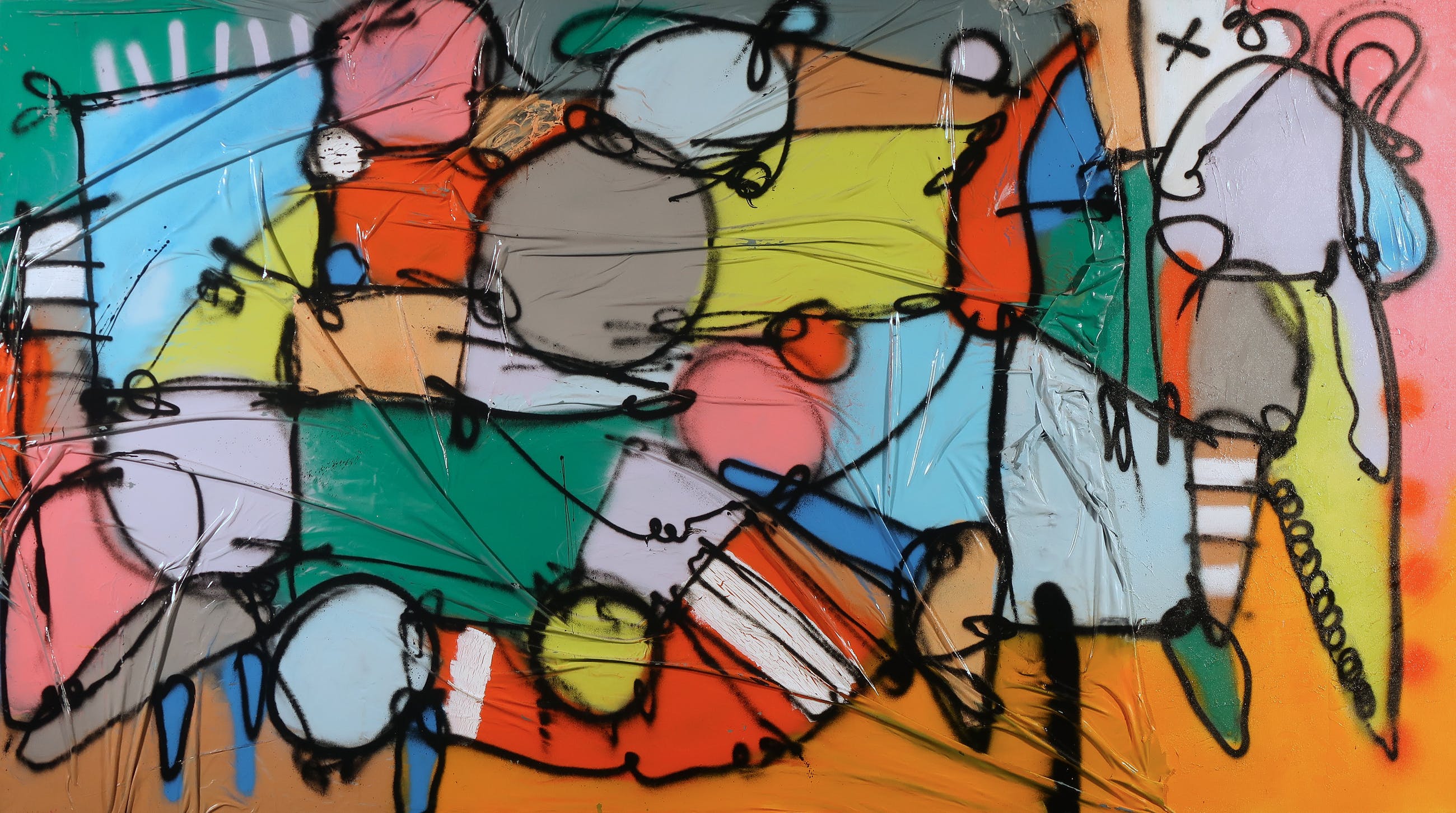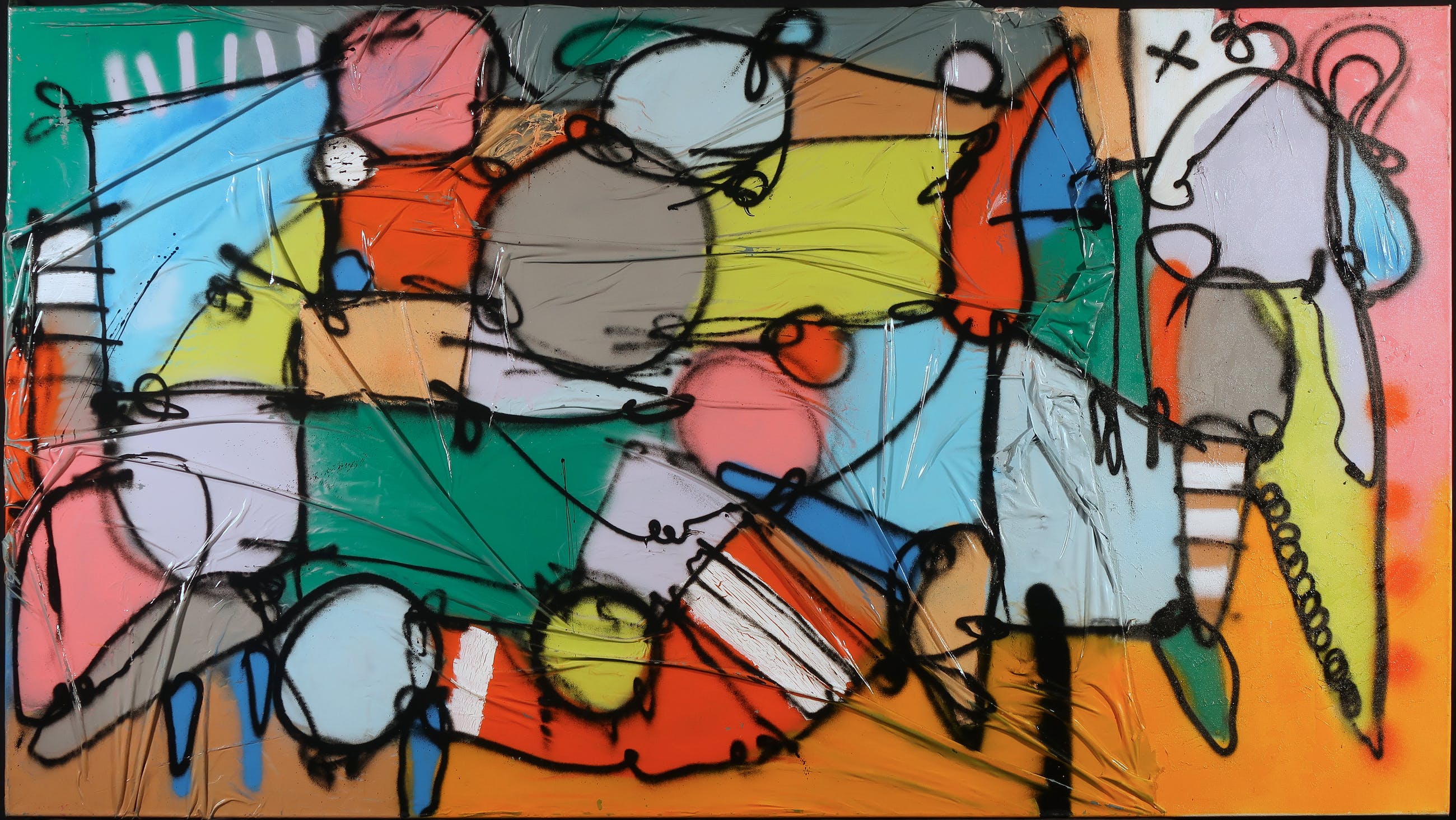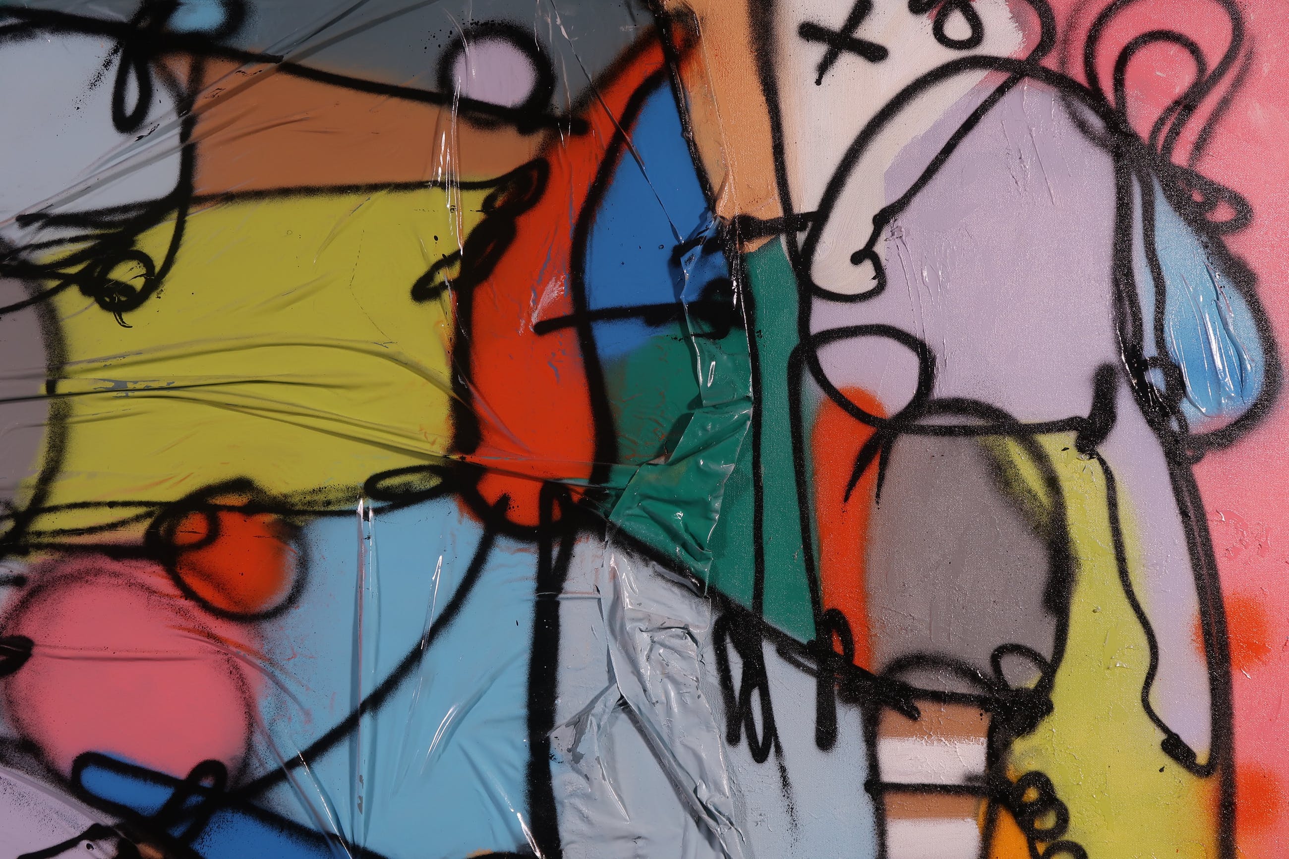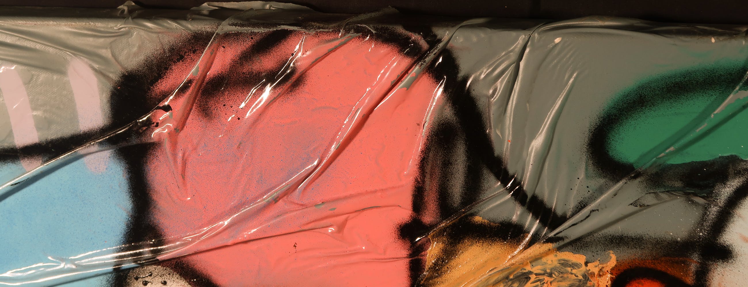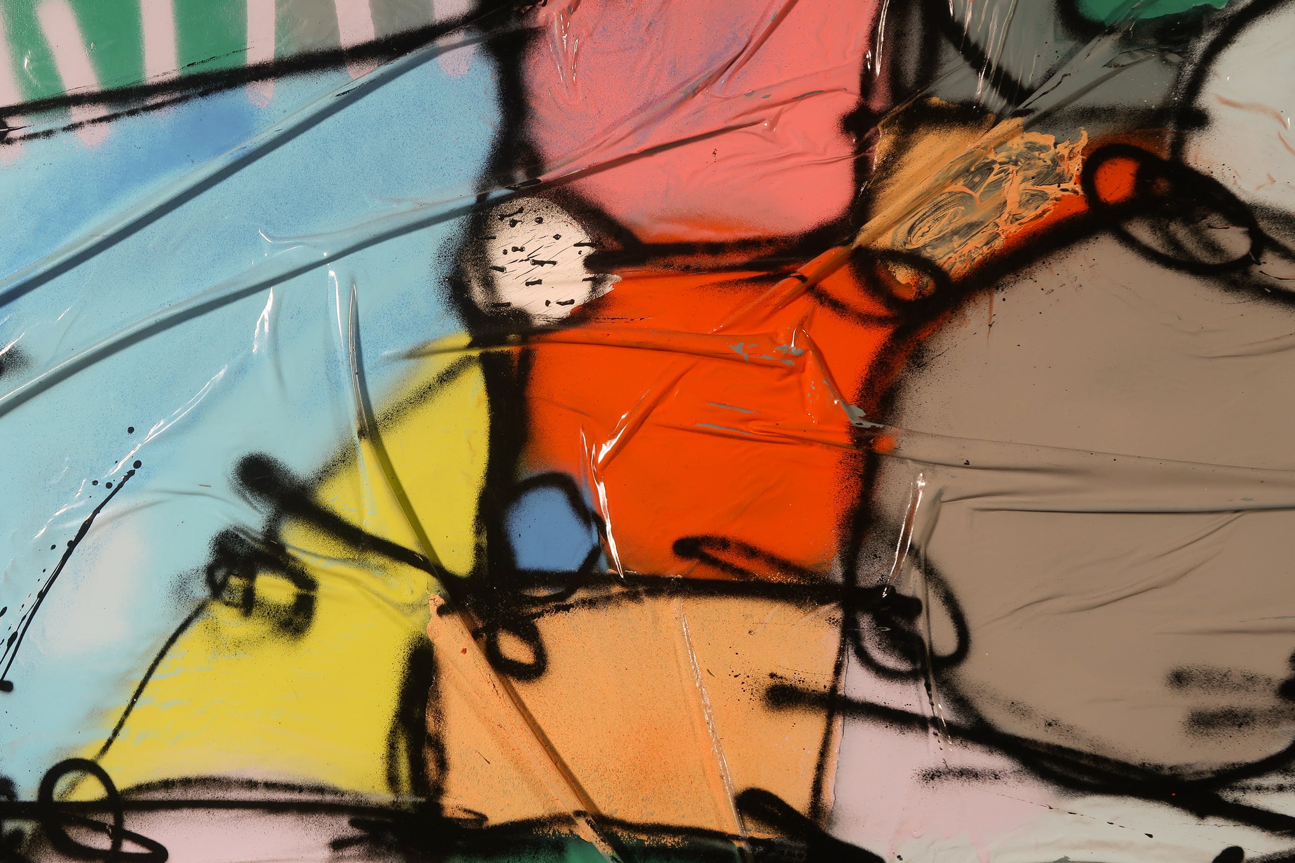 Gemengde techniek: o.a. collage van kunststof, spuitbus en acryl