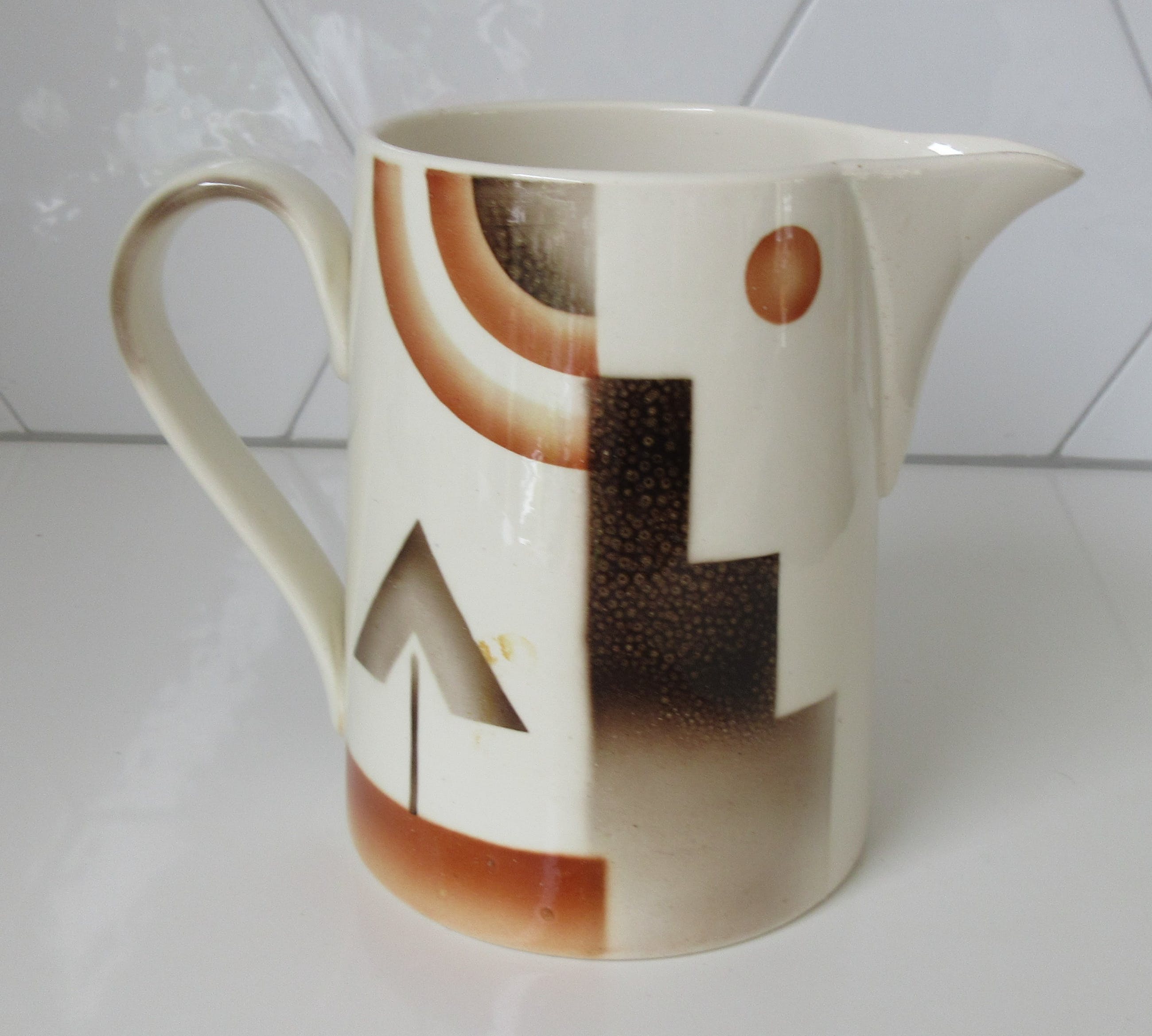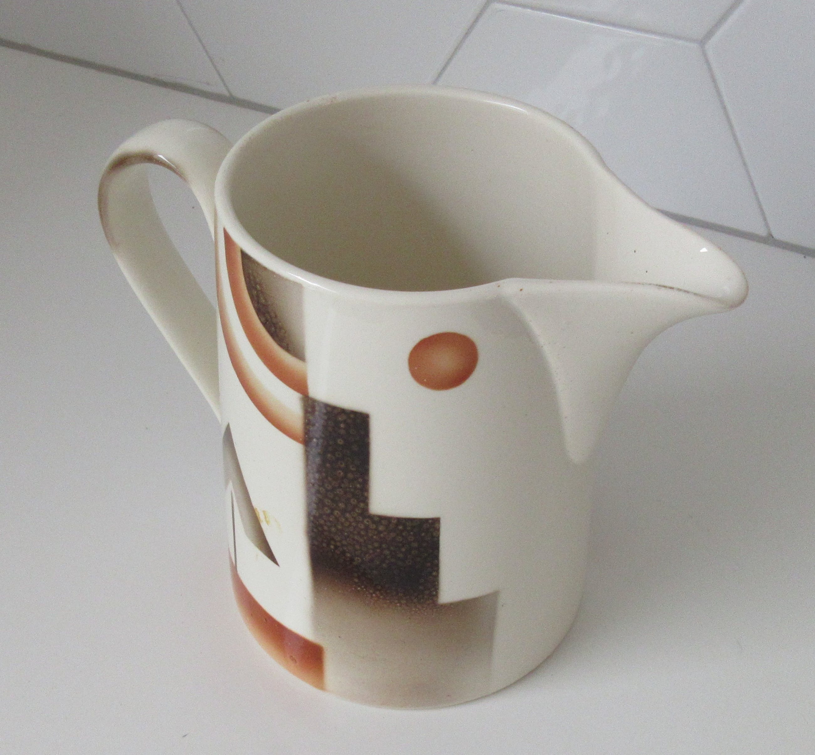 Art deco Melkkan met decor SB 126 N van de Societe Ceramique uit Maastricht. In zeer goede gebruikte conditie, voorzien van blindmerk en ingedrukte model en decornrs aan de onderzijde.